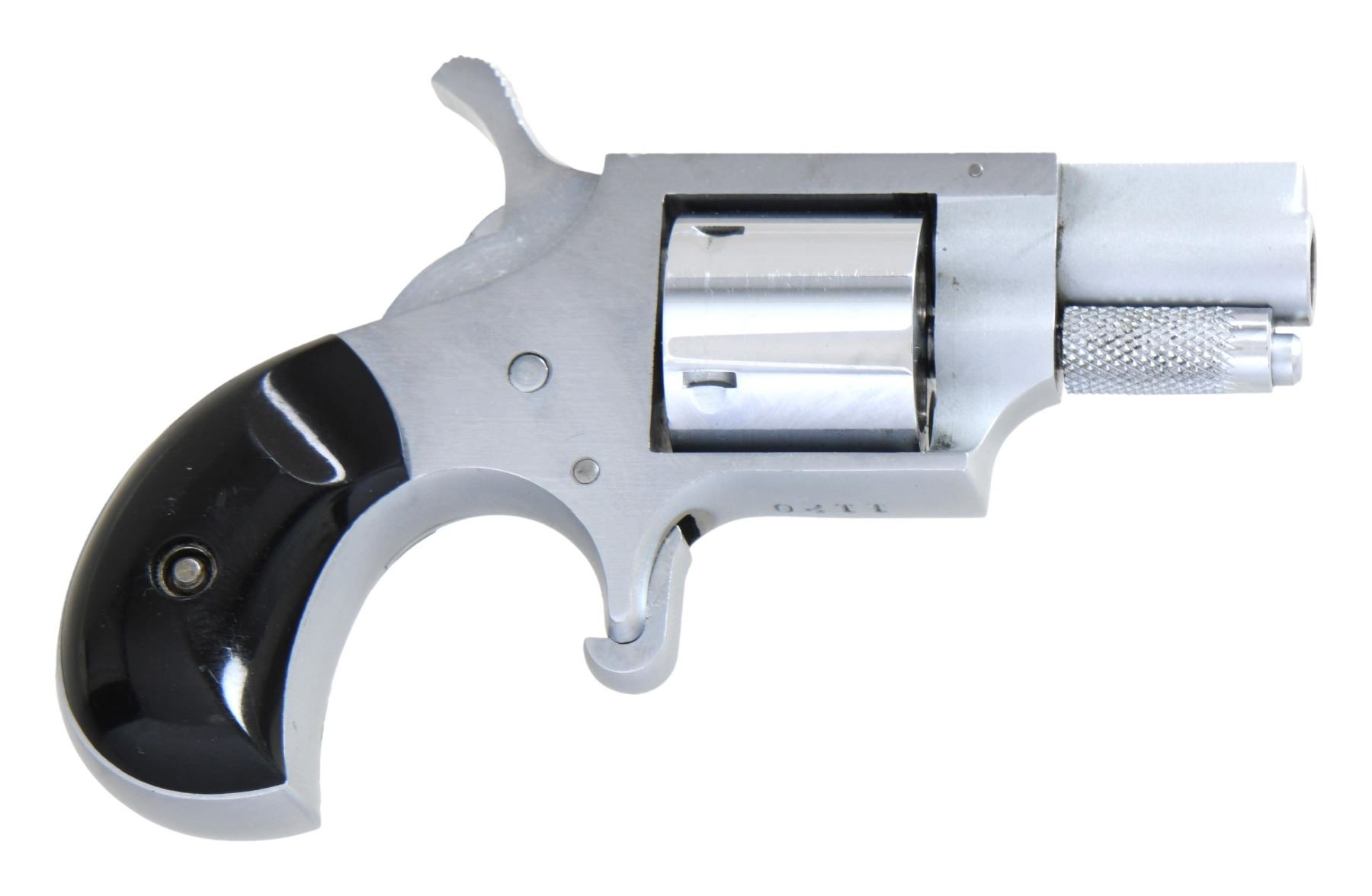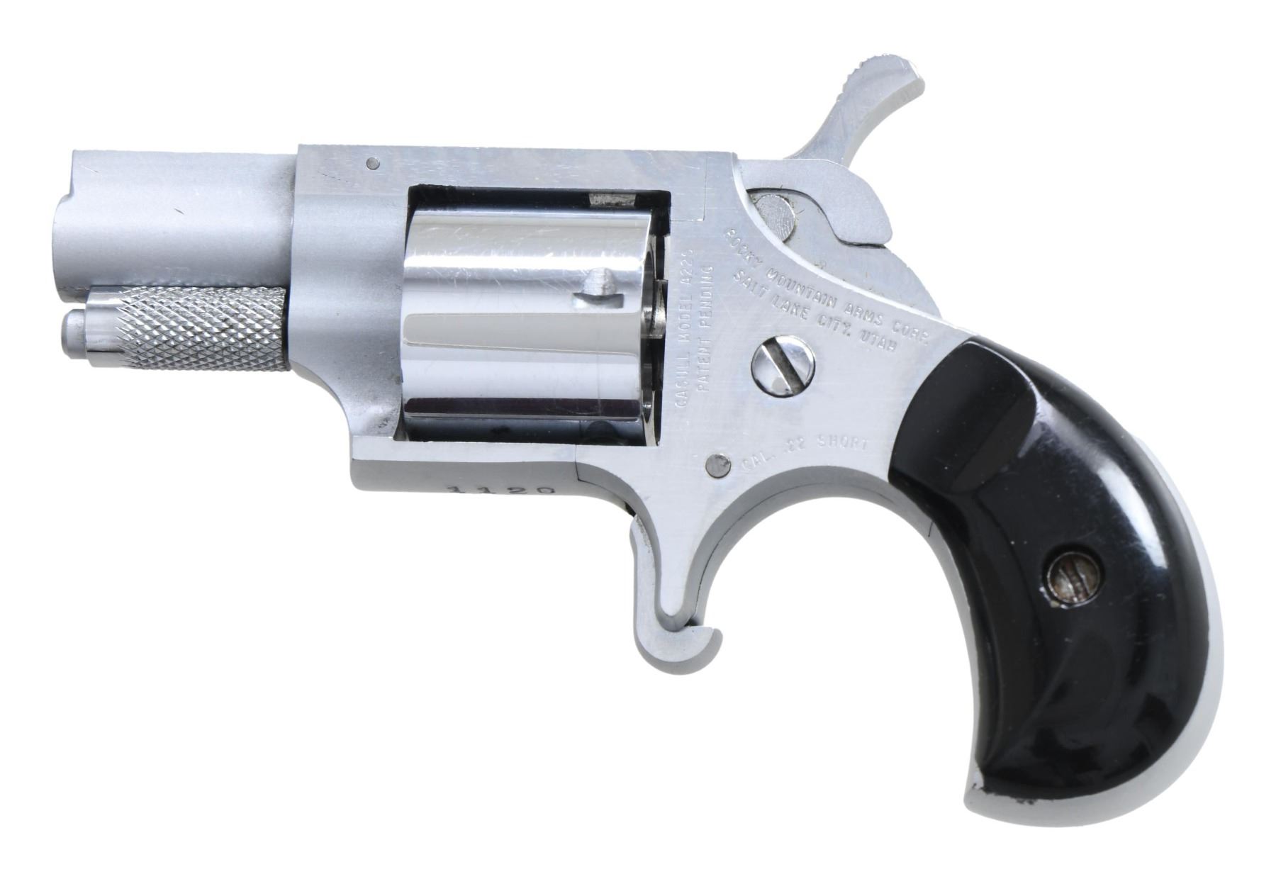 REVOLVER. Cal. 22 Short. S# 1120. Consignor states that there were only a few of these revolvers produced in a chrome finish early in production, after which they were mfg. in the more common stainless finish. The original Mini Revolver developed by the famous American gunsmith, Richard "Dick" Casull. Rocky Mountain Arms was found in 1972 & licensed the Mini revolver design to mfg. in Salt Lake City, Utah, In 1974, the company was rename the North American Manufacturing & eventually became North American Arms. Bbl. 1 1/8". Chrome plated finish. 5 Shot cyl. Lever on top strap acts as cyl. stop. Two piece black grips. CONDITION: appears near excellent overall. (25-4003/MD). CURIO. $350-550.
