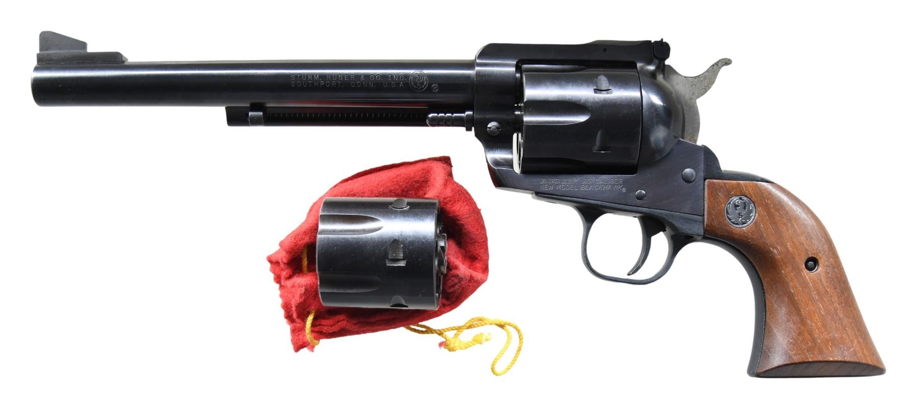 Cal. 45 Colt / 45 ACP. S# 46-11189. Bbl. 7 1/2" with serrated blade on ramped base front sight and frame mounted factory adjustable rear. Mfg. 1975 (1973 to date) as BN-45X with matching numbered cylinder having firing pin groove as it was assembled using left over Old Model parts and thus per references is "extremely rare" as a convertible. Oiled walnut grips with blued bushings and silver eagle medallions. Captive collared base pin and alloy ejector housing. Barrel is without "warning marks" (initiated late 1977 to early 1978) having Southport address. UNATTACHED ACCESSORIES: matching like new 45 ACP cylinder with firing pin groove and red felt bag. CONDITION: couple of extremely faint marks on barrel near muzzle plus two very light marks on right grip; balance is near excellent with unfired appearance. (25-3249/NW). MODERN. $450-600.