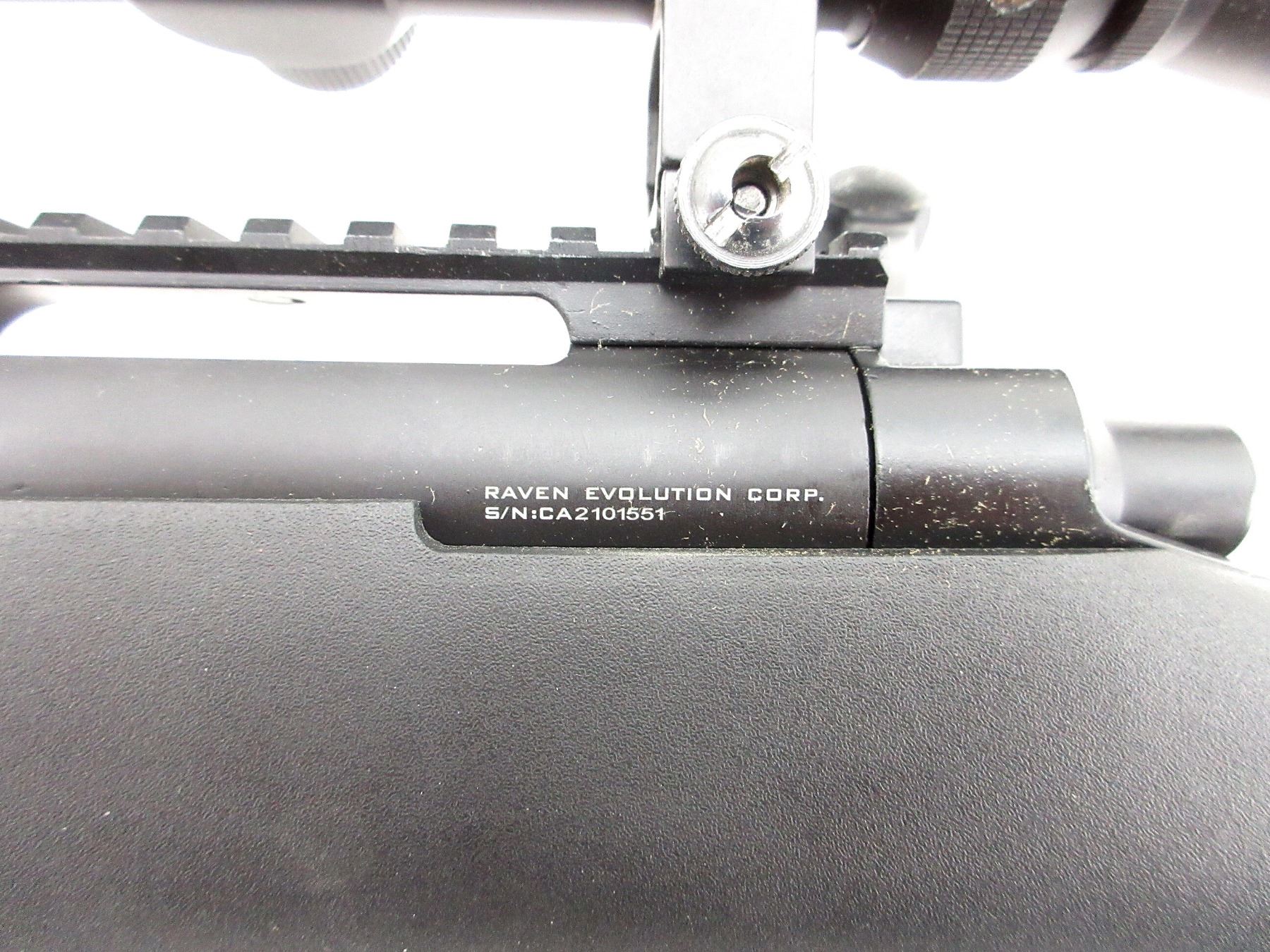 (1) 6MM BB, BOLT ACTION, MAG, POLYMER & ALLOY CONSTRUCTION, MARKED "RAVEN EVOLUTION", ETC., NO COCKING ISSUES, NOT FULLY TESTED, SHOWS SOME WEAR / TEAR, WITH UNKNOWN 3-9X40MM SCOPE, CLEAR OPTICS, DUPLEX CROSSHAIR, MISSING ELEVATION CAP, ATTACHED ADJUSTABLE FOLDING BIPOD. SEE PHOTOS.