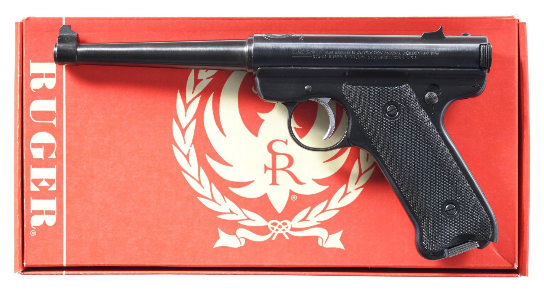 PISTOL WITH MATCHING NUMBERED BOX & SHIPPING BOX. Cal. 22 LR. S# 15-46802 (1979). No. 1540 with engraved RCA emblem on top of pistol. This Ruger Standard Model features a blued finish. The barrel length is 6 inches. It has fixed front and rear sights. The frame includes a left-side safety. The grips are checkered black plastic. MAGS: 1-10 Rds. UNATTACHED ACCESSORIES: Factory box, shipping box, & RCA card. CONDITION: Overall condition is very good with 95% of the original blued finish remaining on the slide and frame. The bore is bright with sharp rifling. MODERN (25-2007/MD) $250-400.