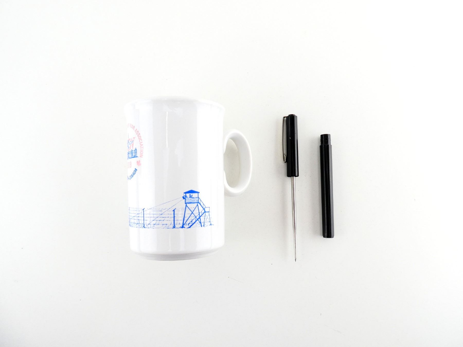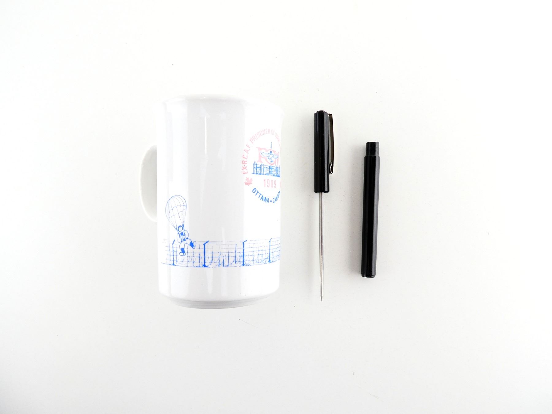 LOT INCLUDES; (1) RCAF POW 1989 REUNION MUG, MARKED: "EX-R.C.A.F. PRISONER OF WAR ASSOCIATION, 1989, OTTAWA-CANADA", BOTTOM MARKED: MADE IN ENGLAND, APPROX. 2.75" DIA., OVERALL LENGTH APPROX. 4.5" & (1) PICK SCREW DRIVER PEN, NO VISIBLE MARKINGS, BLACK POLYMER CASING, PICK OVERALL LENGTH APPROX. 3", WITH CAP ON OVERALL LENGTH APPROX. 5.5". SEE PHOTOS.