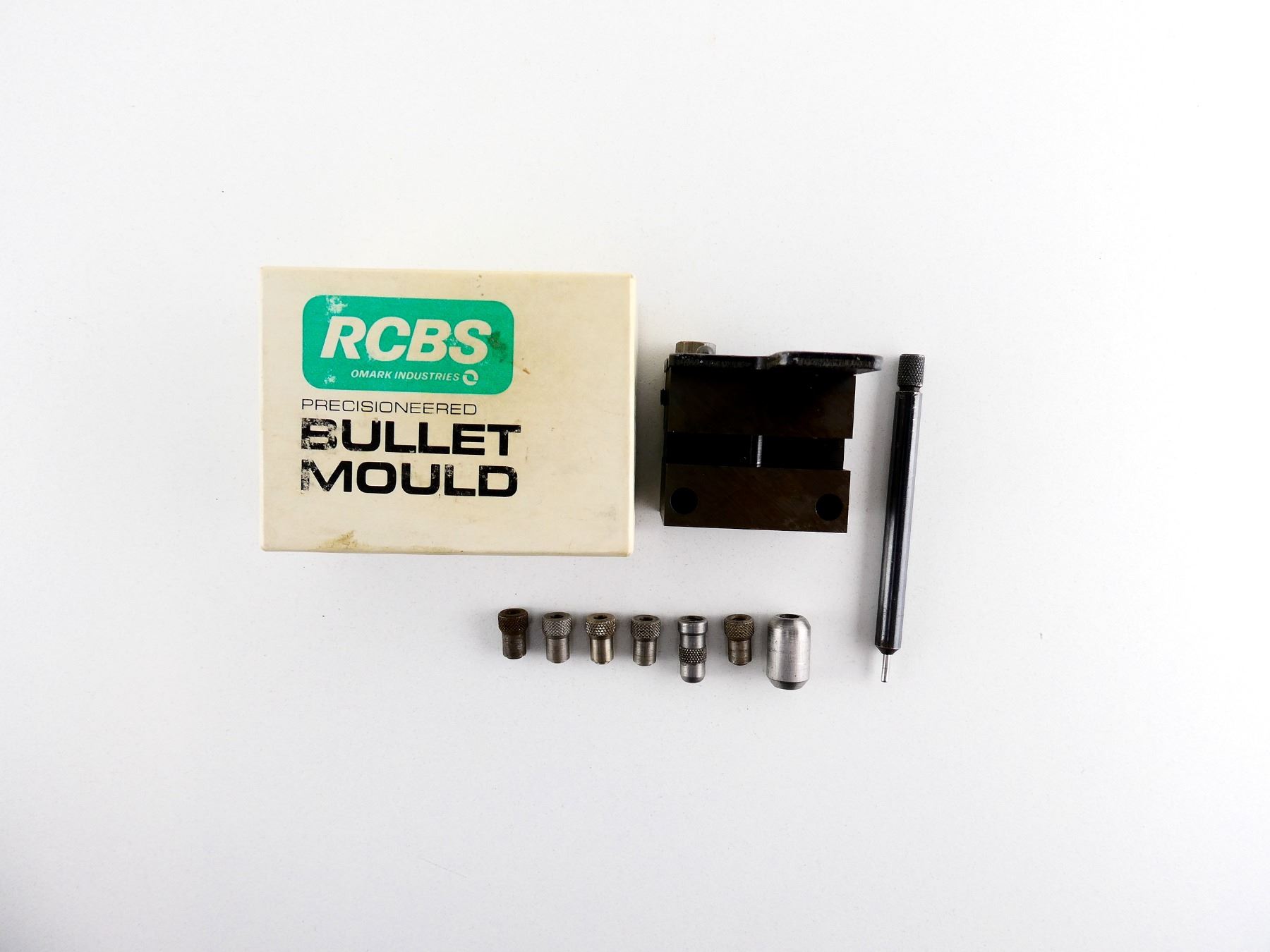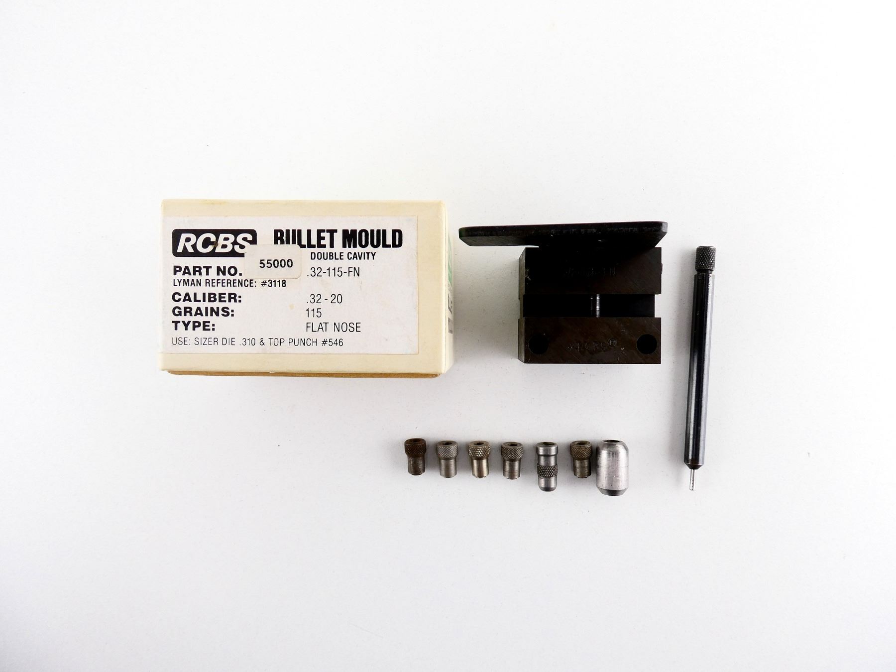 LOT INCLUDES; (1) RCBS .32-20 DOUBLE-CAVITY BULLET MOLD, MOLD MARKED: "32-115-FN, *RCBS R", WITH ORIGINAL PACKAGING, (2) EXPANDER BUTTONS, (5) DECAPPING PIN HOLDERS & (1) DECAPPING ROD. SEE PHOTOS.