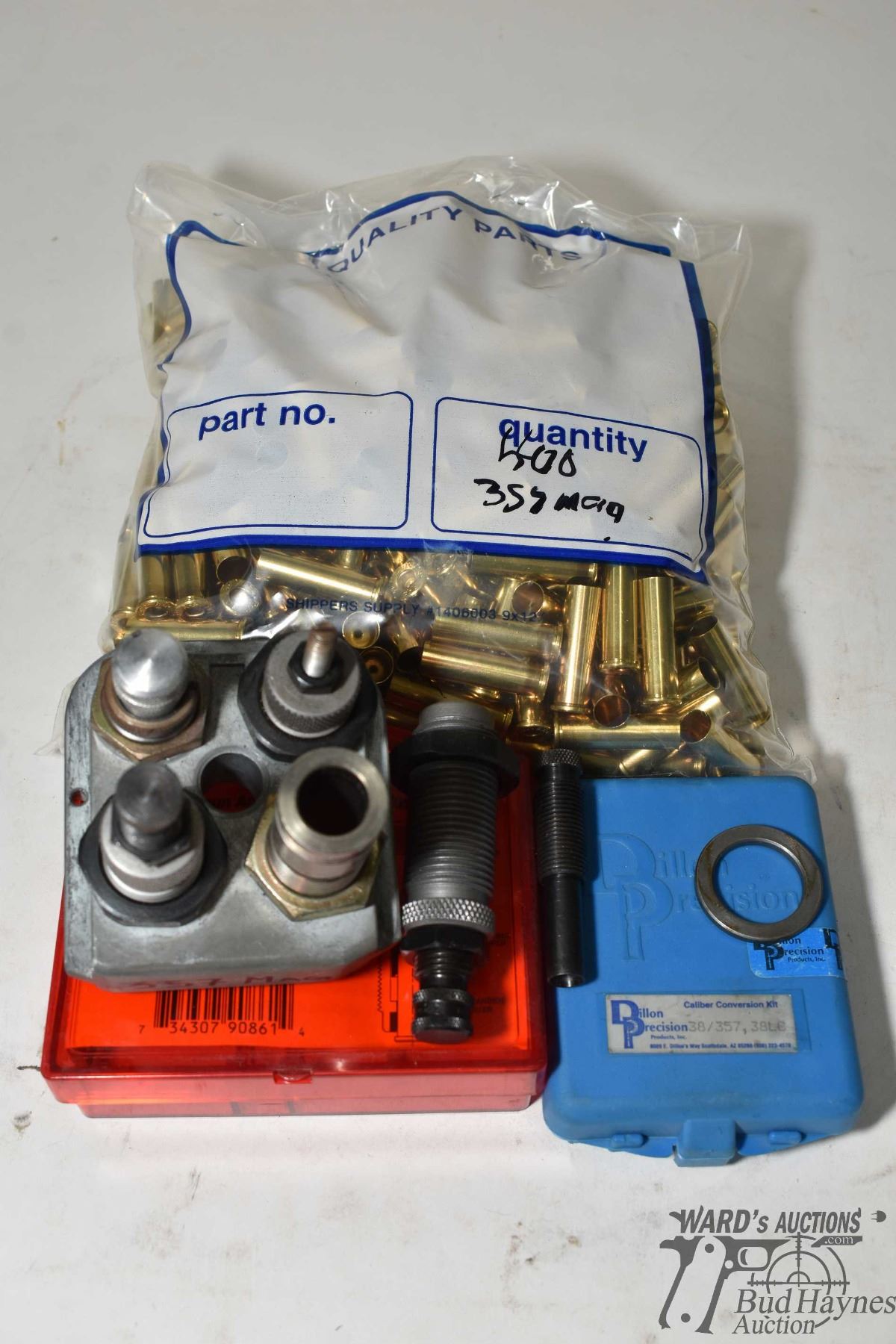 RCBS .357 mag die set in Dillon tool block, caliber conversion kit and 400 .357 mag brass