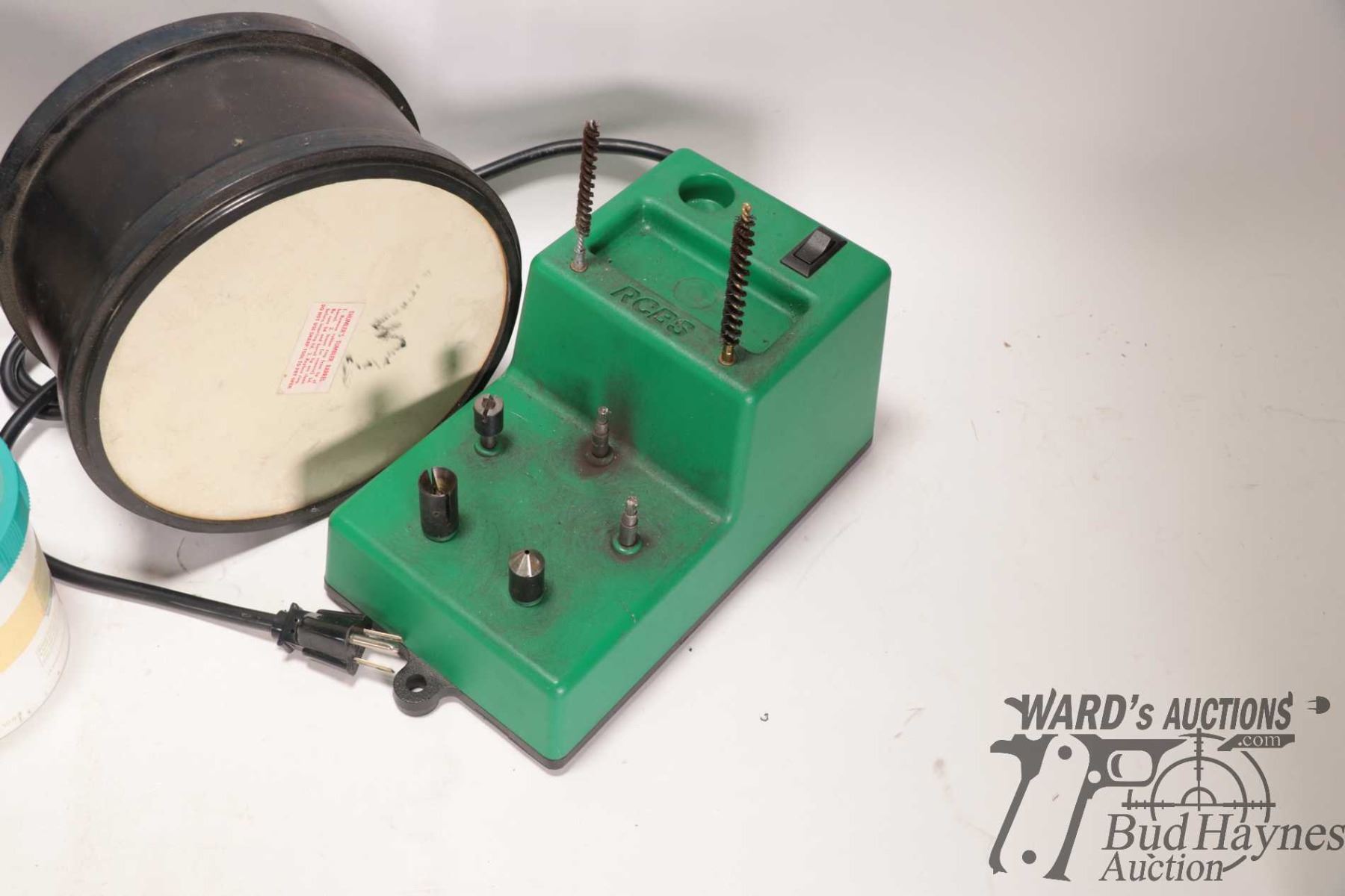 RCBS Trim Mate case prep center and a tumbler model A-R1 tumber with two drums, both working