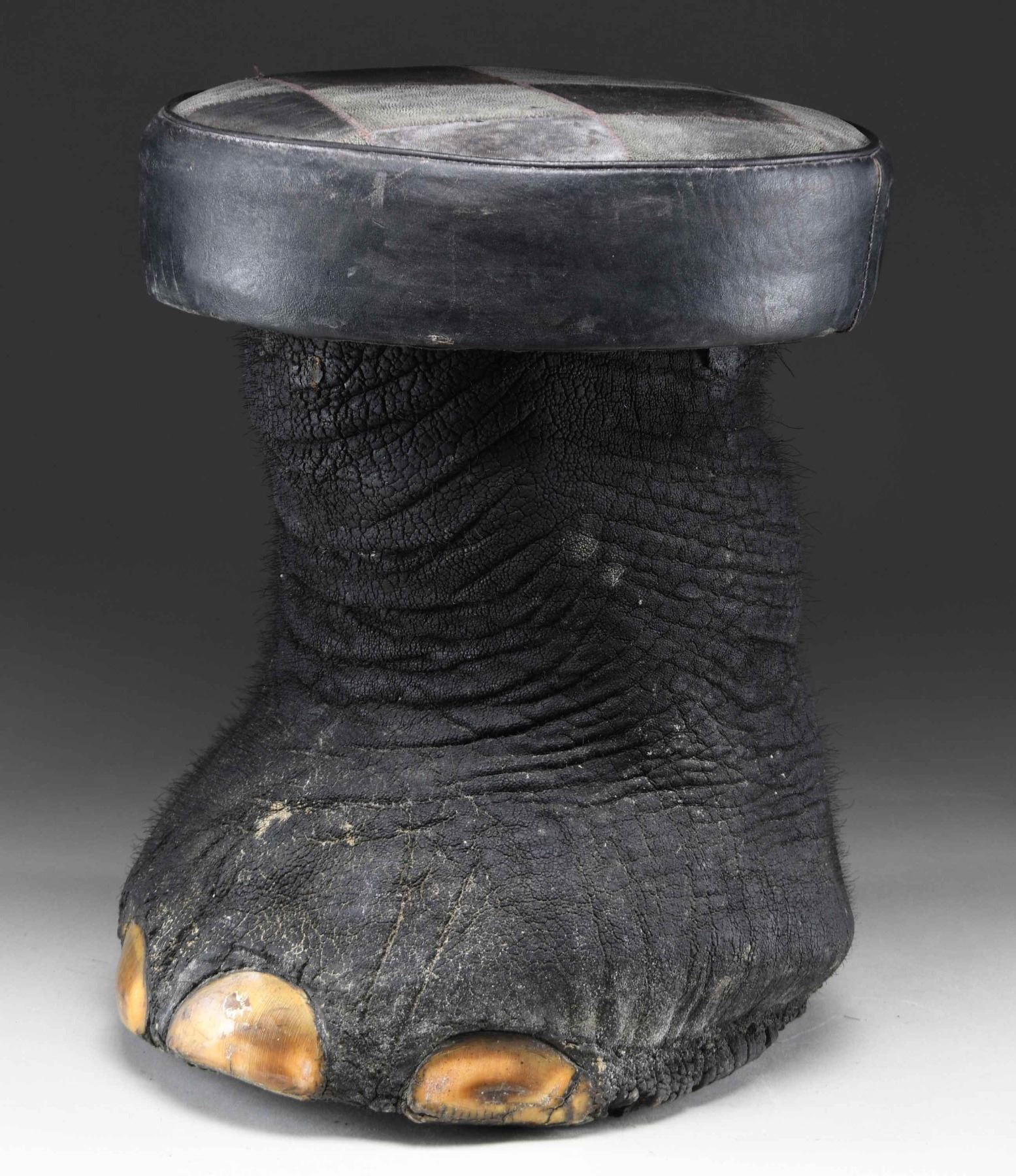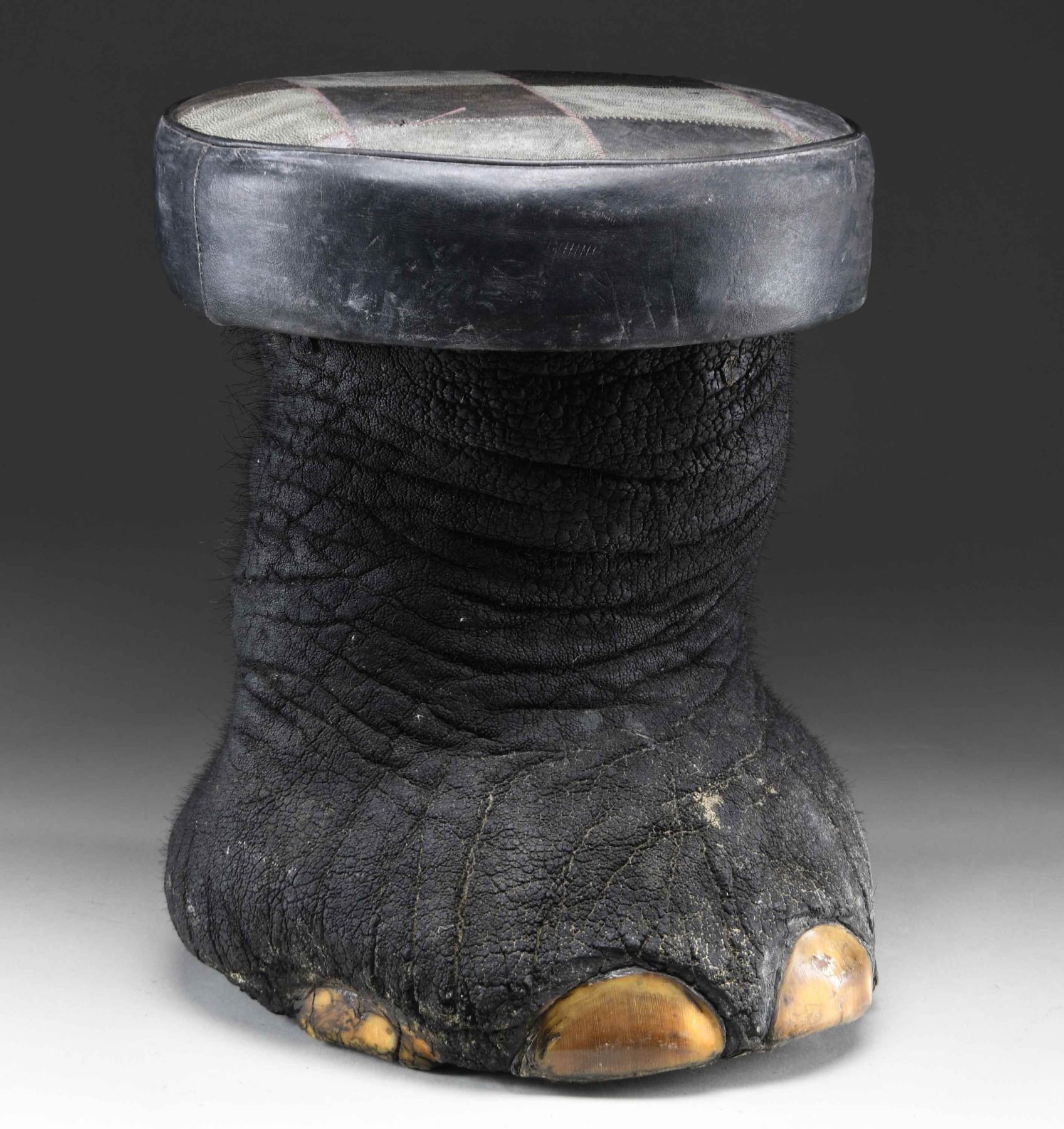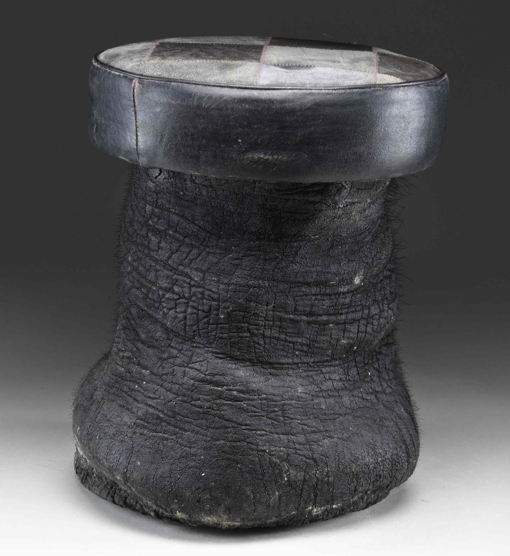 SITTING STOOL. This elephant foot has been made into a sitting stool or foot stool by local craftsmen in India. This example measures approximately 16 1/2" in height and approximately 13 1/2" in width at the seat. The seat measures approximately 3 3/4" in thickness and 42" in circumference, with the top covered in black and gray buffalo hide in a checkered pattern. The seat is edged in black leather and the foot itself is painted/dyed black. CONDITION: stool shows handling wear only, with very minor losses to the body of the foot. PROVENANCE: from the renowned collection of quality sporting arms from Lewis Drake together with inventory of Lewis Drake Associates. (02-23564-11/BF). $300-500.