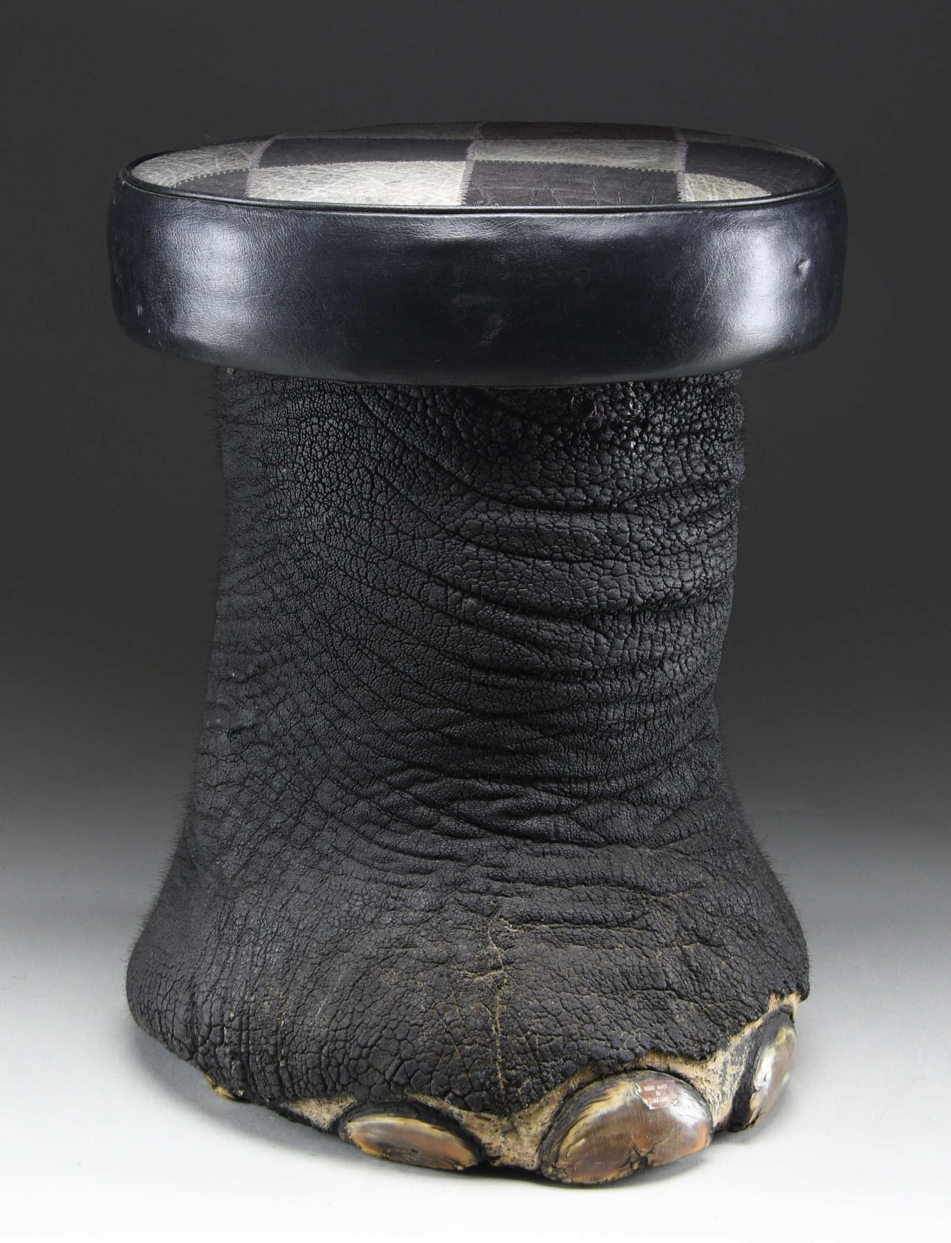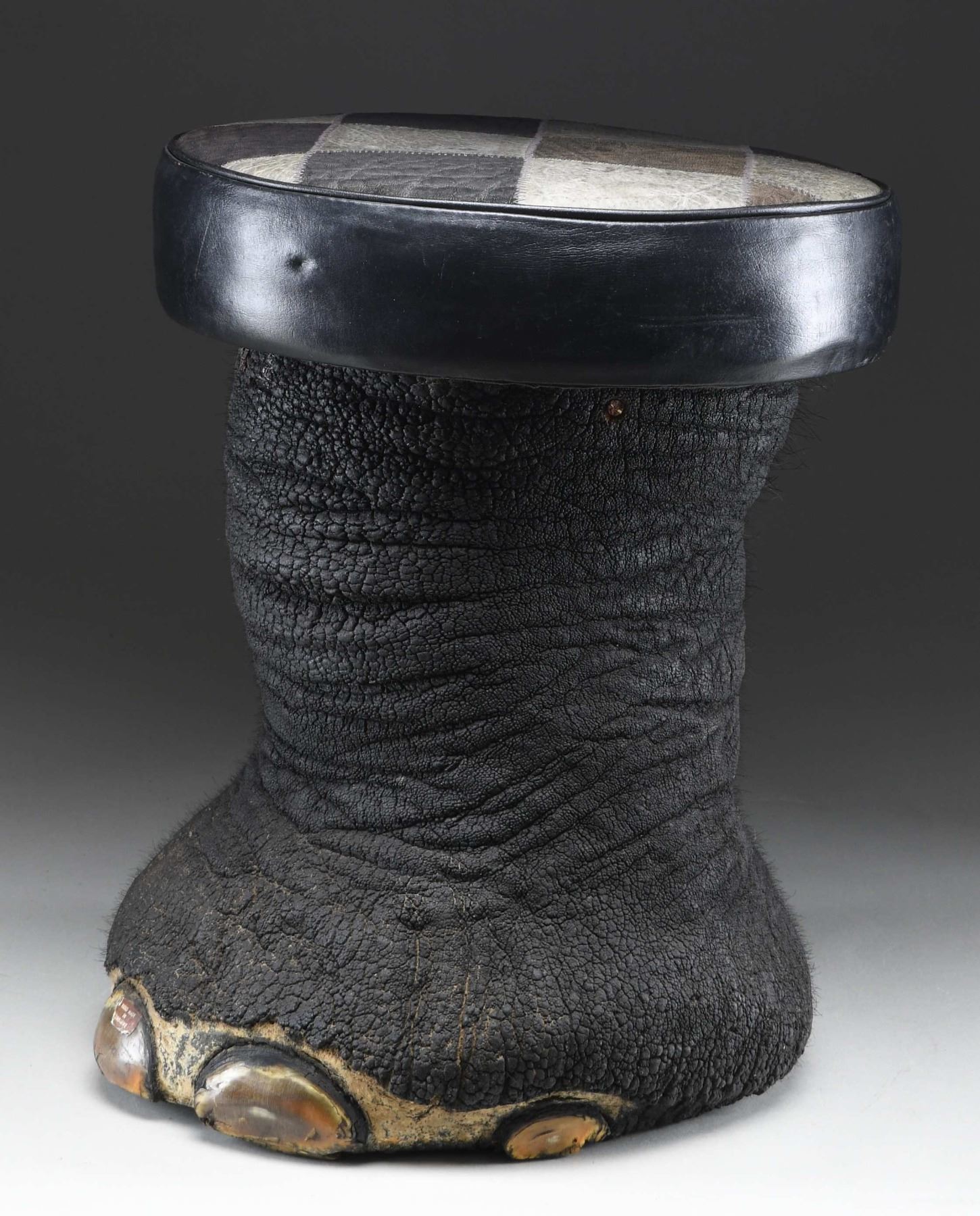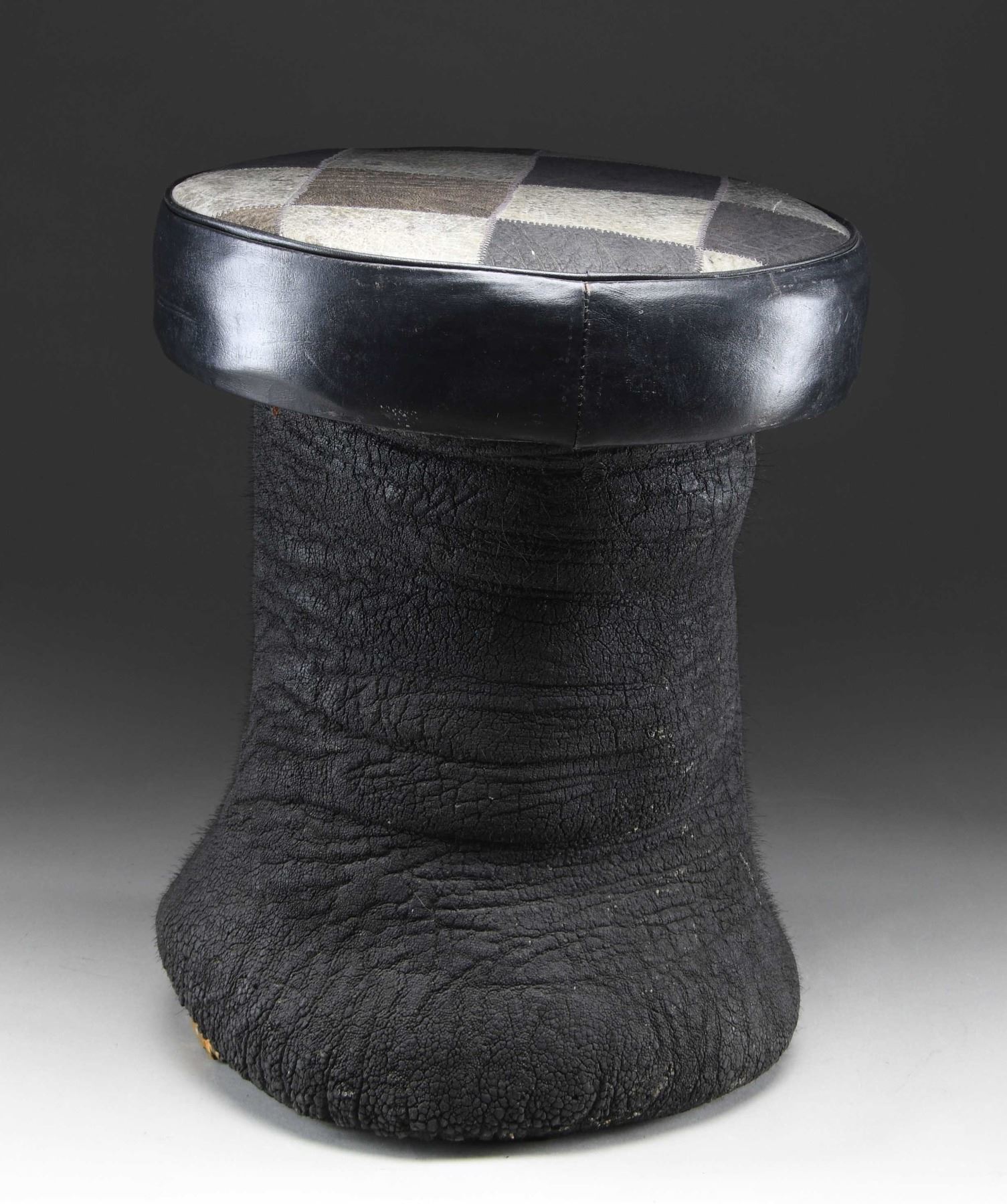 SITTING STOOL. This elephant foot has been made into a sitting stool or foot stool by local craftsmen in India. This example measures approximately 18 1/2" in height and approximately 14 3/4" in width at the seat. The seat measures approximately 3 3/4" in thickness and 46" in circumference, with the top covered in black and gray buffalo hide in a checkered pattern. The seat is edged in black leather and the foot itself is painted/dyed black. CONDITION: stool shows handling wear only, with very minor losses to the body of the foot. PROVENANCE: from the renowned collection of quality sporting arms from Lewis Drake together with inventory of Lewis Drake Associates. (02-23564-3/BF). $300-500.