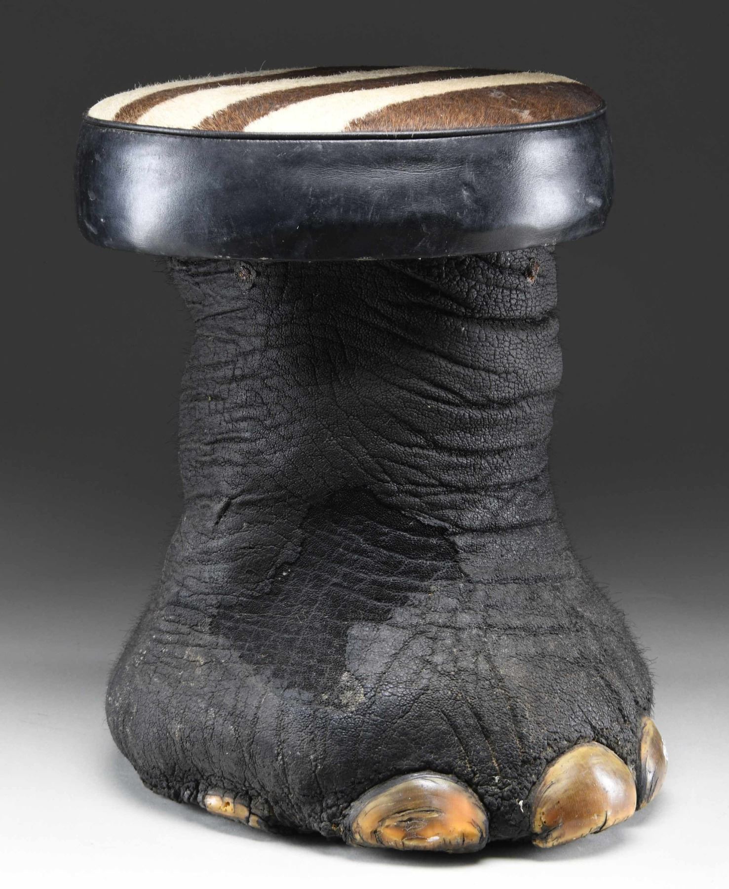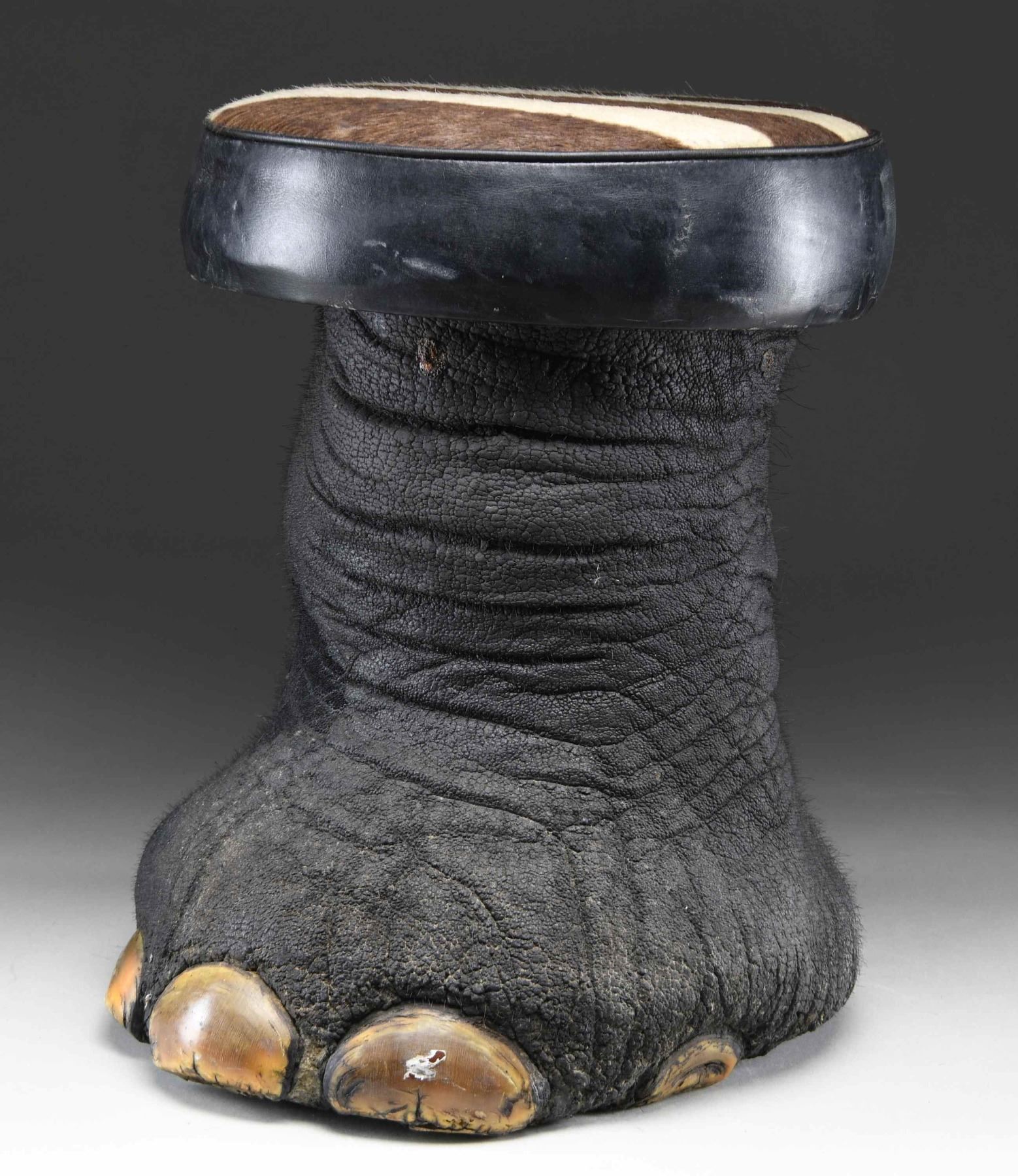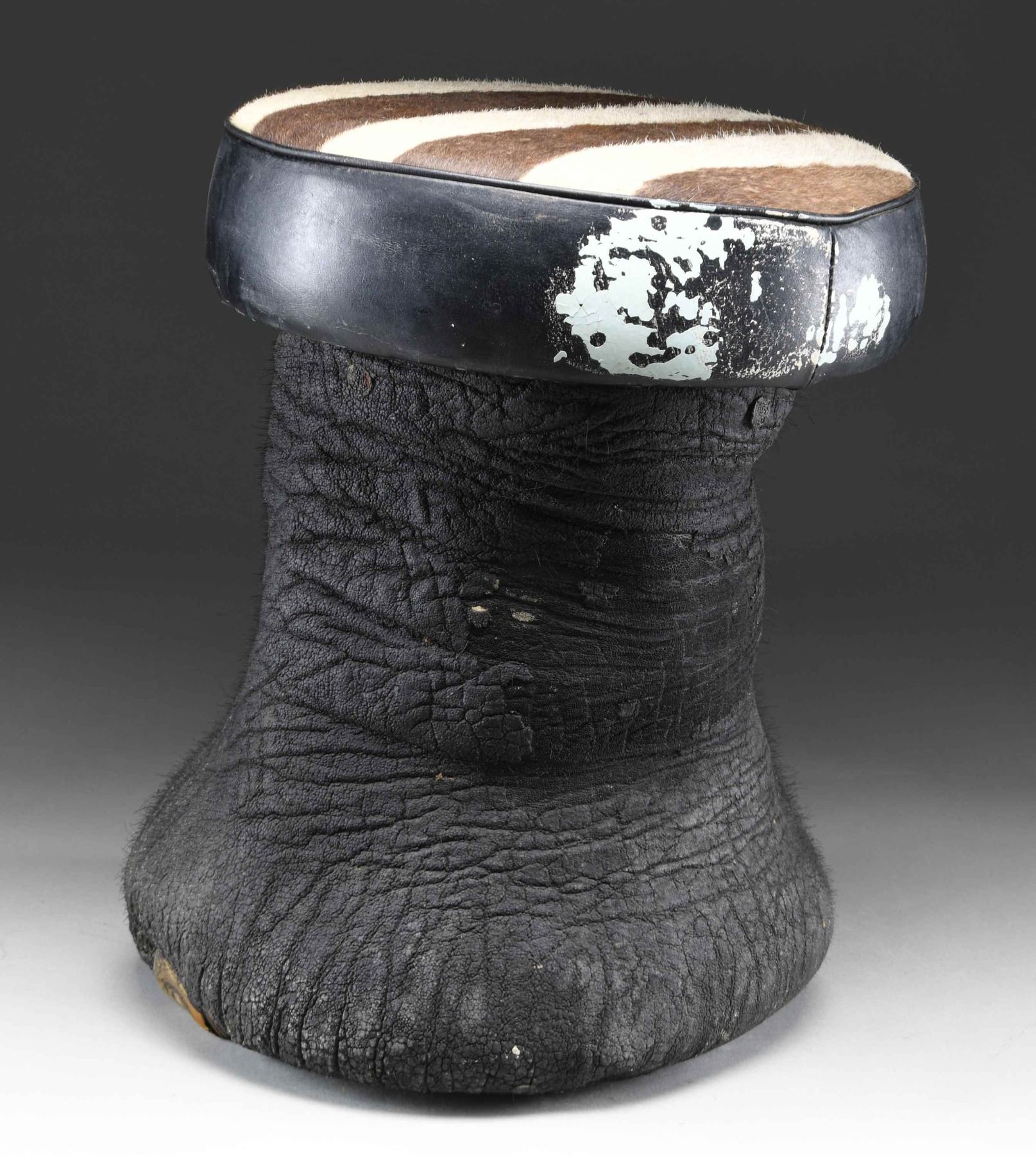SITTING STOOL. This elephant foot has been made into a sitting stool or foot stool by local craftsmen in India. This example measures approximately 17 1/2" in height and approximately 13 1/2" in width at the seat. The seat measures approximately 3 3/4" in thickness and 42 1/2" in circumference, with the top covered in brown and white striped animal hide. The seat is edged in black leather and the foot itself is painted/dyed black. CONDITION: stool shows handling wear only, with very minor losses to the body of the foot. The edge of the seat appears to have some paint residue on one side. PROVENANCE: from the renowned collection of quality sporting arms from Lewis Drake together with inventory of Lewis Drake Associates. (02-23564-8/BF). $300-500.
