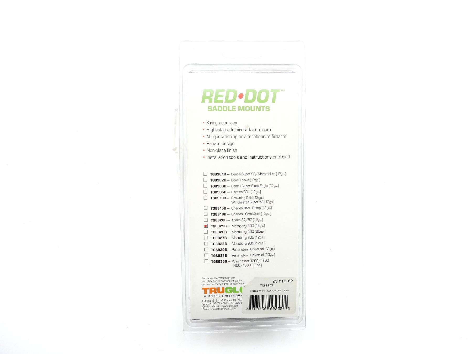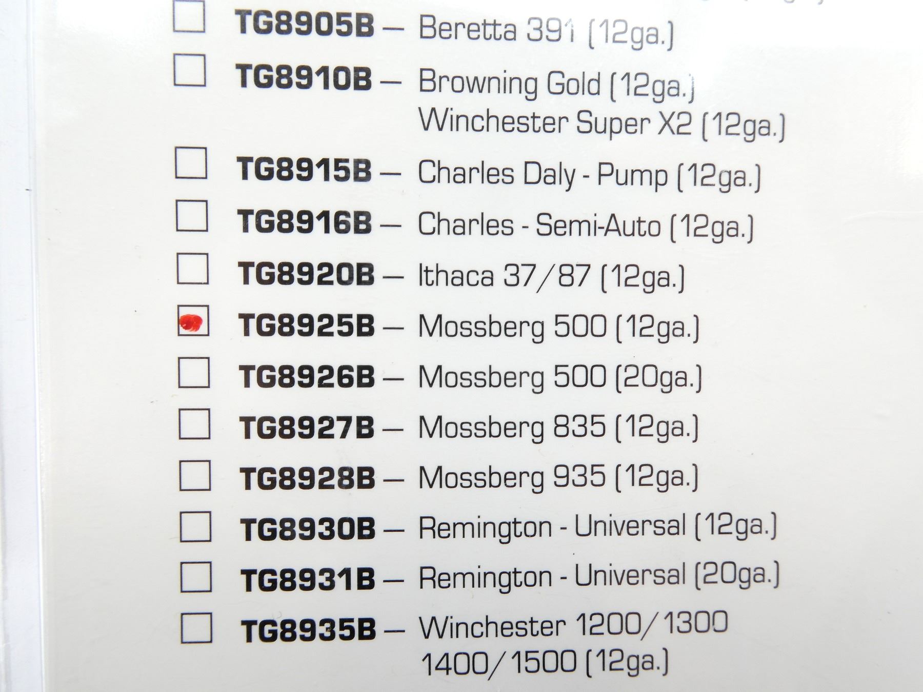 (1) FITS MOSSBERG 500 12 G. SHOTGUNS, BLACK METAL CONSTRUCTION, PART #: TG8925B, NOS IN ORIGINAL PACKAGING. MAY REQUIRE FITTING. SEE PHOTOS.