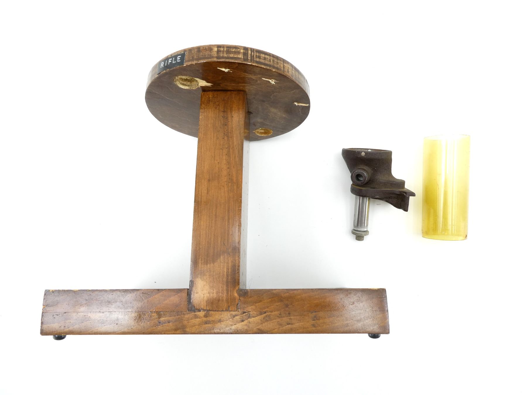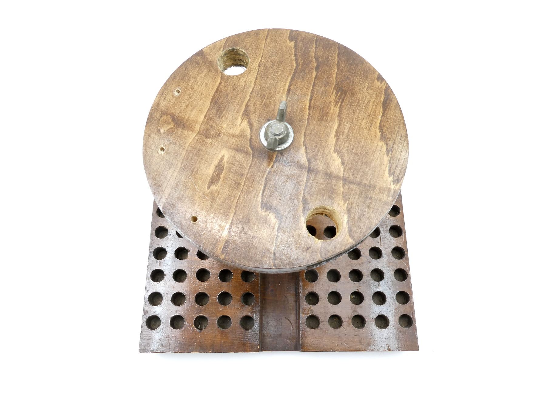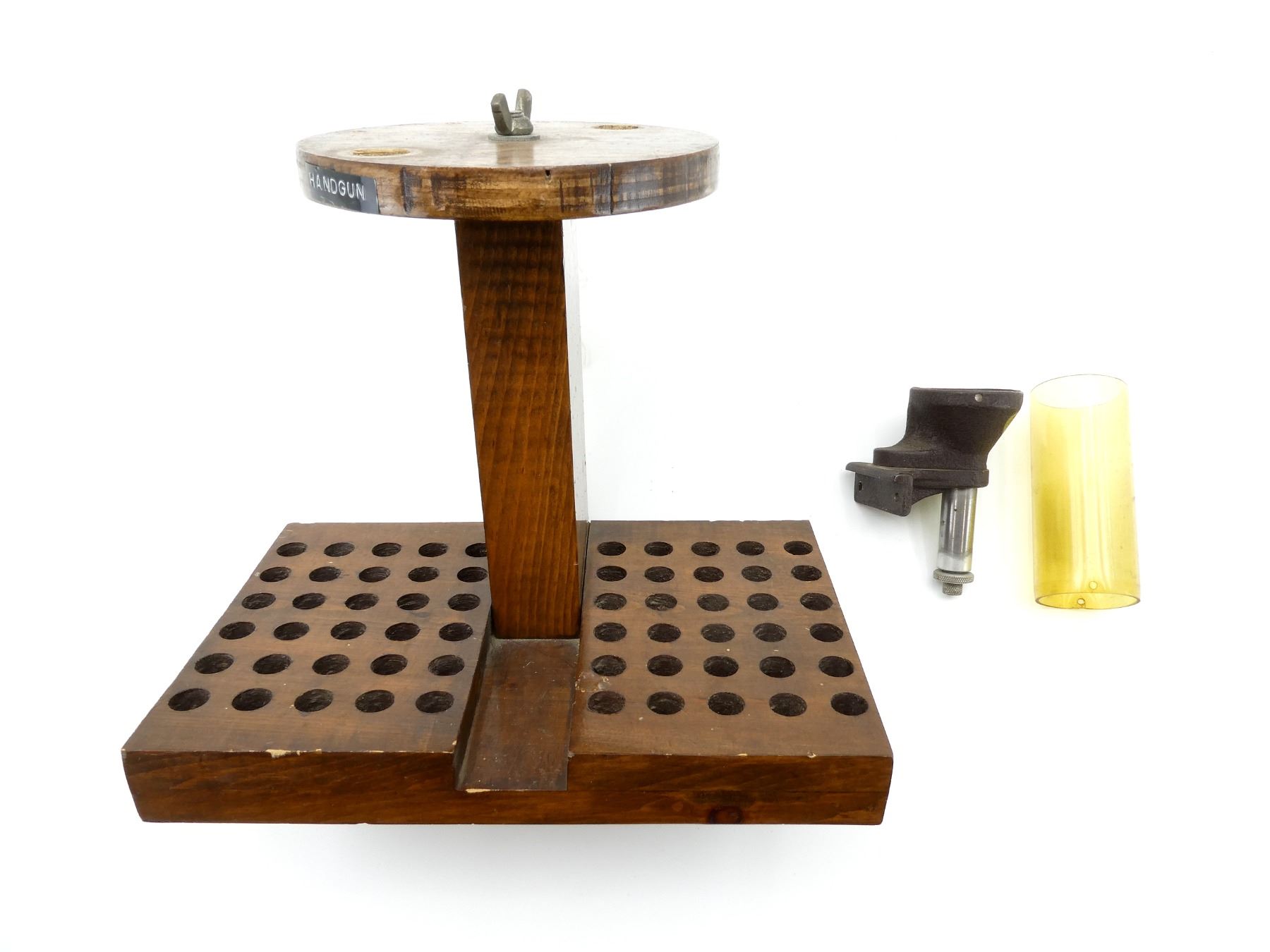 LOT INCLUDES; (1) POWDER MEASURE, MISSING CAP, MAY REQUIRE ADJUSTMENTS AND/OR MAY NOT BE COMPLETE & (1) HAND-MADE WOODEN RELOADING BLOCK, CIRCULAR STAND-LIKE PIECE MARKED: "HANDGUN" ON ONE SIDE & "RIFLE" ON THE OTHER, HOLDS 60-RNDS, FITS VARIOUS RIFLE / PISTOL CALIBERS, APPROX. 11.75" X 7.5" X 10". SEE PHOTOS.