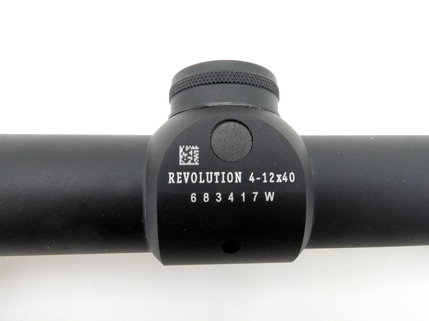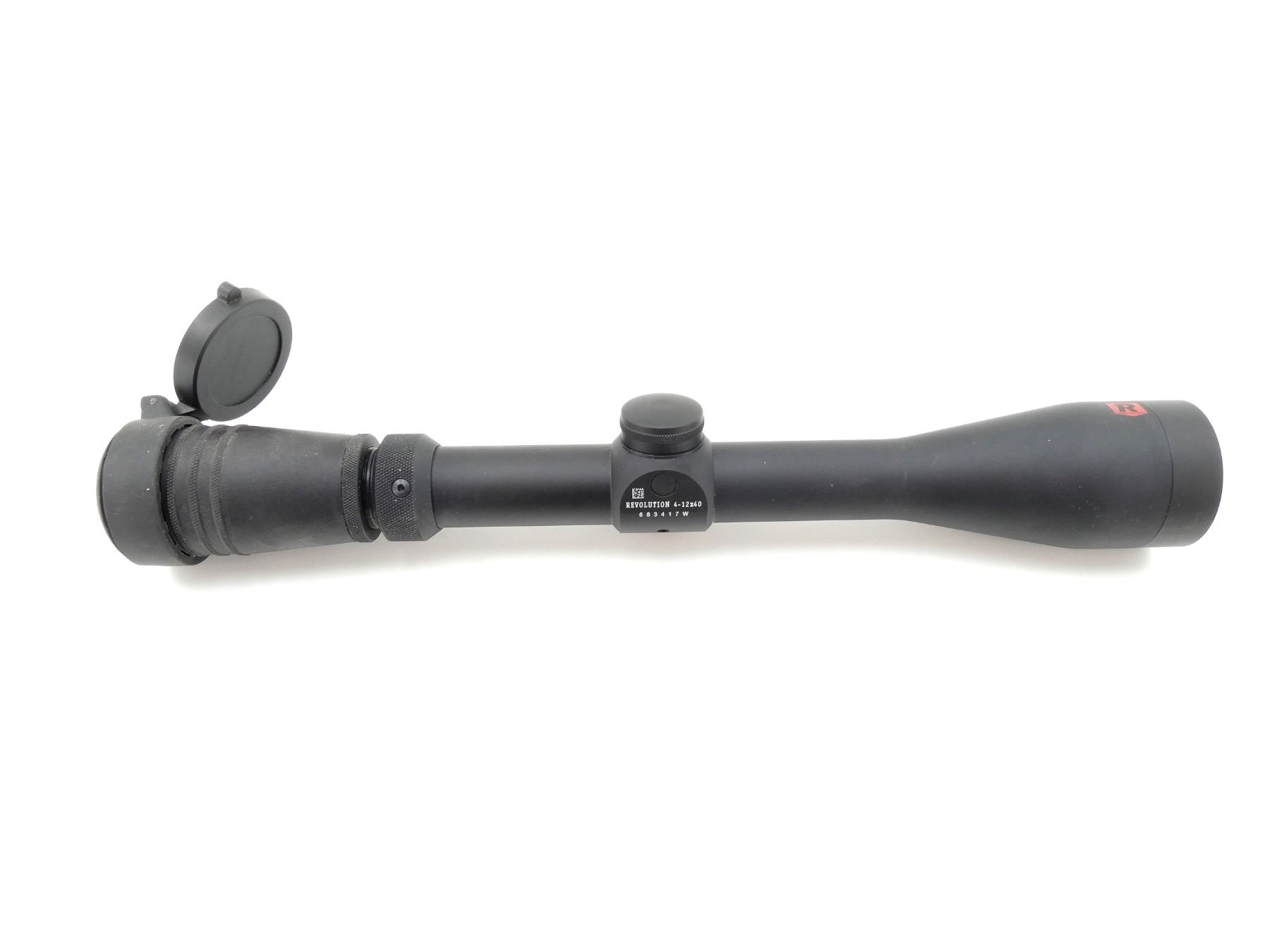 (1) CLEAR OPTICS, ACCU-RANGE RETICLE, 1" TUBE DIAMETER, WORKING MAGNIFICATION RING, WINDAGE & ELEVATION KNOBS TURN, MARKED: "REVOLUTION 4-12X40", "683417W", ETC., SHOWS WEAR & TEAR / USE MARKS, WITH SINGLE LENS COVER. MAY REQUIRE FITTING. SEE PHOTOS.