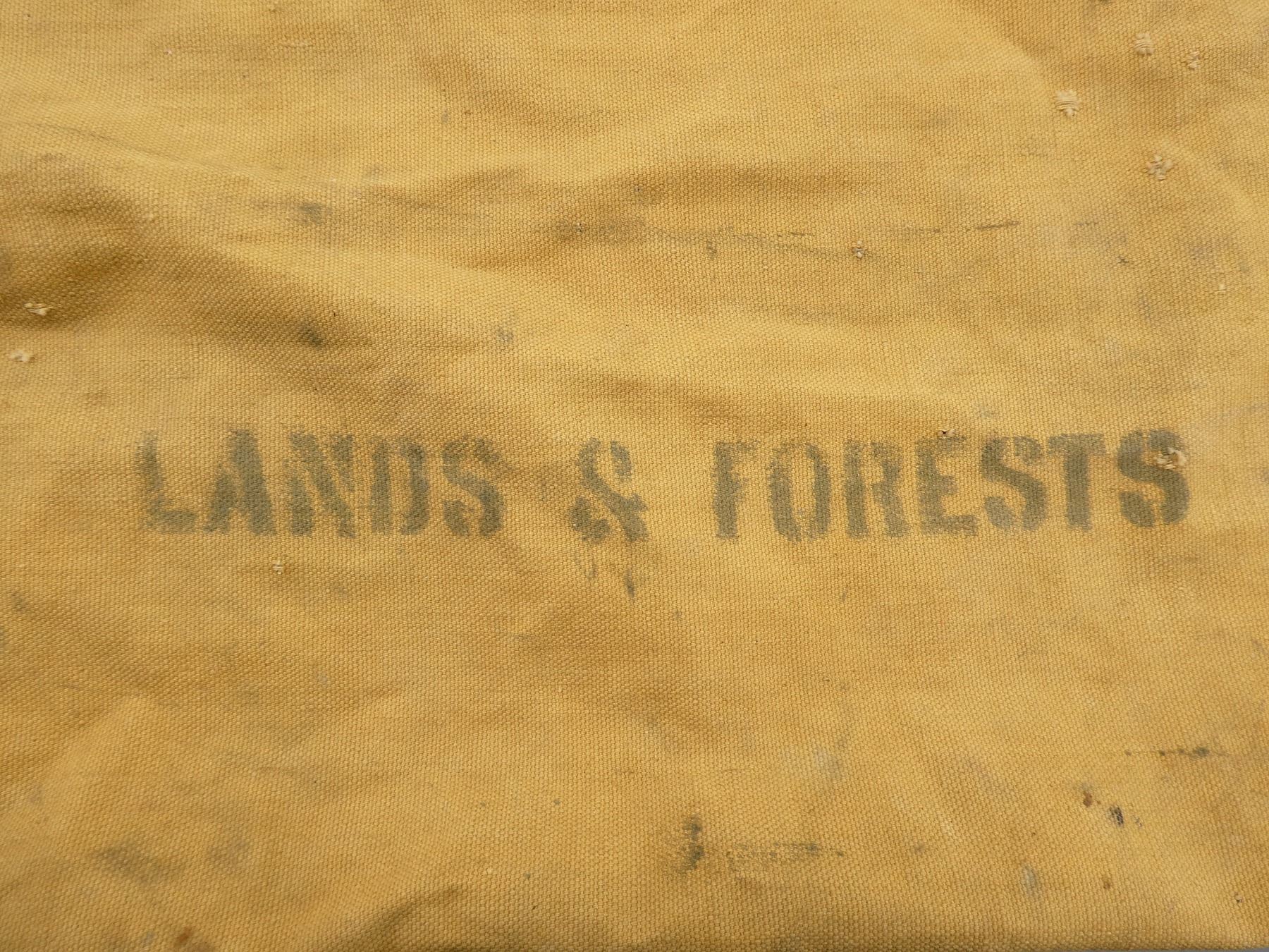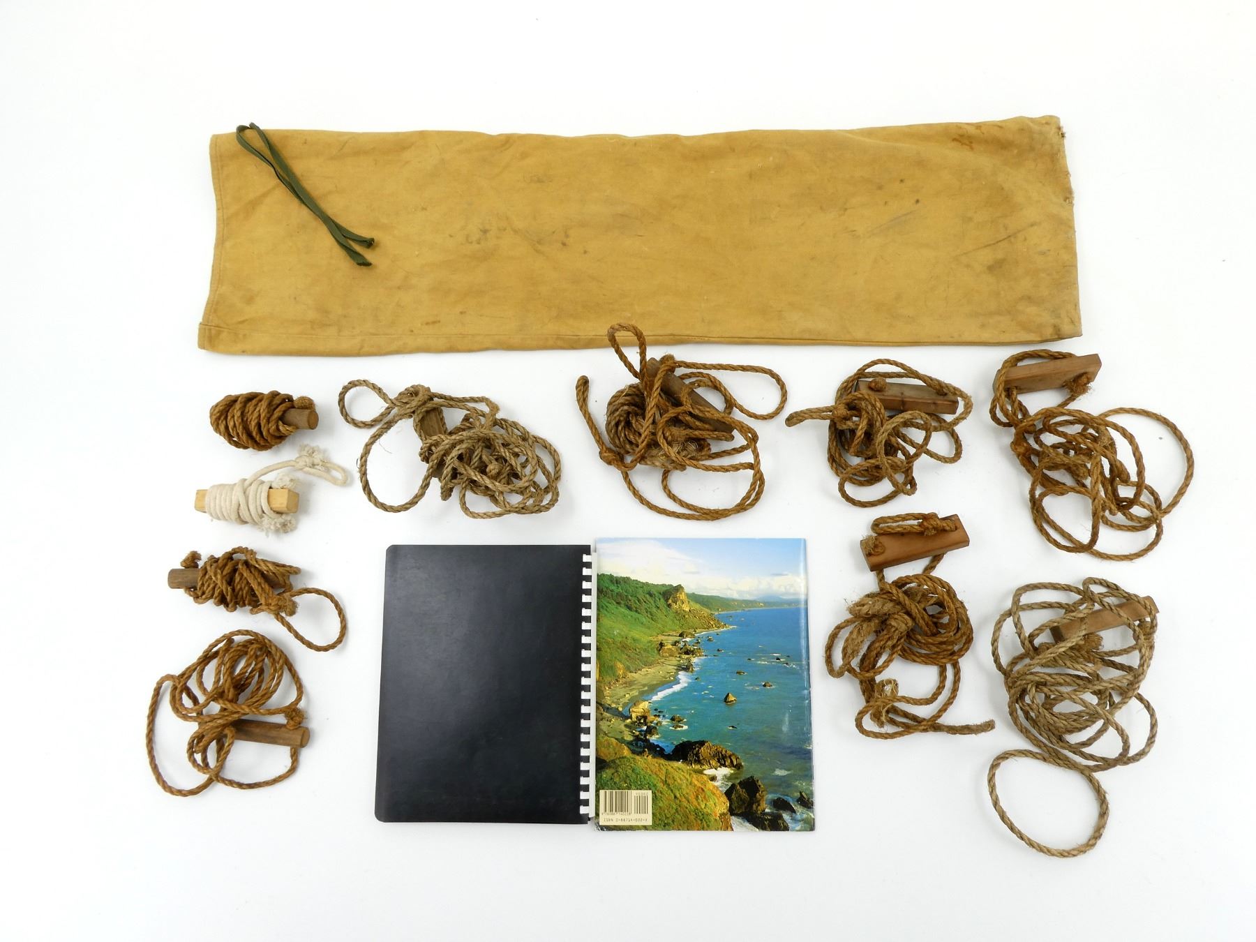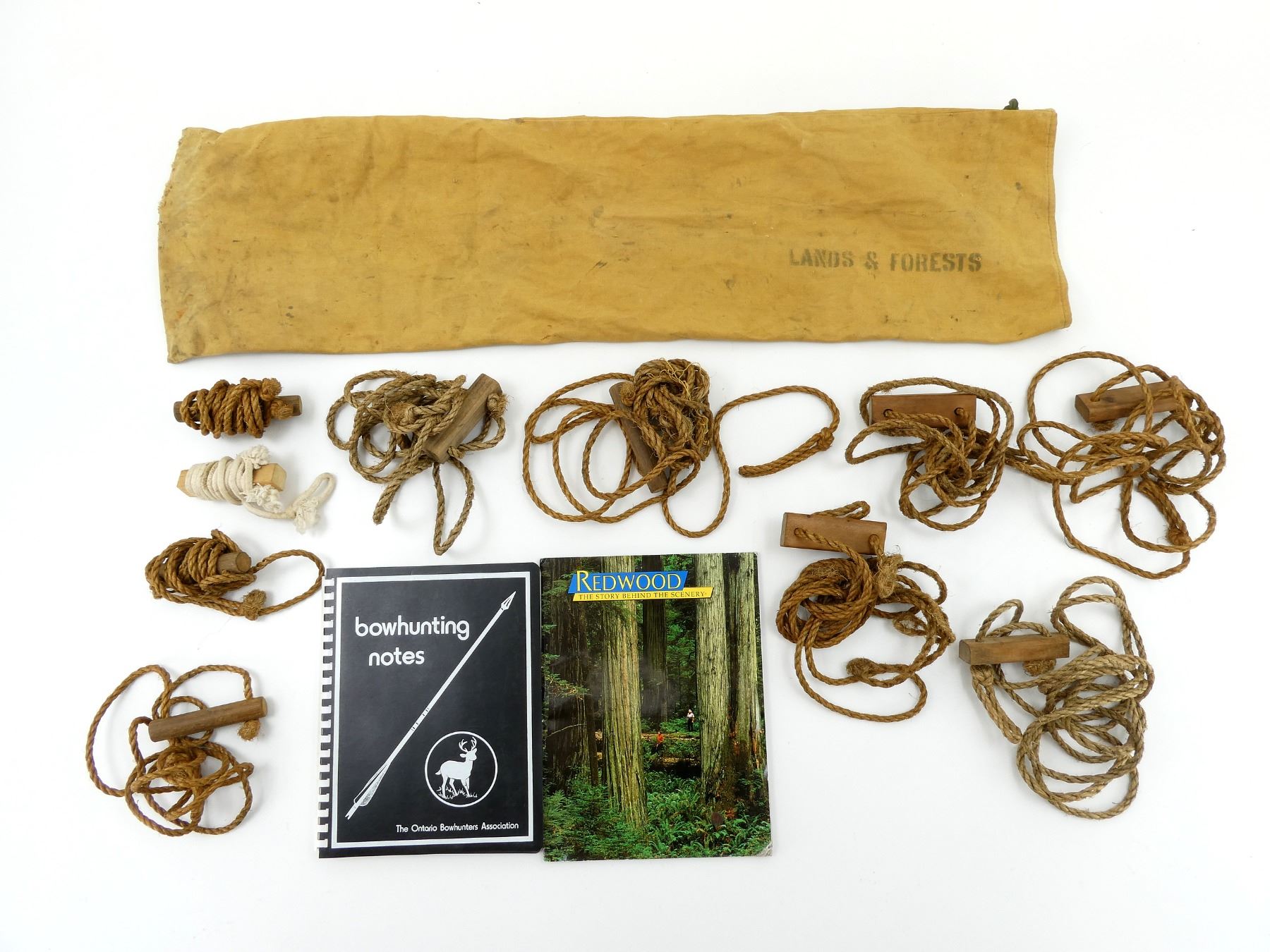 LOT INCLUDES; (1) "REDWOOD THE STORY BEHIND THE SCENERY" BOOK, BY RICHARD A. RASP, SOFT COVER, ISBN: 0-88714-022-X, (1) "BOWHUNTING NOTES" BOOK, BY THE ONTARIO BOWHUNTERS ASSOCIATION, SPIRAL BOUND SOFT COVER, COPYRIGHT 1980 & (11) VINTAGE ROPE TIE-DOWNS, VARIOUS LENGTHS, WITH LANDS & FORESTS SACK, SACK OVERALL LENGTH APPROX. 39" X 10", TIE CLOSURE. SEE PHOTOS.
