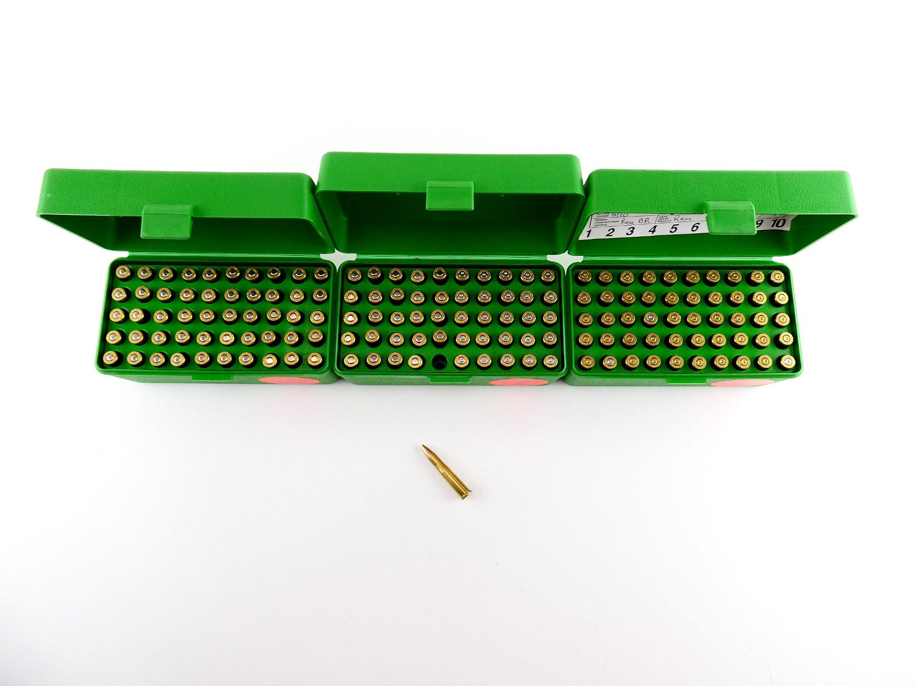 LOT INCLUDES; APPROX. (74) RNDS, CONSIGNOR STATES; "36 GRNS BARNES VARMINT", NOT CONFIRMED, (76) NON-PRIMED BRASS CASES, (3) CASE-GARD R-50 PLASTIC AMMO BOX,