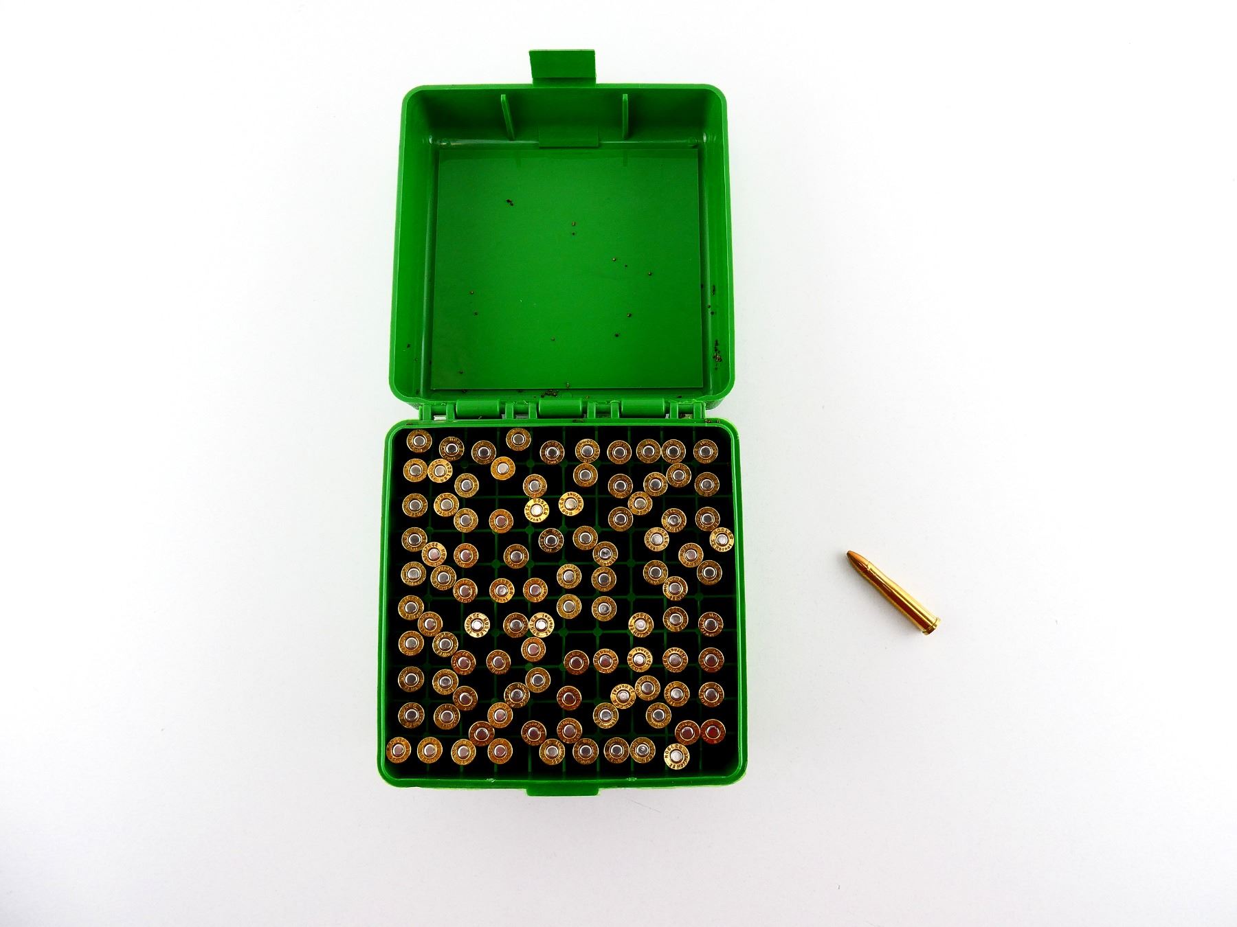 LOT INCLUDES; APPROX. (100) RNDS, HP, (1) MTM CASE-GARD RS-100 PLASTIC AMMO BOX.