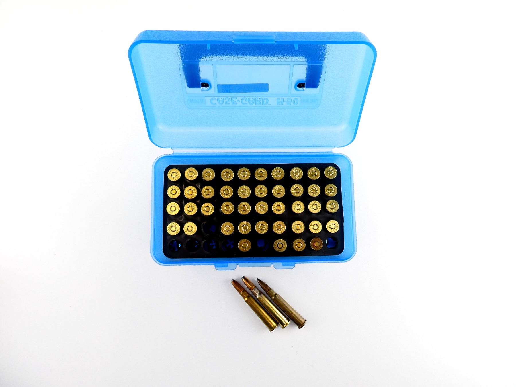 LOT INCLUDES; APPROX. (46) RNDS, SP, MAY CONTAIN SOME FACTORY RNDS, (1) CASE-GARD H-50 PLASTIC AMMO BOX.