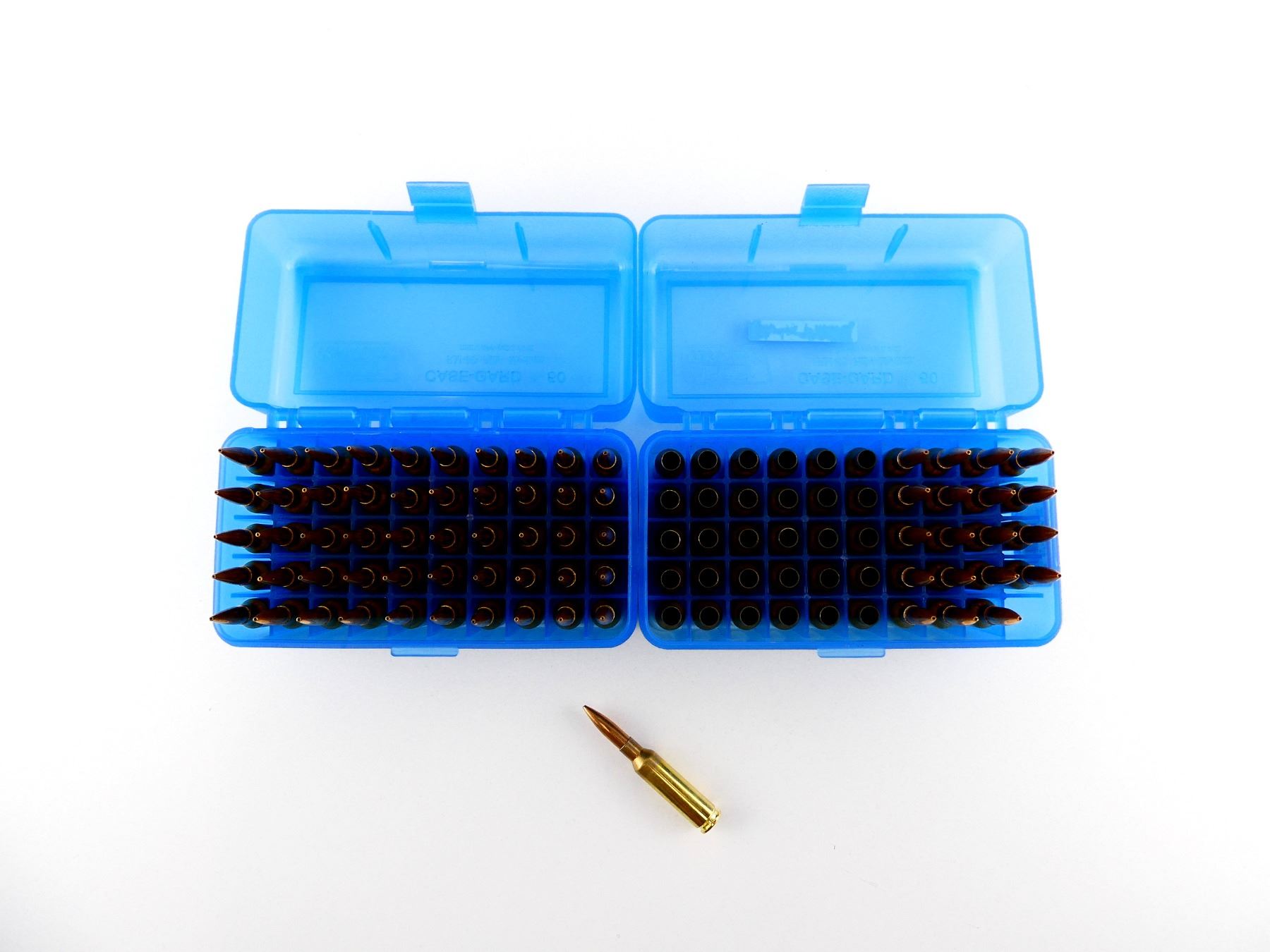 LOT INCLUDES; APPROX. (70) RNDS, CONSIGNOR STATES; "140 GRNS VLD TARGET, ETC.,", NOT CONFIRMED, (30) NON-PRIMED BRASS CASES, (2) MTM CASE-GARD 50 PLASTIC AMMO BOX.
