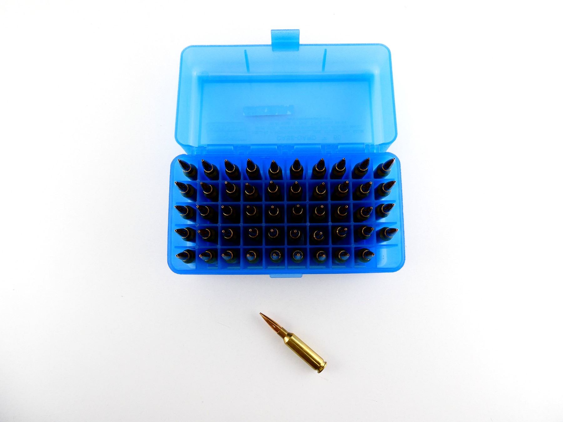 LOT INCLUDES; APPROX. (50) RNDS, CONSIGNOR STATES; "140 GRNS VLD TARGET", NOT CONFIRMED, (1) MTM CASE-GARD 50 PLASTIC AMMO BOX.