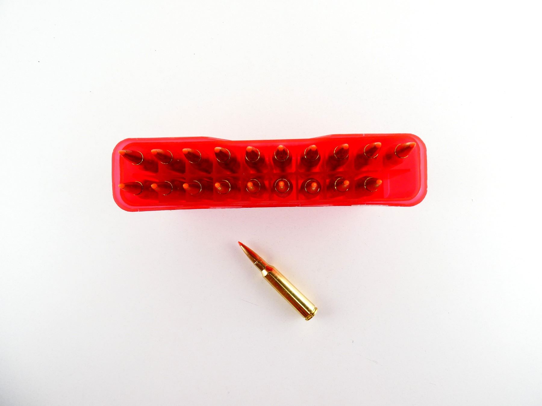 LOT INCLUDES; APPROX. (20) RNDS, (1) MTM CASE-GARD J-20 PLASTIC RIFLE AMMO BOX.