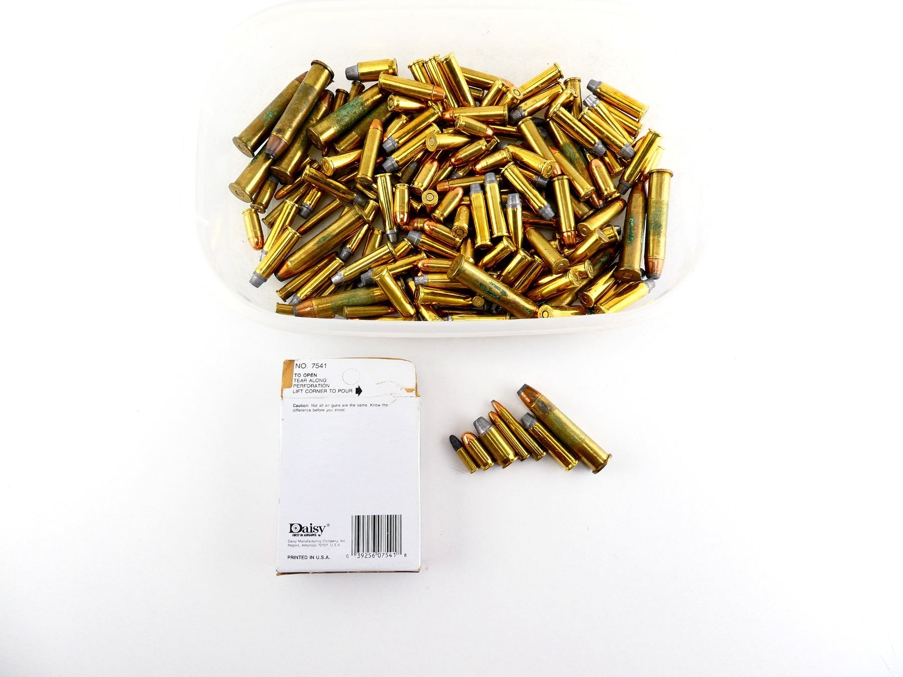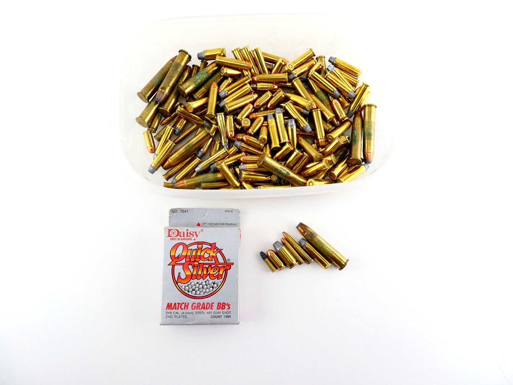 LOT INCLUDES; APPROX. (155) RNDS, VARIOUS CALIBERS INCLUDING; .22 HORNET, .357 MAGNUM, .45 AUTO, .380 AUTO, .45-70 GOVT, ETC., CONTAINS SOME FACTORY RNDS, SOME CORROSION, (1500) DAISY QUICK SILVER BB'S, UNOPENED.