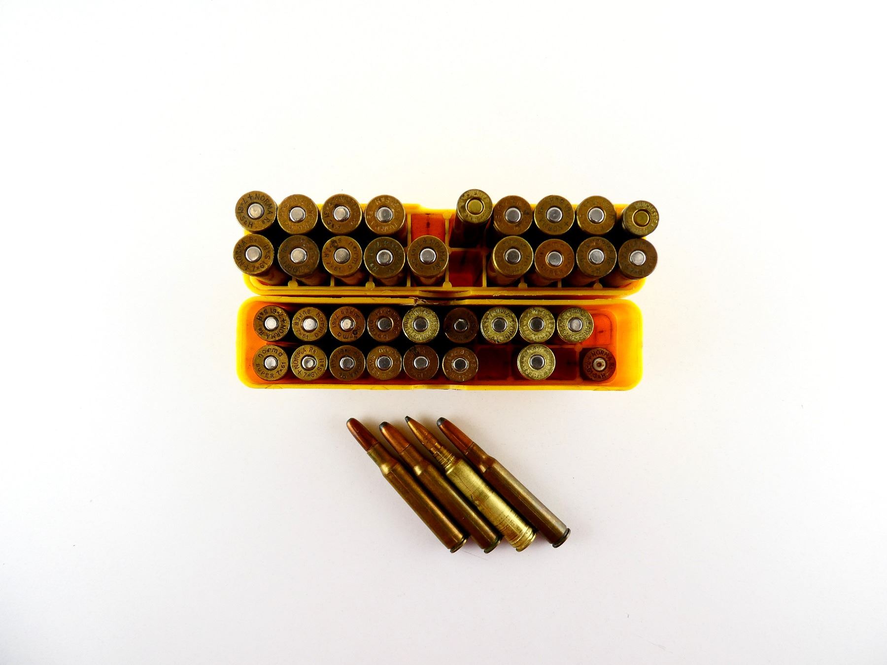 LOT INCLUDES; APPROX. (39) RNDS, VARIOUS CALIBERS INCLUDING; .30-06 SPRG, 7X61 S&H, MAY CONTAIN SOME FACTORY RNDS, (1) NON-PRIMED BRASS CASE, (2) FLAMBEAU .300 MAGNUM PLASTIC AMMO BOXES.