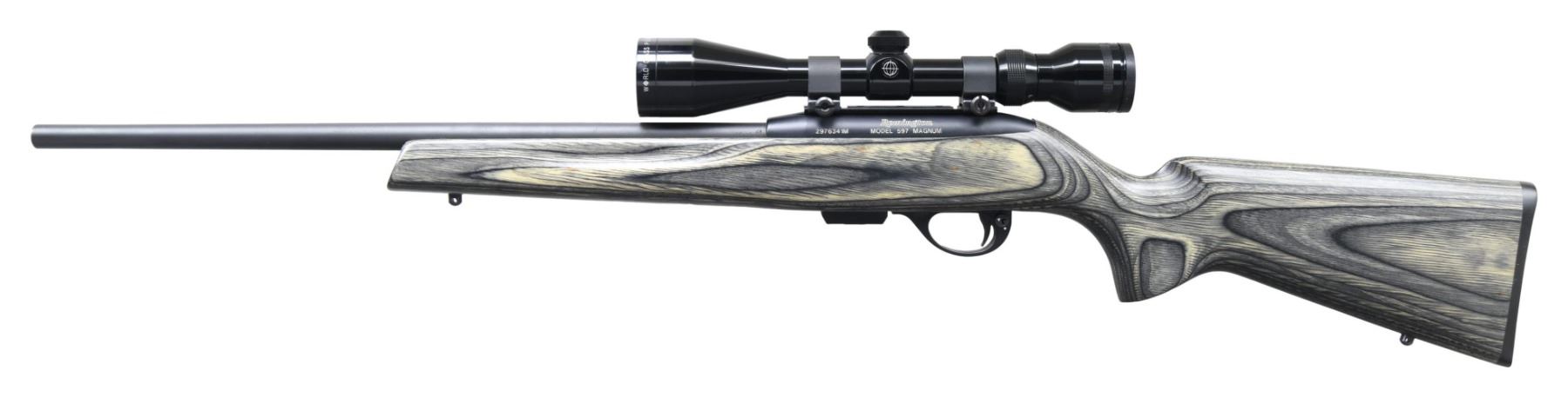 Cal. 17 HMR. S# 2976341M . Bbl. 20". Rifle is sighted with a Tasco World Class Plus 3-9x44 scope. Scope has duplex crosshair reticle & very good optics. Bikini scope cover present. Matte blue finish. Laminated stock set with bottom mounted sling studs. MAGS: 1-8 rd. CONDITION: stock shows light handling wear. Metal retains nearly all of its matte finish with a couple light handling marks. Action functions properly when hand cycled. Near excellent bore. (25-2513/MJC). MODERN. $400-600.
