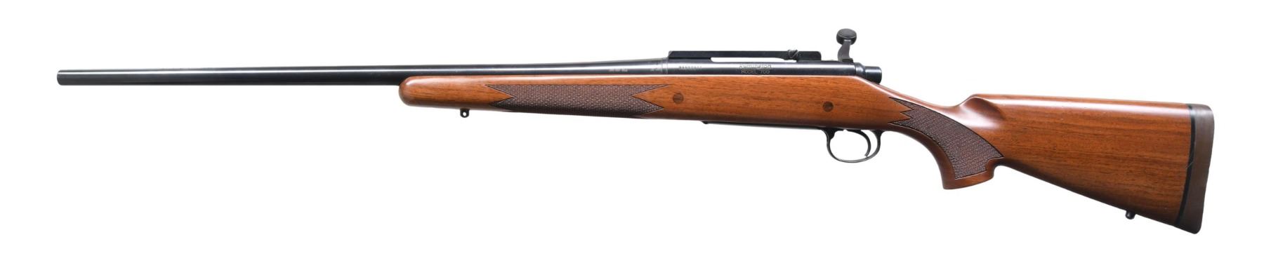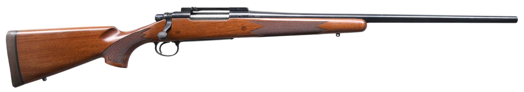 RIFLE. Cal. 375 H&H Mag. S# B6690977. Bbl. 24" sightless. Action is fitted w/ Redfield 1 piece scope mount. Classic style walnut stock w/ 2 stock bolts, cut checkering, solid brown pad & swivel bases. CONDITION: 98% blue. Stock shows a few small marks. Very good bore. PROVENANCE: from the renowned collection of quality sporting arms from Lewis Drake together with inventory of Lewis Drake Associates. (24-6565/DS). MODERN. $600-900.