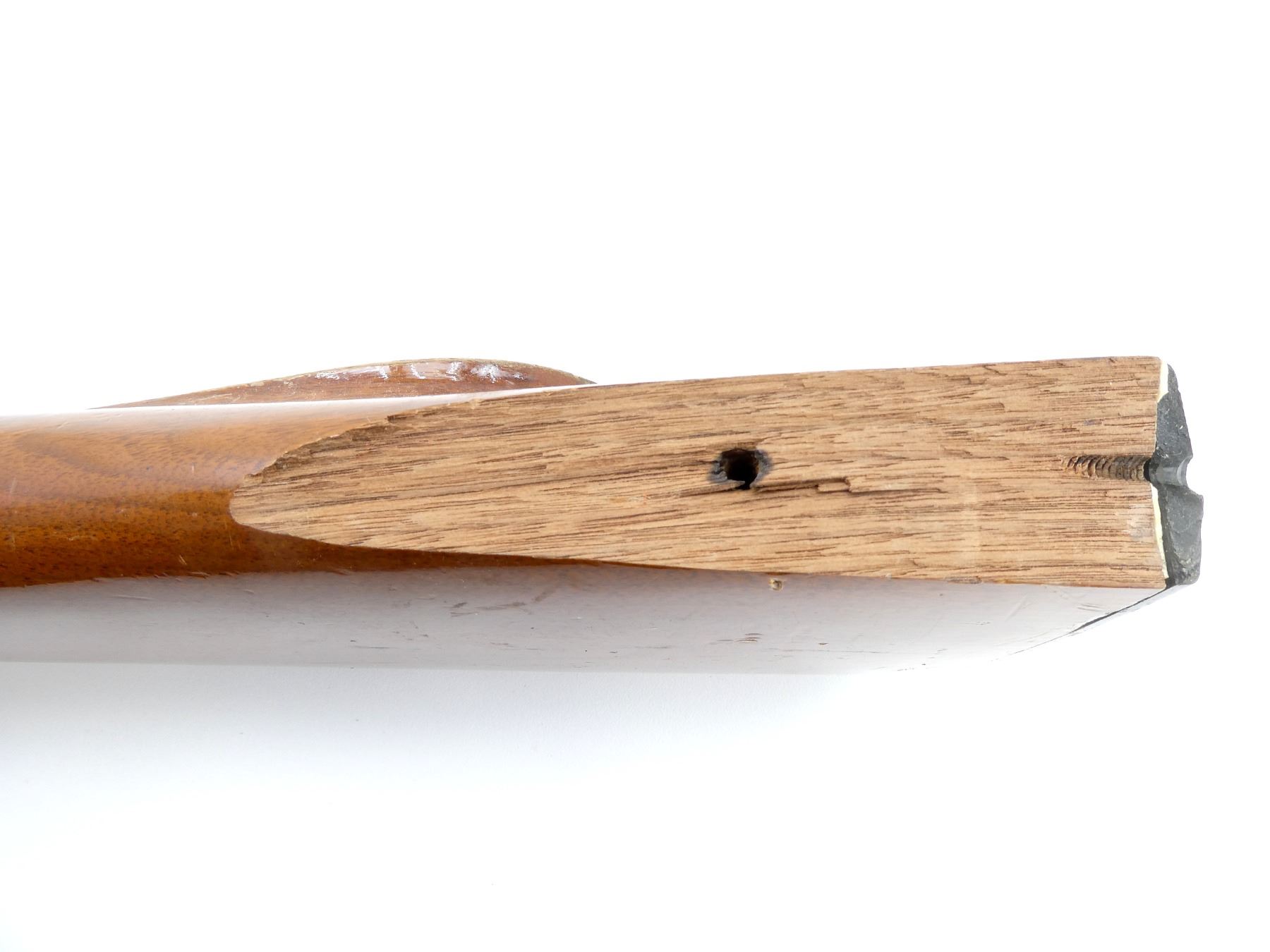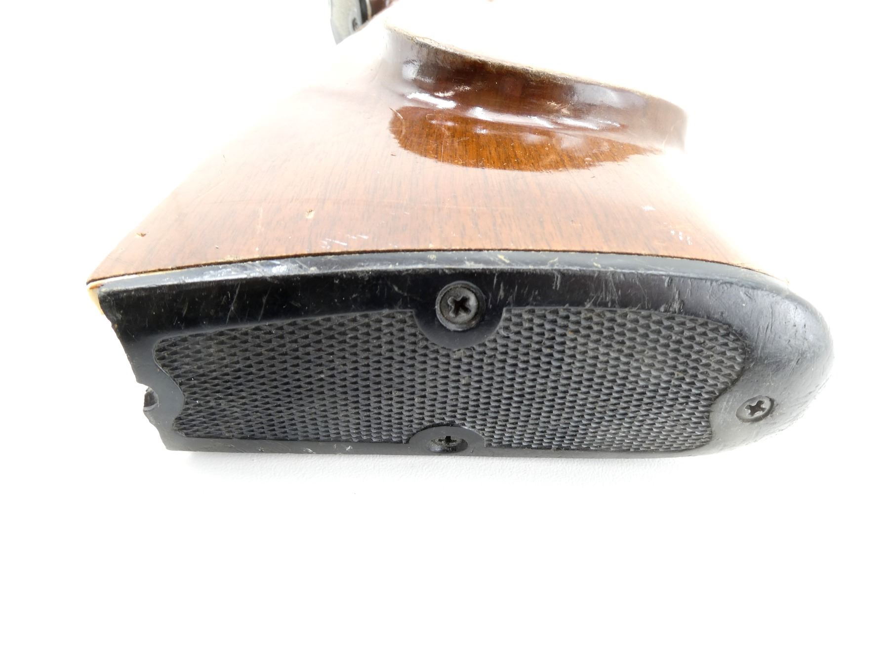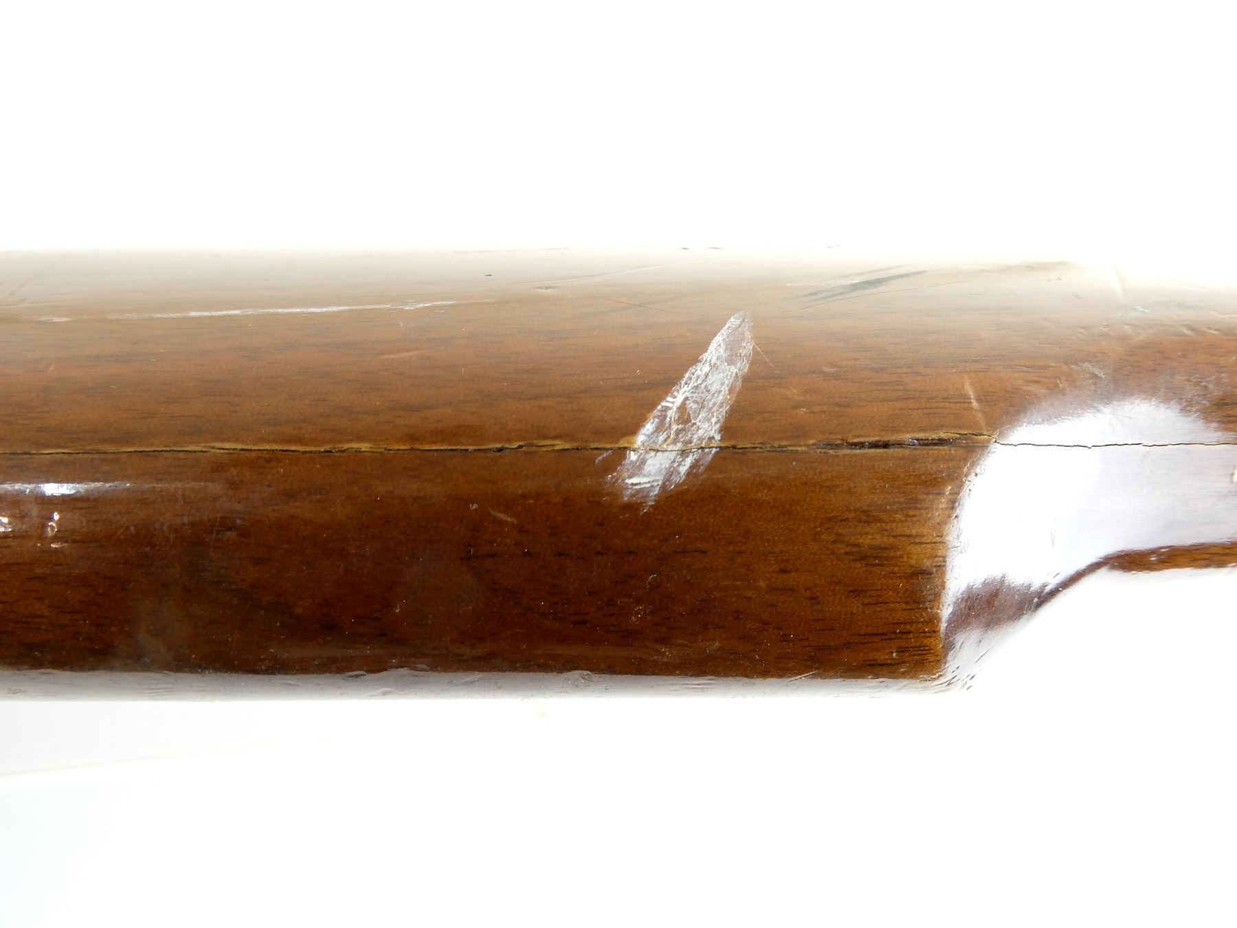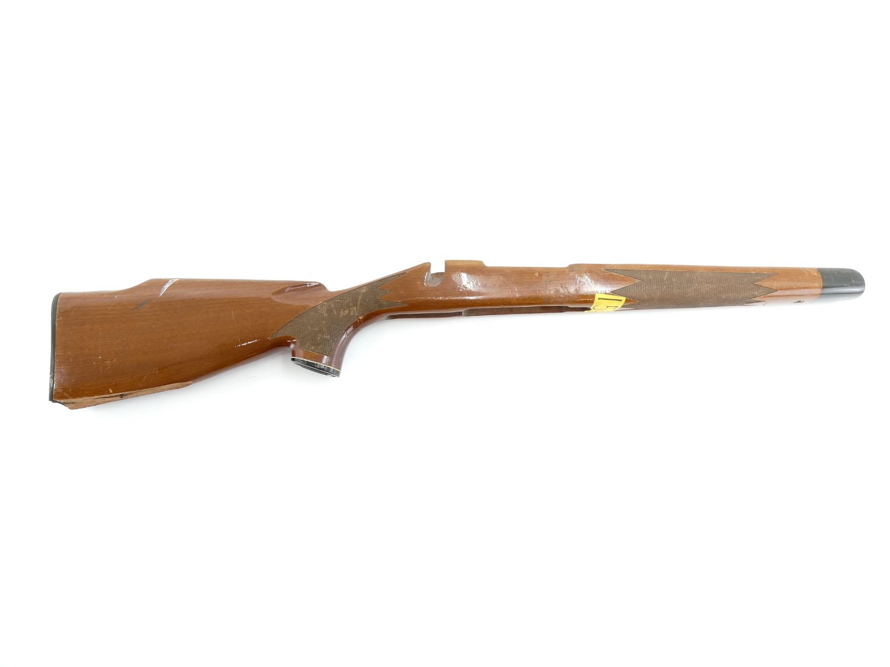 (1) WOODEN STOCK, CHECKERED, UNMARKED, WITH RH CHEEK REST, MAY HAVE SMALL CRACKS & CHIPS, BUTT PIECE BROKEN, OVERALL LENGTH APPROX. 31.25". MAY REQUIRE FITTING. SEE PHOTOS.