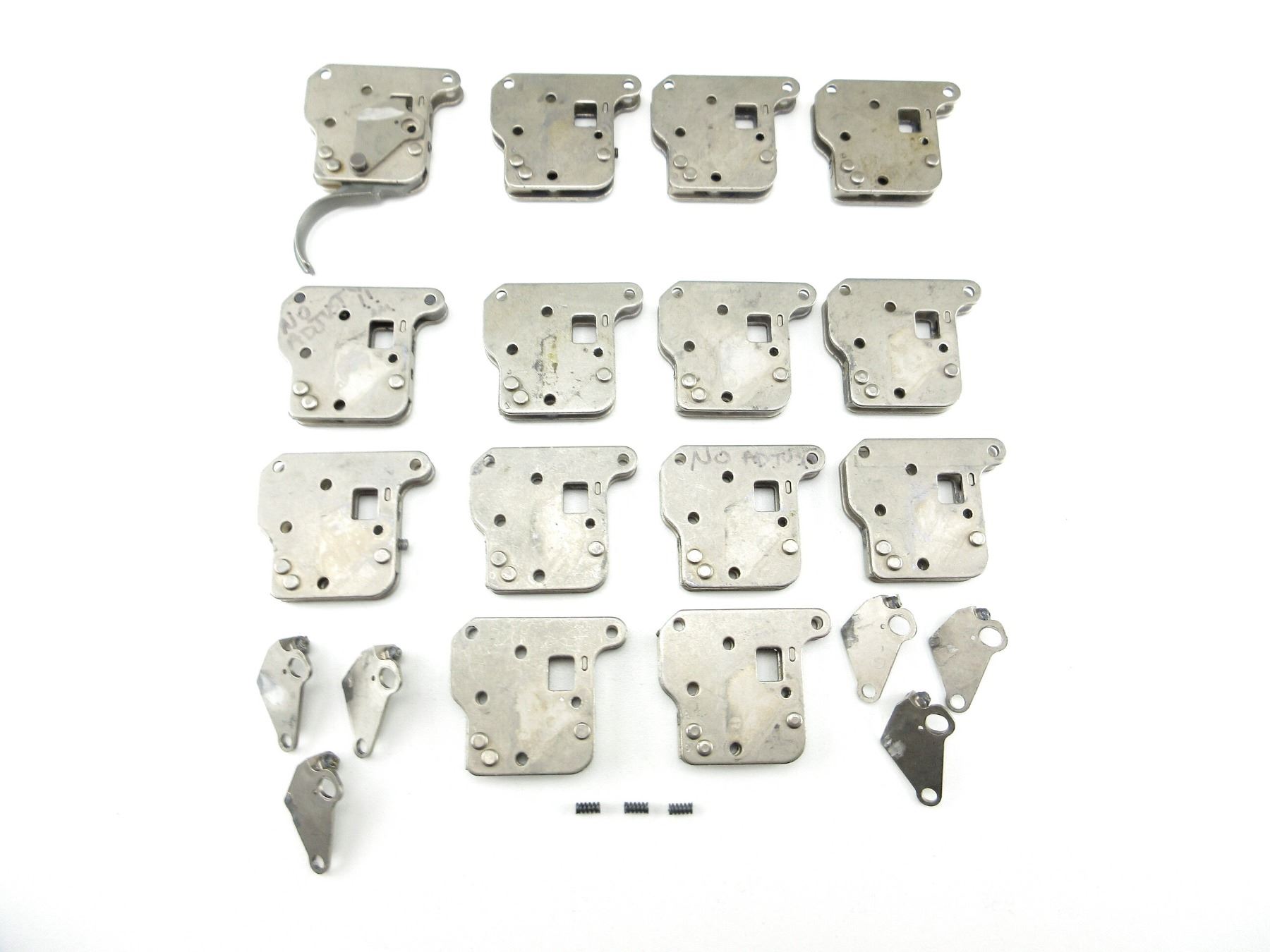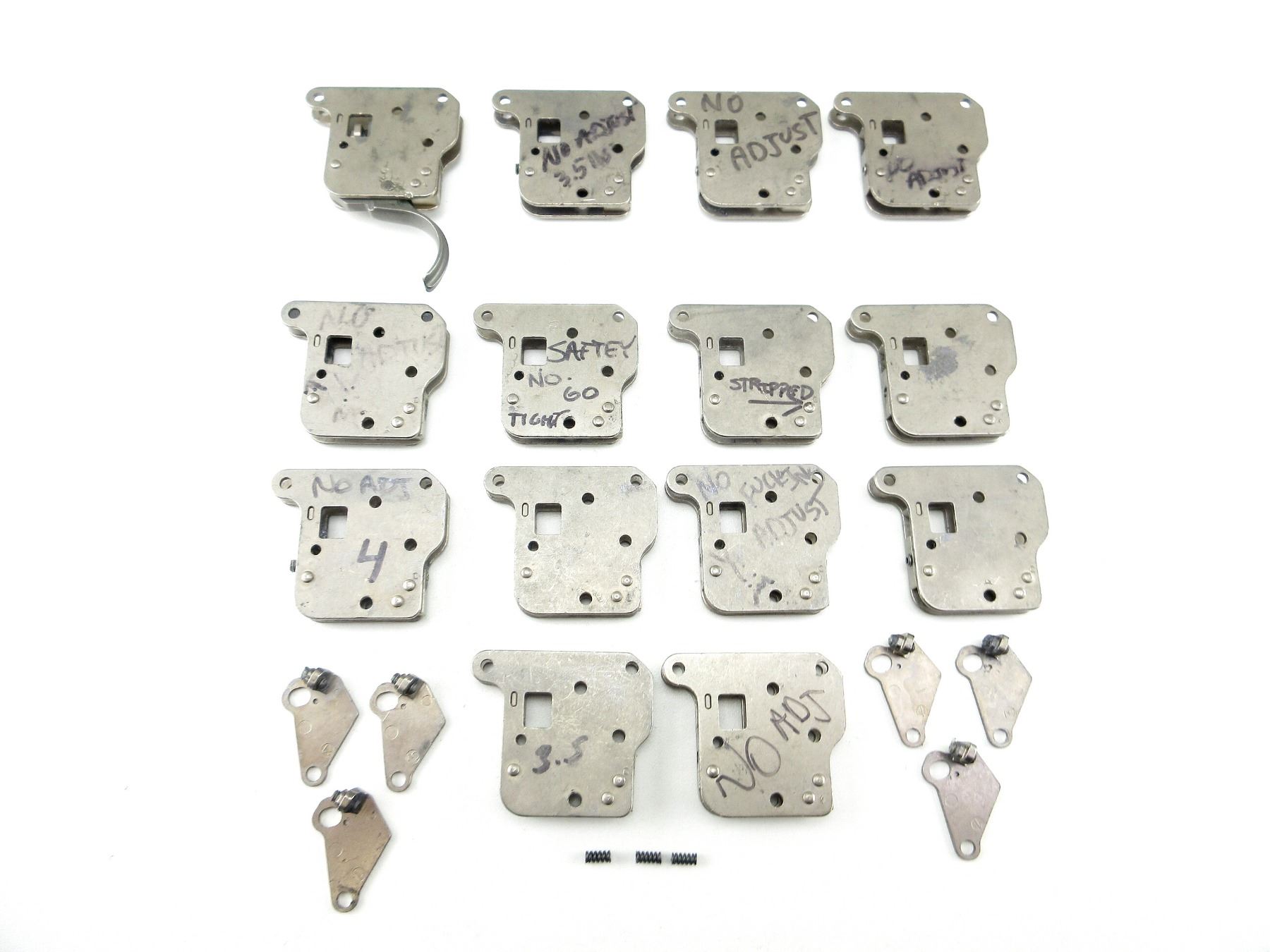 LOT INCLUDES; (13) TRIGGER MECH. HOUSINGS, STAINLESS, MAY CONTAIN A FEW PARTS / SPRINGS / SCREWS / ETC. MAY REQUIRE FITTING. SEE PHOTOS.