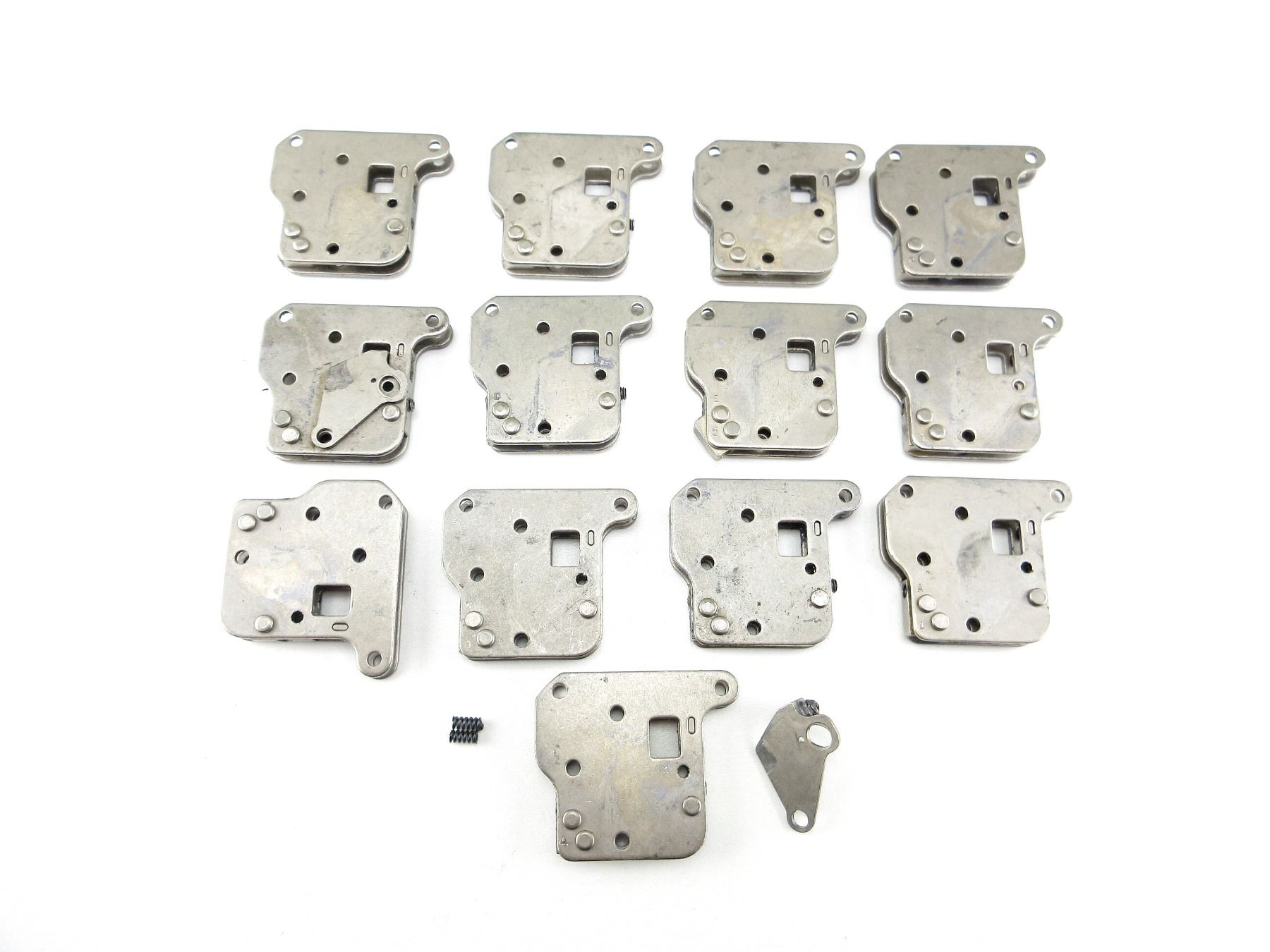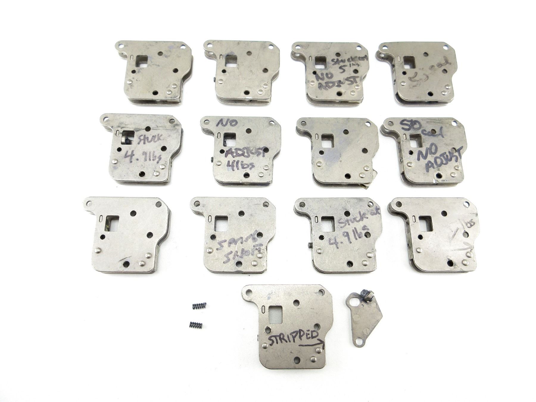 LOT INCLUDES; (13) TRIGGER MECH. HOUSINGS, STAINLESS, MAY CONTAIN A FEW PARTS / SPRINGS / SCREWS / ETC. MAY REQUIRE FITTING. SEE PHOTOS.
