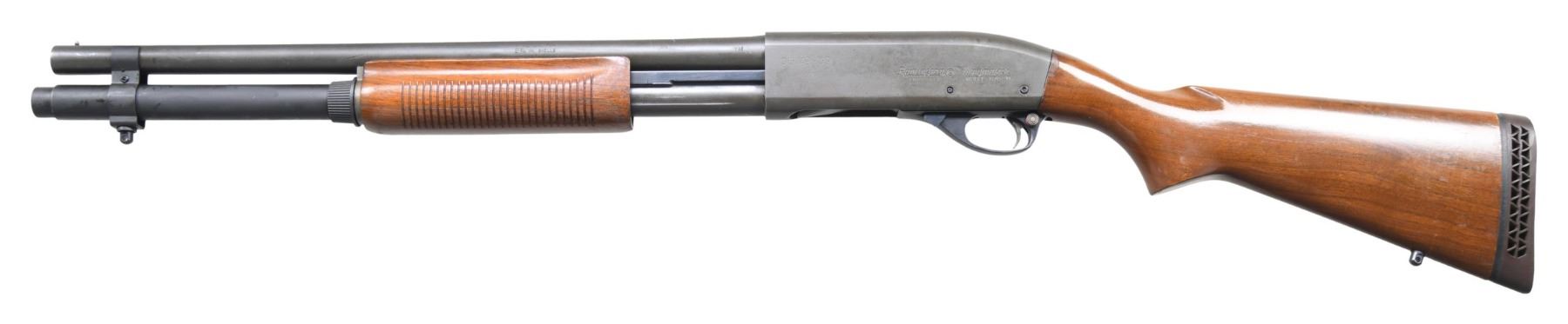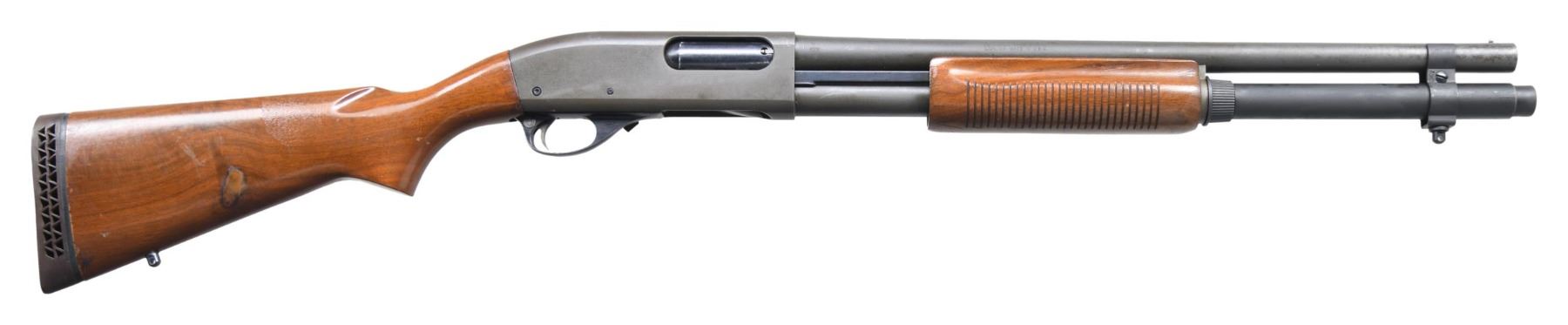 Cal. 12 Ga., 2 3/4". S# T080314V. Bbl. 20" w/ steel bead & cyl. choke; code "AZ" indicates appears to indicate March 1975. Appears to be ex-police w/ parkerized finish & "06179-39" stamp on receiver. Full length mag. tube. Walnut stock set w/ Rem. ventilated pad & sling stud. CONDITION: very good parkerized finish with cycling wear. Good wood finish with epoxy repaired grain check on buttstock & scattered handling marks. Shiny bore shows light fouling. (25-2959/MD). MODERN. $500-800.