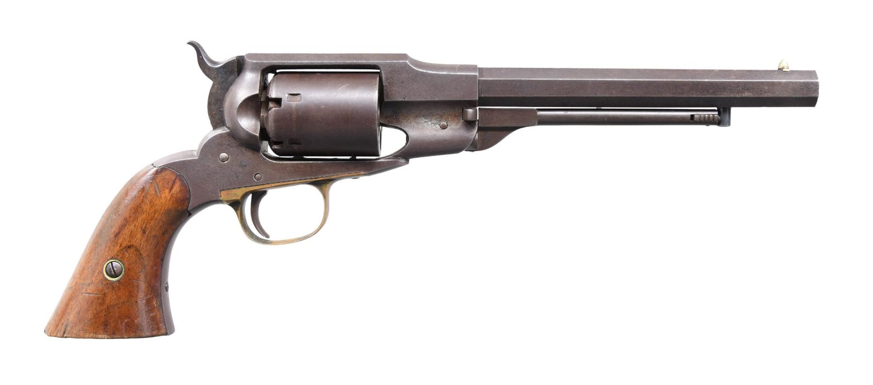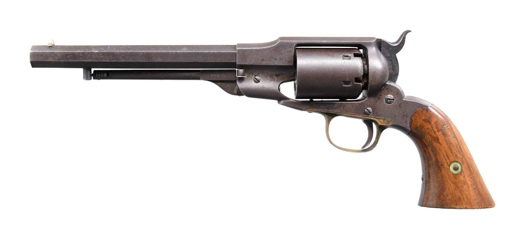 Cal. 36. S# 290. Bbl. 7 1/2" octagon w/ cone style front sight. Six shot round cyl. w/ safety notches & double wing cyl. pin. Blue finish w/ brass trigger guard. 2 piece walnut grips. Estimated quantity of 14,500 mfg. 1861-1862. CONDITION: blue has largely faded to brown showing small spots of corrosion. Brass trigger guard has a spotted dark tarnish. Grips show wear & handling marks, left panel has an added wood repair along backstrap. Sound action. Bore retains sound rifling showing scattered light pitting. PROVENANCE: from the renowned collection of quality sporting arms from Lewis Drake together with inventory of Lewis Drake Associates. (01-26135/DS). ANTIQUE. $1,000-2,000.