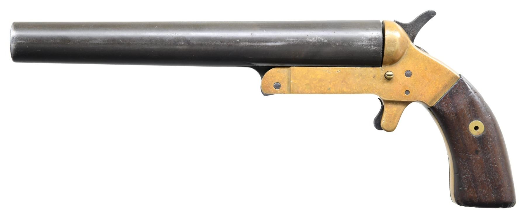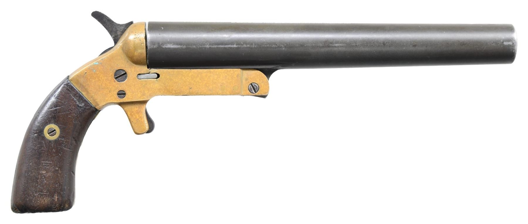 Cal. 10 GA. S# 4-950. Bbl. 9". 1 of approx. 24,500 Mark III flare pistols mfg. by Remington. Top of the bbl. is marked "MARK III", followed by Remington's mfg. information. Bbl. exhibits a blue finish. Brass frame is mounted with 2-piece smooth wood grips. CONDITION: bbl. retains large amounts of its blue finish, with areas of wear and thinning, as well as scattered spots of light pitting overall. Brass frame retains a mellow patina. Bright bore, exhibiting some oxidation and pitting. Grips show scattered marks and impressions from handling and storage, but otherwise remain sturdy and serviceable. (25-2401/MLW). CURIO. $100-300.
