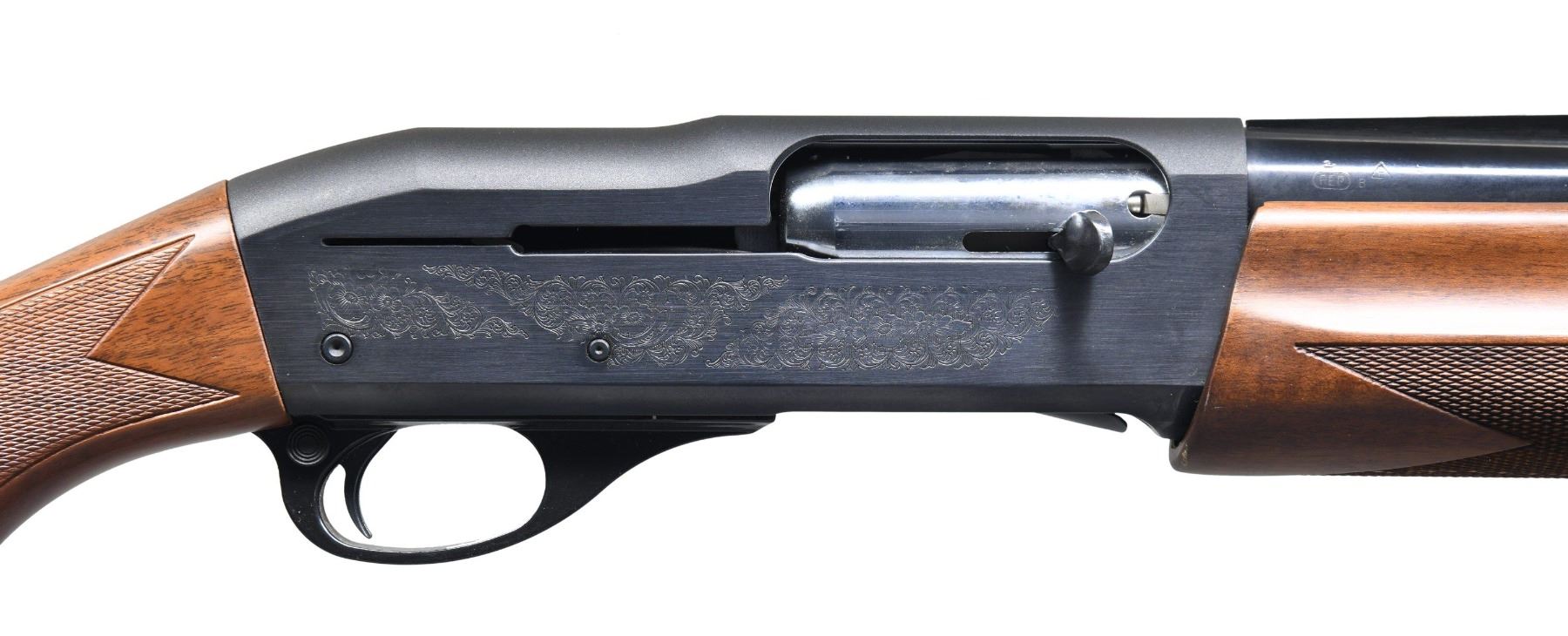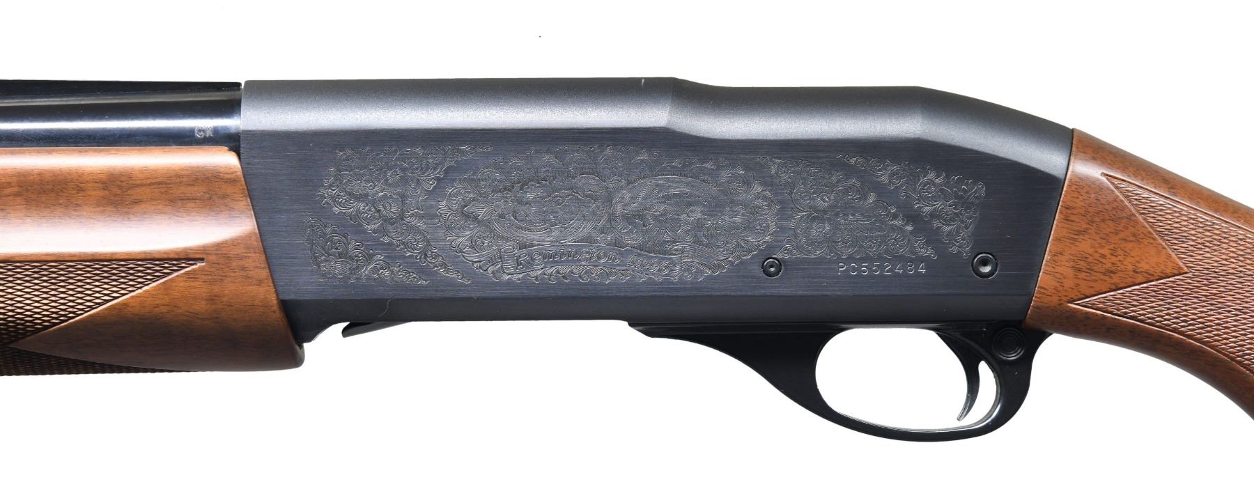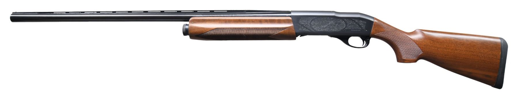 SEMI-AUTOMATIC SHOTGUN. Cal. 12 GA, 2 3/4" or 3". S# PC552484. Bbl. 27 1/2" light contour with V/R and steel bead. Fitted with Remchokes, Mod. tube included. Gas operated action. Lightweight receiver steps down behind chamber area. Action sides have rose and scroll ornamentation. Satin finished ported forearm and pistol grip stock with cut checkering and original solid black Remington pad. The 11-96 was a lightweight version of the 11-87 mfg. 1996-1999. Weight: 7lbs. 3.4oz. CONDITION: over 97% original blue. Stock shows scattered light marks. Forearm has a highly visible nearly full length scratch along the bottom. Very good bright bore. (25-3720/DS). MODERN. $400-600.