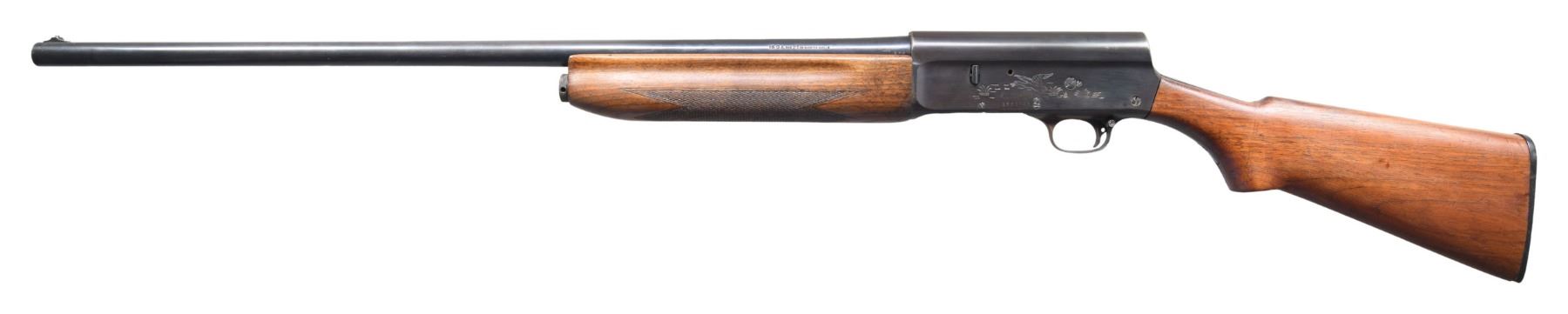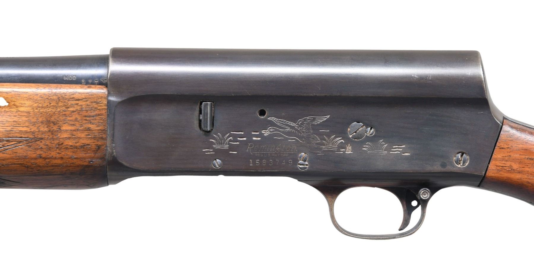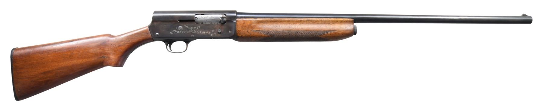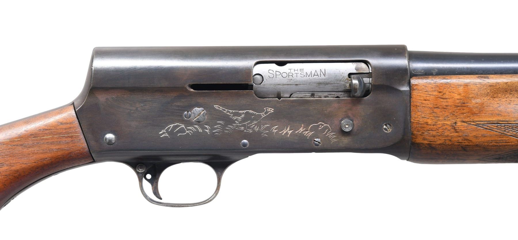 SHOTGUN. Cal. 16 GA, 2 3/4". S# 1583749. Bbl. 28". Model 11 Sportsman semi-automatic shotgun mfg. by Remington. Top of the bbl. is marked with Remington's mfg. information, with the cal. designation, followed by "MOD" marked on the left. Left side of the receiver is engraved with a scene of a duck above the Remington trademark logo and the S#, with the right side exhibiting an engraved scene of a pheasant. Bolt is marked "THE/ SPORTSMAN". Receiver exhibits a reapplied blue finish overall, with the bbl. exhibiting a factory blue finish. Plain wood pistol grip buttstock and checkered wood forend have been sanded and revarnished at one time. Aluminum bead front sight. Matching numbers are present on the receiver and bbl. CONDITION: metal components retain the majority of their reapplied and factory blue finishes, exhibiting some areas of wear and thinning that show through to brown patina. Receiver exhibits areas of light pitting beneath the bluing, with the bbl. exhibiting scattered spots of light surface oxidation. Very bright bore, exhibiting some spots and areas of oxidation. Wood furniture shows scattered marks and minor impressions from handling and storage, but otherwise remains sturdy and serviceable. (25-1451/MLW). CURIO. $300-500.