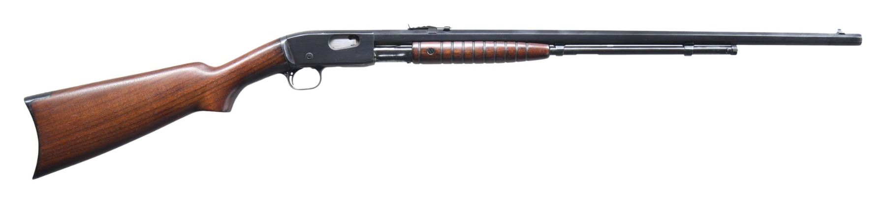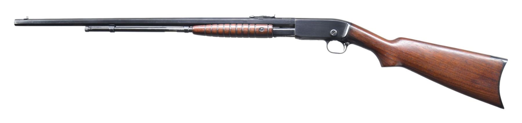 Cal. 22 S, L, LR. S# 359543. Bbl. 24". Model 12 slide action rifle mfg. by Remington UMC. Top flat of the octagonal bbl. is marked with Remington's mfg. and patent information, followed by the Remington trademark logo, with the cal. designation marked on the left quarter flat towards the breech. Metal components exhibit a reapplied blue finish overall, save for on the bolt, which is polished in-the-white. Plain wood pistol grip buttstock, with crescent blued steel buttplate and grooved wood pump. Buttstock and pump have been sanded and revarnished. Dovetailed blade front sight, with dovetailed V-notch rear sight. CONDITION: metal components retain the majority of their reapplied blue finish, exhibiting some spots of wear and thinning, some scattered superficial handling marks, as well as scattered spots of light surface oxidation overall. Bright bore, as refinished, exhibiting mild to moderate pitting, while retaining strong rifling throughout. Wood furniture is very good, as sanded and revarnished, exhibiting a few superficial marks and minor impressions from handling and storage. (25-2506/MLW). CURIO. $250-350.