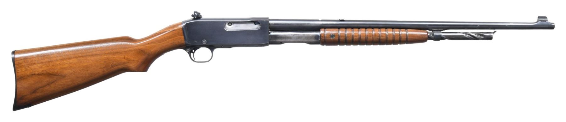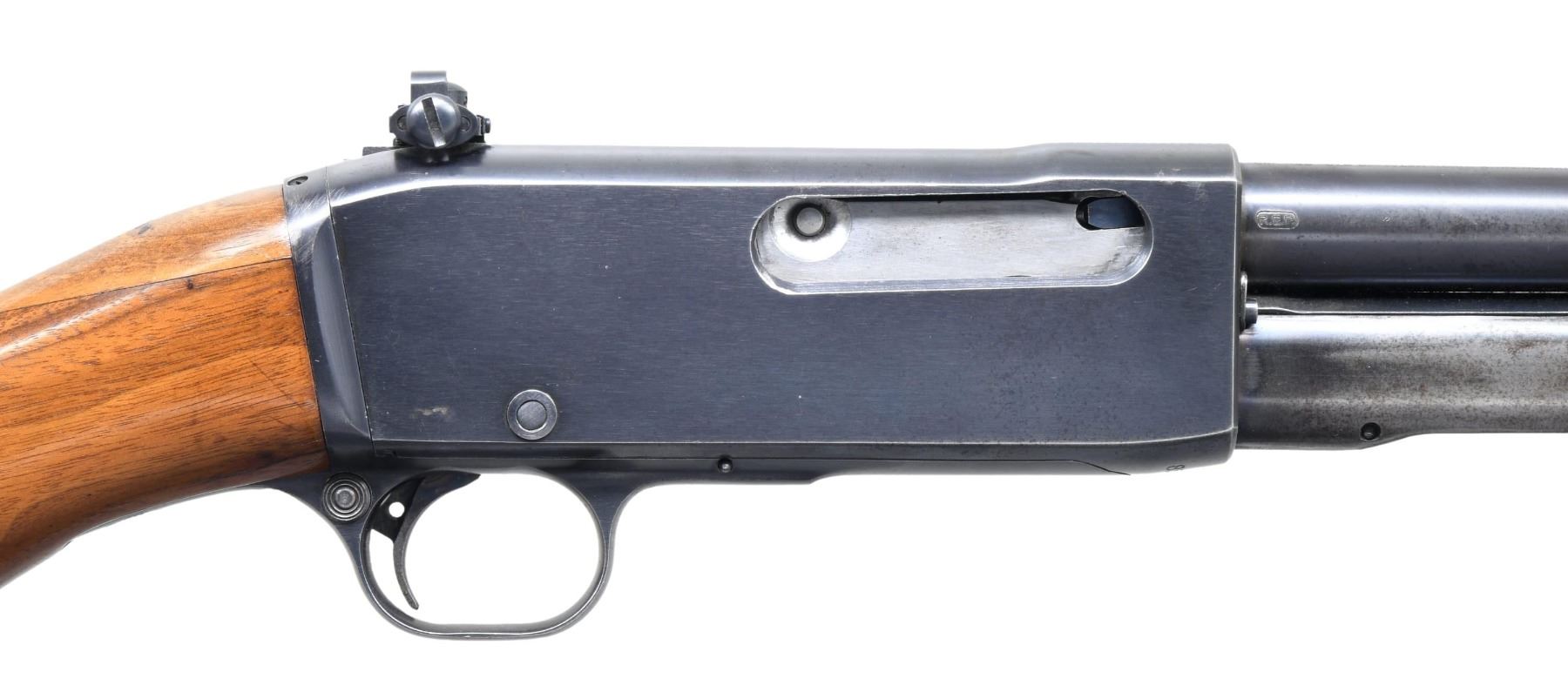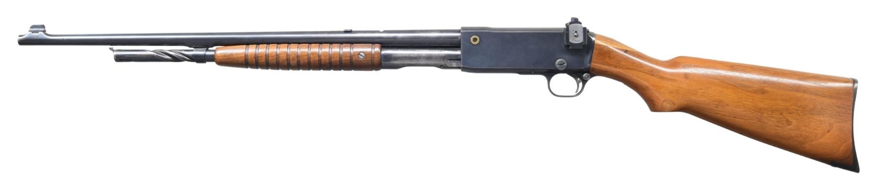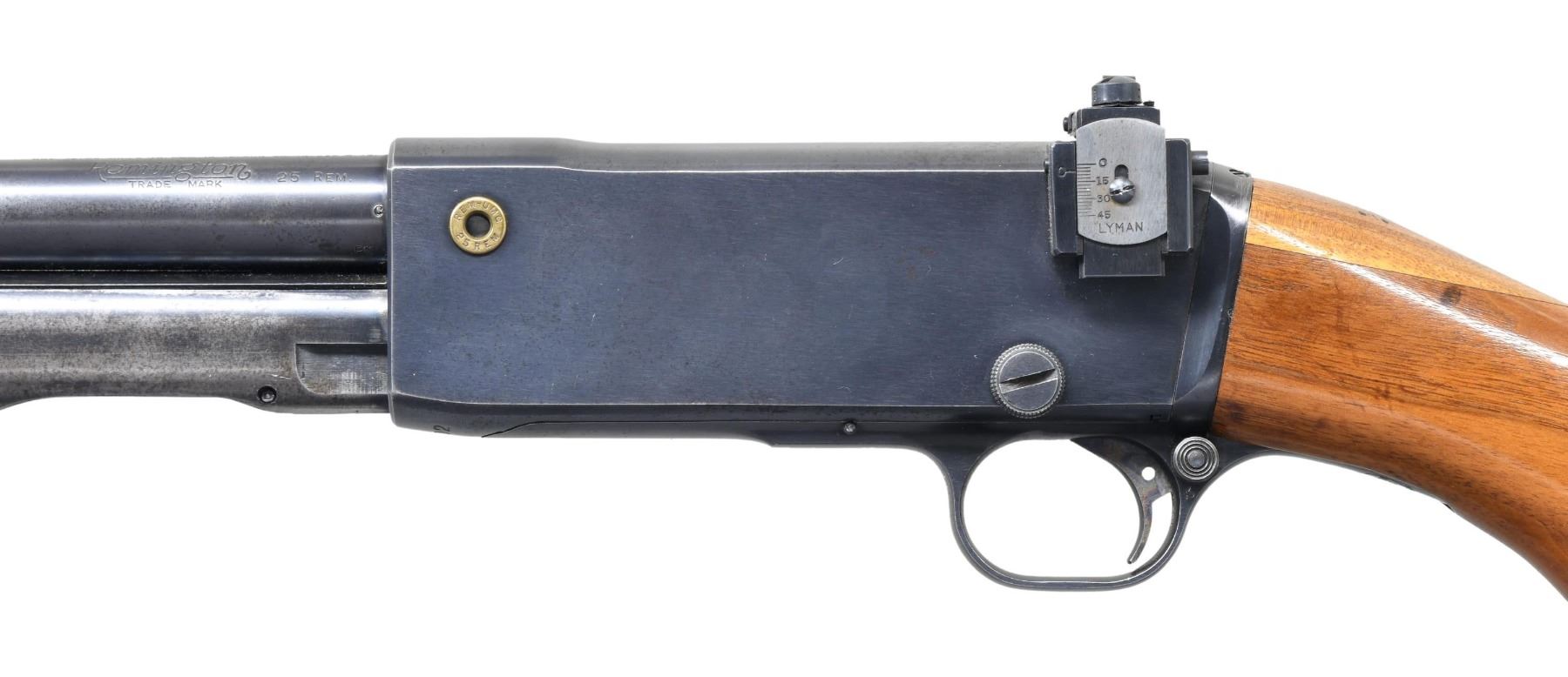 Cal. 25 Rem. S# C85702. Bbl. 21 3/4". Model 14 slide action rifle mfg. by Remington UMC. Top of the bbl. is marked with Remington's mfg. and patent information above the Remington trademark logo, as well as with the cal. designation. Metal components exhibit a blue finish overall, save for on the bolt, which is polished in-the-white. Trigger exhibits a case color hardened finish. Plain wood pistol grip buttstock, with blued steel buttplate and grooved wood pump. Buttstock has been sanded and revarnished, and also exhibits a large section of replaced wood over the top of the wrist. Aftermarket dovetailed blade front sight, with Lyman adj. aperture rear sight. Bbl. rear sight dovetail is fitted with a slot blank. CONDITION: metal components retain the majority of their original factory blue finish, exhibiting some areas of wear and thinning that show through to gray patina, with scattered spots of light surface oxidation present overall. Mirror bore, retaining well defined rifling throughout. Wood furniture shows some scattered superficial marks from handling and storage, as well as the aforementioned repair on the buttstock, but otherwise remains sturdy and serviceable. (25-2433/MLW). CURIO. $300-500.