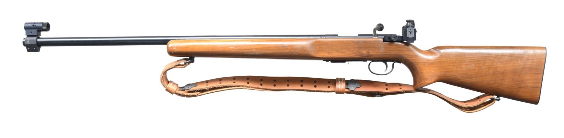 TARGET RIFLE. Cal. 22 LR. S# 147247. Bbl. 27" rnd. of target weight. RPA globe from sight with post reticle included. Lyman receiver sight. Receiver is grooved for tip off scope mounts. Case colored bolt handle and cocking piece with cocking indicator. Walnut target stock with accessory rail and impressed checkered steel buttplate. MRT leather sling on original swivels. Mfg. from 1940-1968. MAGS: 1 detachable 5-rd. CONDITION: over 95% original blue. Stock shows areas of finish loss with scattered scratches and marks. Very good bright bore. (25-3773/DS). CURIO. $400-600.