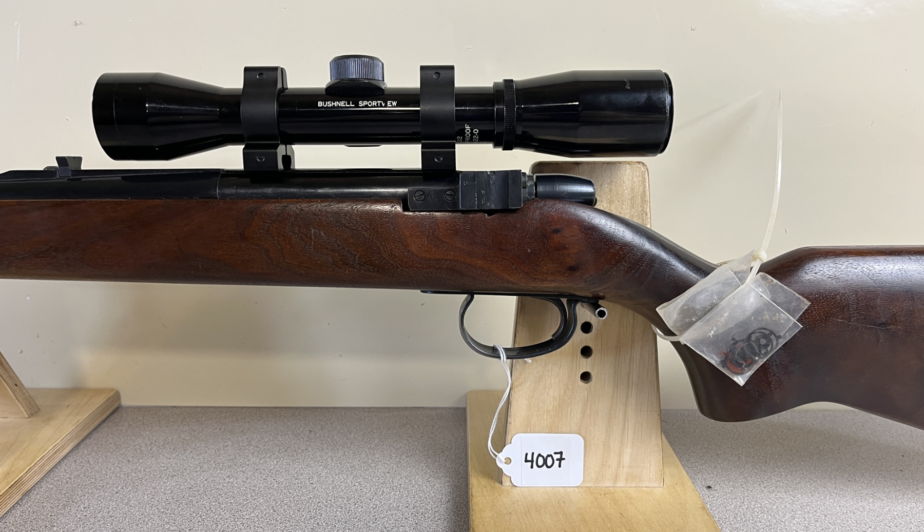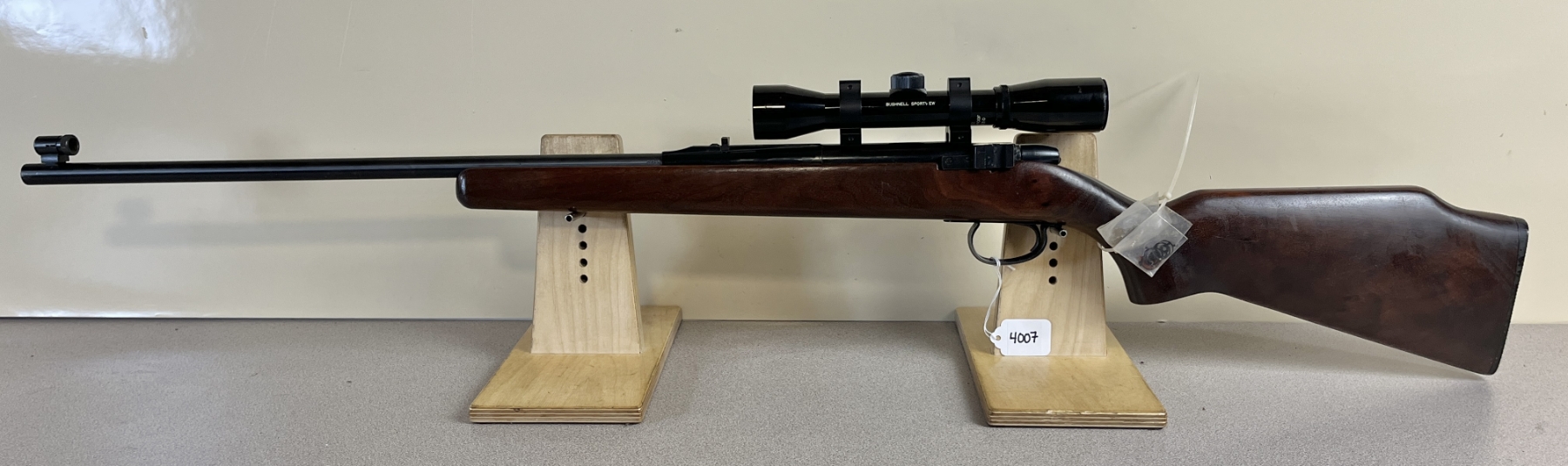 CONDITION: G-VG OVERALL INCL BORE. SPECS: 24IN BBL. EXTRAS: BUSHNELL 4 X 32 SCOPE. CLEAR W/ CROSSHAIRS. ASSORTED APERTURE FOR FRONT SIGHT. S/N: NONE.