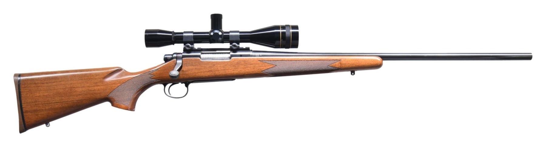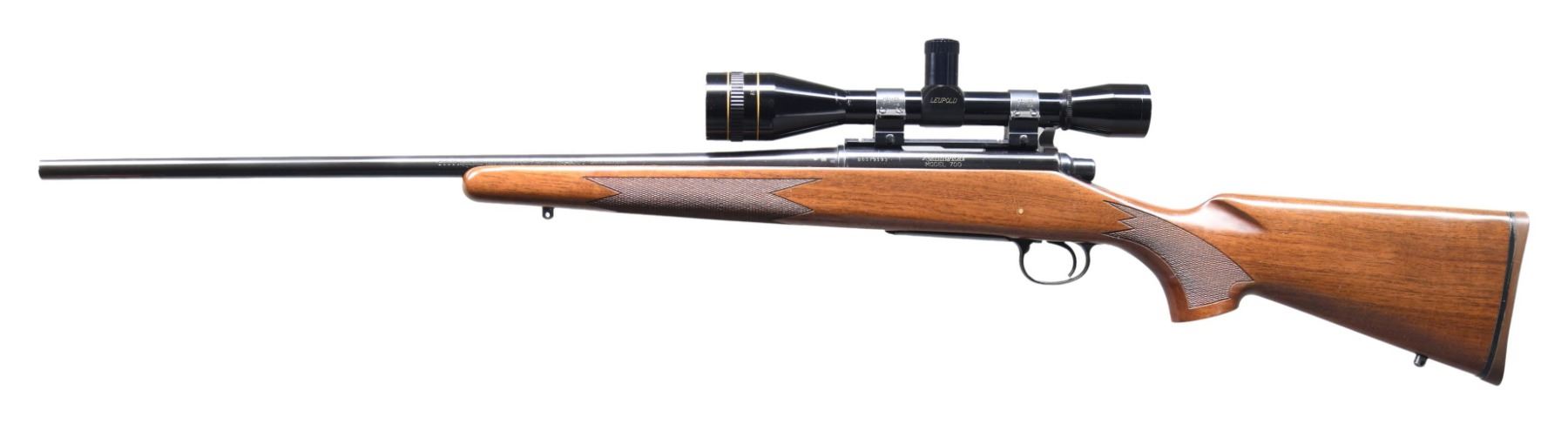 BOLT ACTION RIFLE. Cal. 250 Sav. S# B6579193. Bbl. 24". Model 700 Classic Limited Edition bolt action rifle mfg. by Remington in 1984. Left side of the bbl. is marked with Remington's mfg. information, followed by the cal. designation. Left side of the receiver is marked with the S#, followed by the Remington trademark logo above "MODEL 700". Receiver, bbl., bolt handle, and bolt shroud exhibit a blue finish, with the bolt being jeweled. Aluminum trigger guard and floorplate exhibit a black enamel type finish. 1-piece checkered wood pistol grip buttstock, with Remington textured brown rubber recoil pad. Bolt matches the receiver via the last 4-digits "9193", which is electro-penciled on the underside of the body. Receiver is drilled and tapped with a scope rail, featuring Weaver 1" scope rings, fitted with a Leupold Gold Ring fixed 8x scope. CONDITION: metal components retain the vast majority of their original factory blue finish, exhibiting a few spots of light edge wear, with some superficial handling marks present overall. Mirror bore, retaining well defined rifling throughout. Stock shows some superficial marks and minor impressions from handling and storage, but otherwise remains sturdy and serviceable. Scope retains a clear and sharp optic. (25-2430/MLW). MODERN. $600-900.
