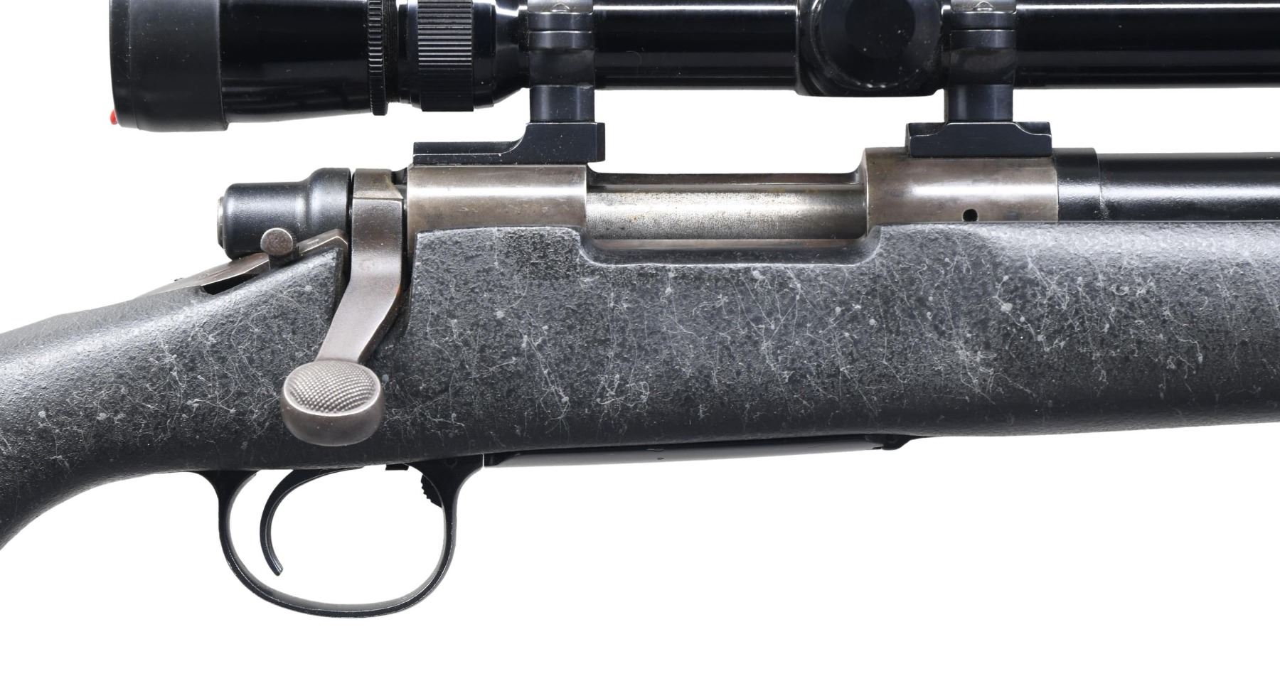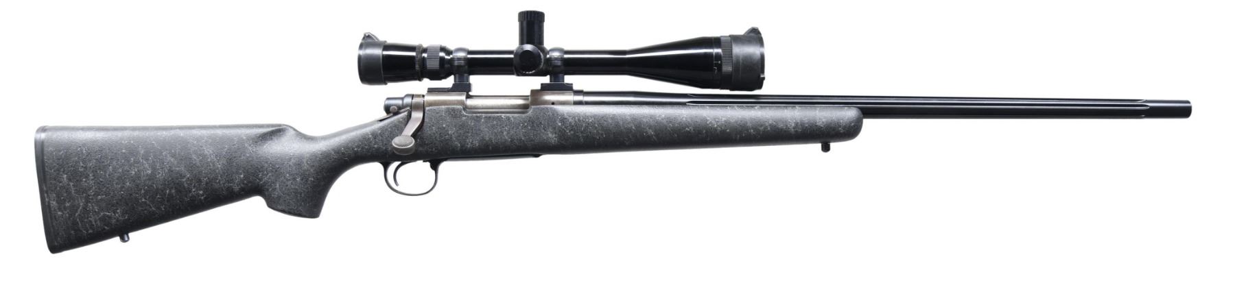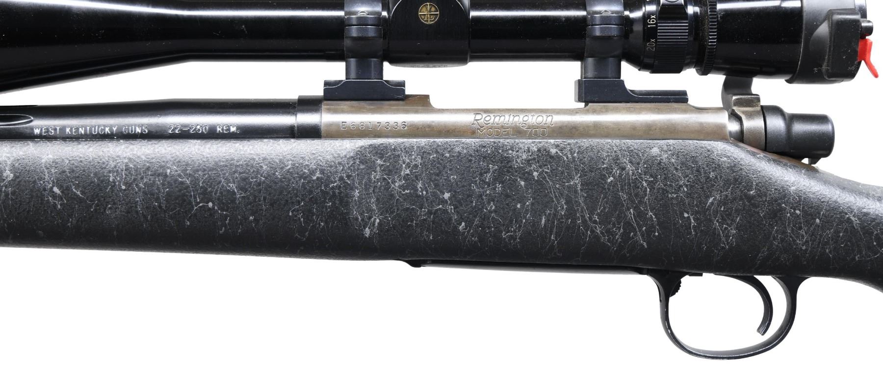 RIFLE. Cal. 22-250. S# E6817336. Bbl. custom 24 1/2" fluted varmint weight marked "WEST KENTUCKY GUNS". Action features hinged floorplate. Synthetic stock w/ textured black & gray finish. LOP: 13 3/8" over an Uncle Mike's thin black rifle pad. Leopold Vari-X III 6.5-20x50 EFR gloss finished scope w/ duplex reticle on 2 piece Leopold mounts. Weight w/ scope: 8 lbs, 15.4 oz. CONDITION: action has gray coloration from touch-up finish. Bbl. & floorplate retain 90% black painted finish. Very good bore. Scope has bright optics. PROVENANCE: from the renowned collection of quality sporting arms from Lewis Drake together with inventory of Lewis Drake Associates. (24-6577/DS). MODERN. $800-1,200.