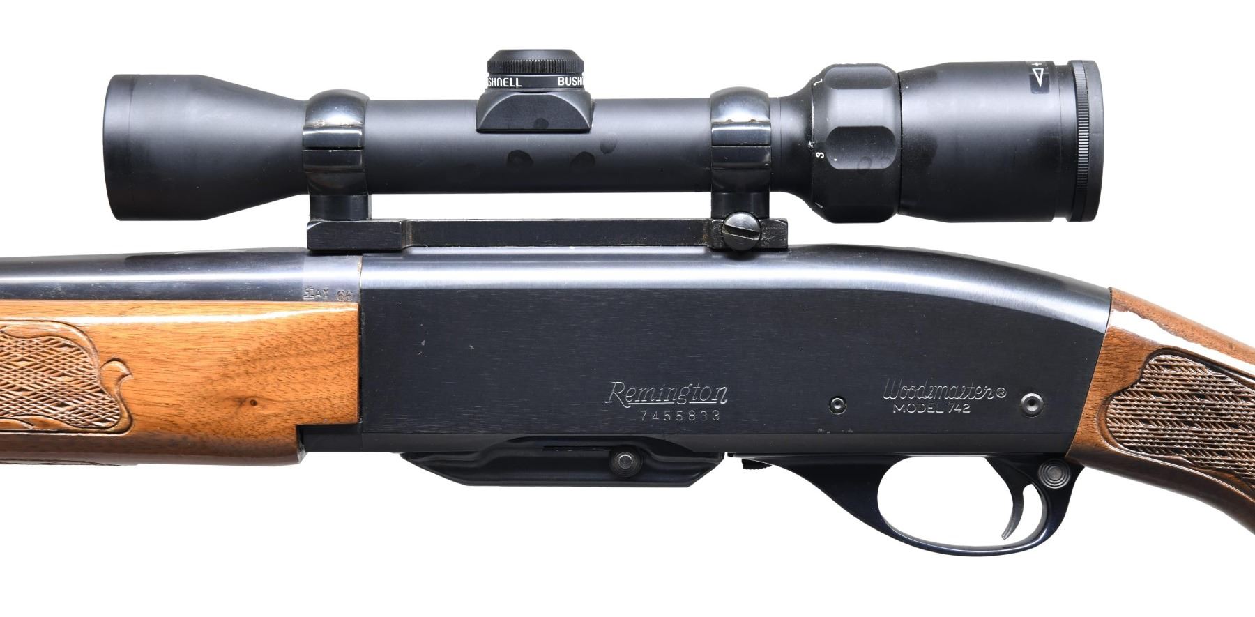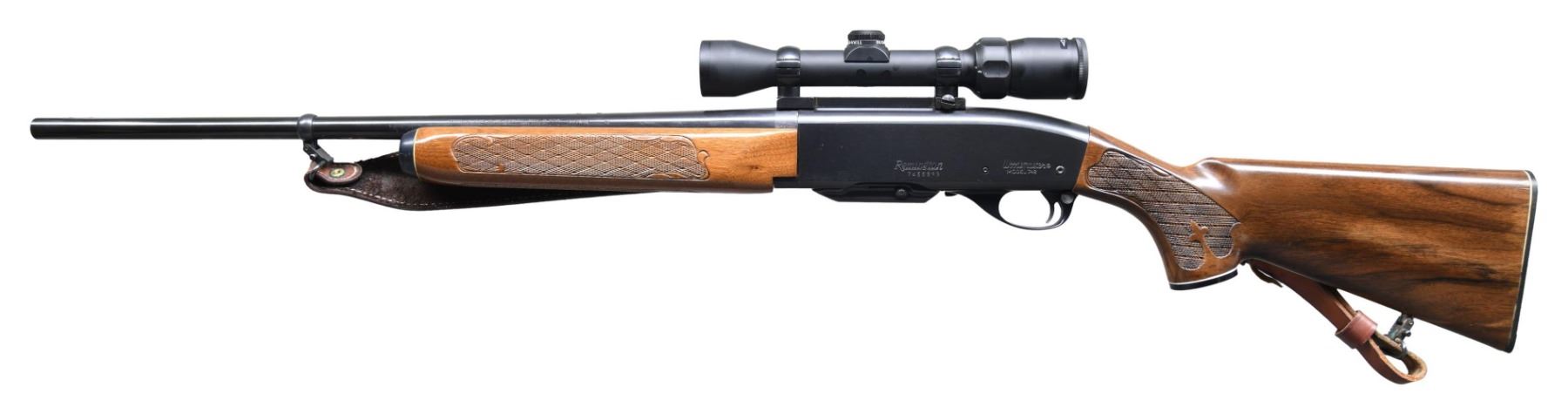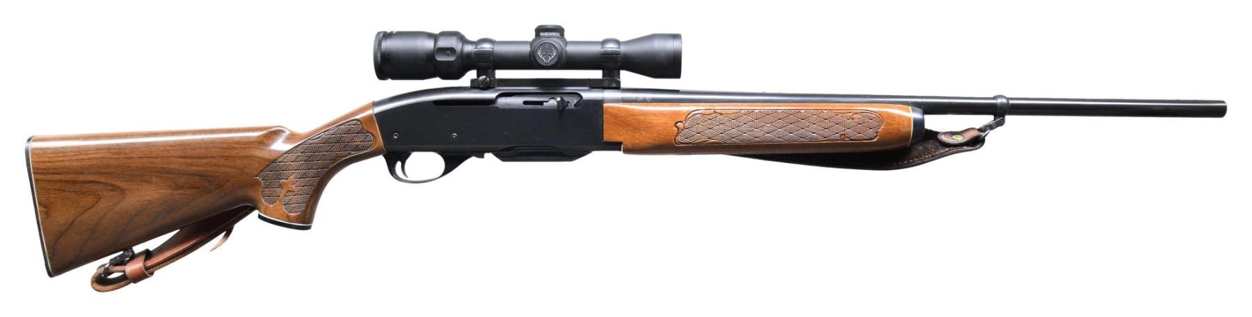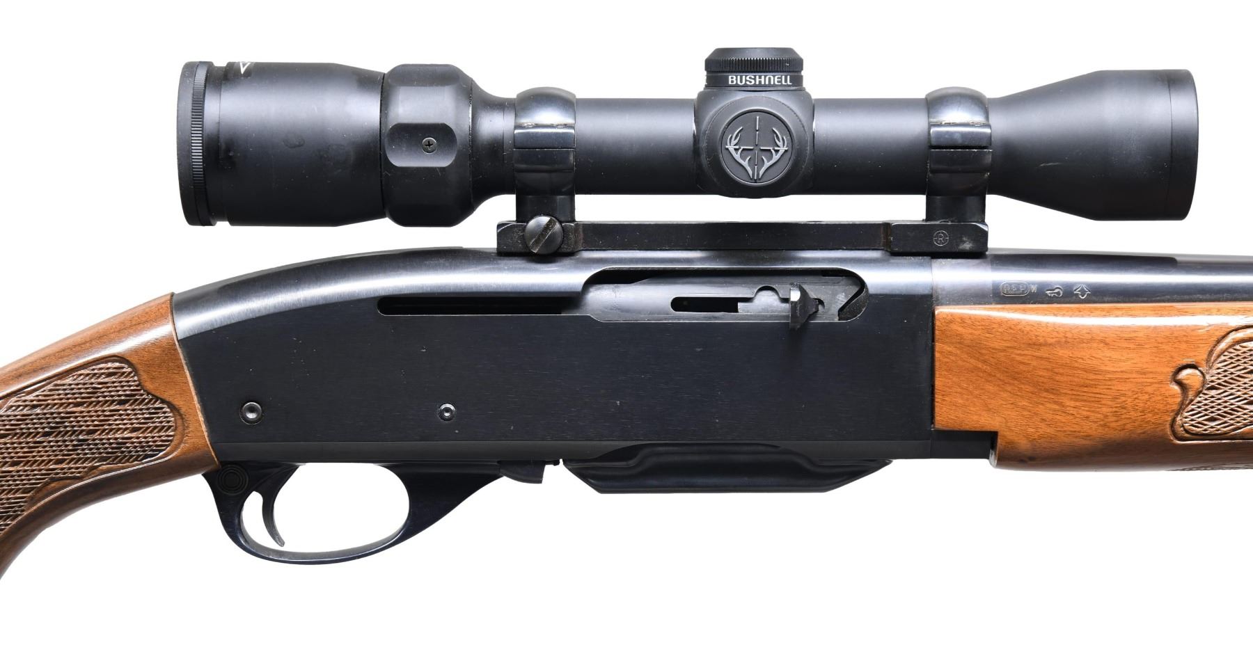 RIFLE. Cal. 308 Win. S# 7455833. Bbl. 22" rnd. with filler screws in holes for iron sights. Bushnell 1.75-4x32 matte finished scope with Circle-X reticle. Blue finish. Walnut forearm and plastic capped pistol grip stock have impressed checkering and original buttplate. Unmarked beavertail sling on QD swivels. MAGS: 1 detachable 4-rd. CONDITION: over 95% original blue. Forearm has good finish. Stock has darker finish and may be replacement, showing water damage warping around the buttplate. Bright near excellent bore. Scope has clear optics. (25-3589/DS). MODERN. $300-500.