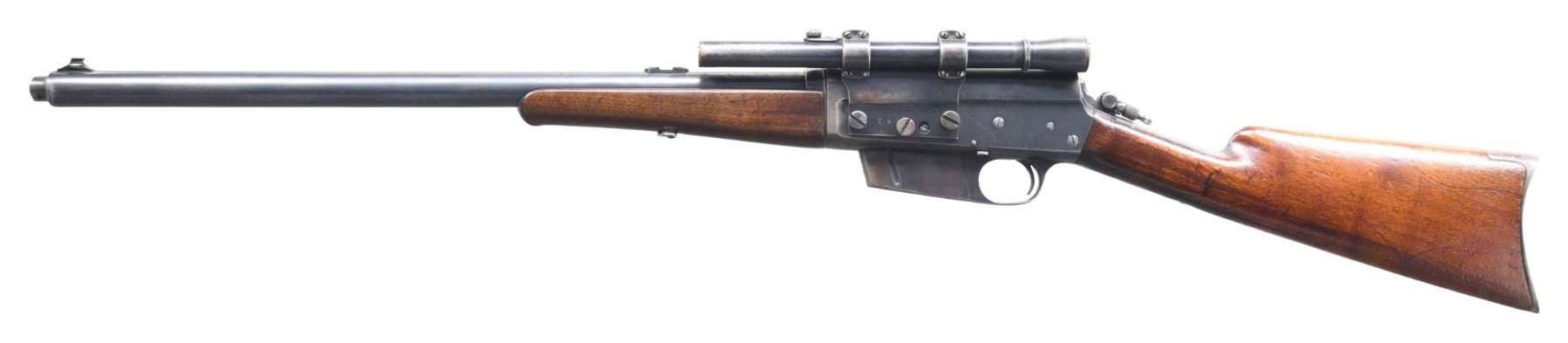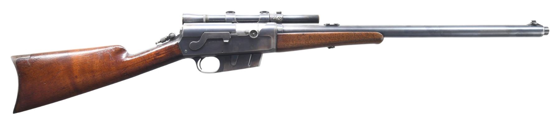 Cal. 30 Rem. S# 41289. Bbl. 22". Model 8-A semi-automatic rifle mfg. by Remington. Top of the bbl. shroud is marked with the model designation, followed by Remington's mfg. and patent information. Metal components exhibit a blue finish overall, save for on the bolt assembly, which is polished in-the-white. Plain wood straight grip buttstock and forend, with crescent Remington UMC marked buttplate. Buttstock has been sanded and revarnished at one time. Dovetailed blade front sight. Rear sight is absent. Receiver is drilled and tapped with a scope mount marked "T8", which is fitted with a Weaver J2.5 scope. MAGS: 1 5-rd. CONDITION: metal components retain large amounts of their original factory blue finish, exhibiting areas of wear and thinning that show through to gray and brown patinas, scattered superficial handling marks, as well as scattered spots of light surface oxidation/pitting overall. Mirror bore, retaining well defined rifling throughout. Wood furniture shows scattered marks and minor impressions from handling and storage, but otherwise remains sturdy and serviceable. (25-2148/MLW). CURIO. $300-600.