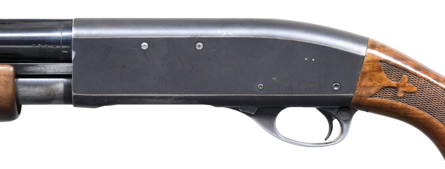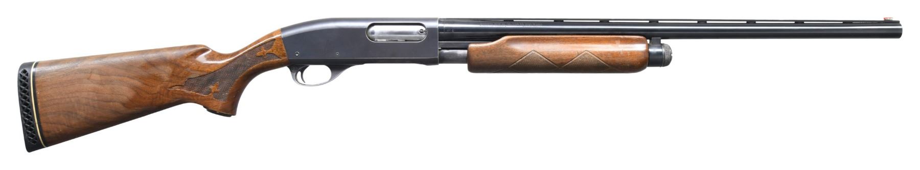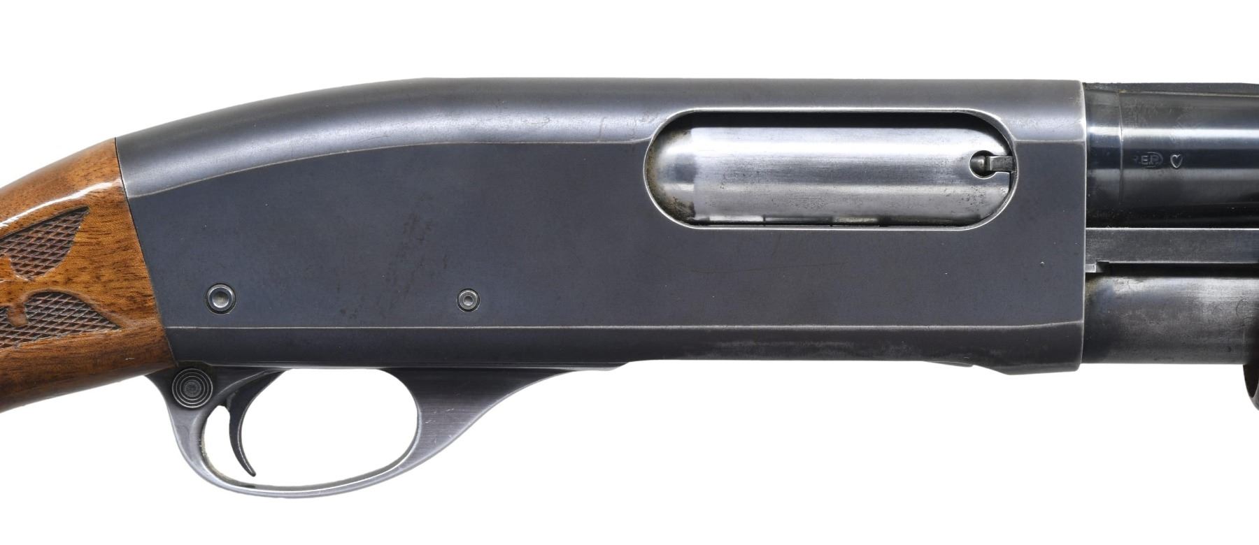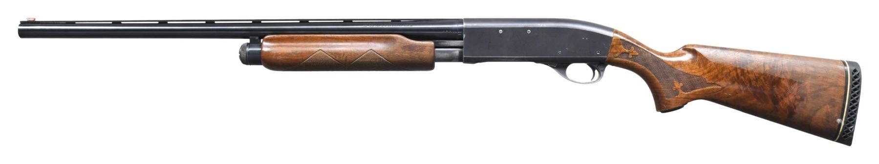SHOTGUN. Cal. 12 GA, 2 3/4". S# 186138V. Bbl. 24". Model 870 Wingmaster pump action shotgun mfg. by Remington. Left side of the bbl. is marked with the cal. designation, followed by "FULL", with Remington's mfg. and patent information marked on the right. Metal components exhibit a blue finish overall, save for on the bolt, which is polished in-the-white. Aluminum trigger guard exhibits a black anodized finish. Inverse checkered wood pistol grip buttstock, with checkered wood pump. Stock has been lightly sanded, removing the varnish at the rear. Grooved V/R, with red fiber optic front sight. Bbl. is fitted with a threaded choke, with is lightly marked "5" on the side. CONDITION: receiver retains large amounts of its blue finish, exhibiting wear and thinning that shows through to gray patina, with light surface oxidation/pitting present overall. Bbl. retains bountiful amounts of its blue finish. Trigger guard exhibits wear and thinning overall that shows through to gray patina. Mirror bore, exhibiting what appears to be some streaks of hardened firing residue throughout. Wood furniture shows scattered marks and impressions from handling and storage, as well as the aforementioned sanding to the buttstock, but otherwise remains sturdy and serviceable. (25-2498/MLW). MODERN. $250-350.