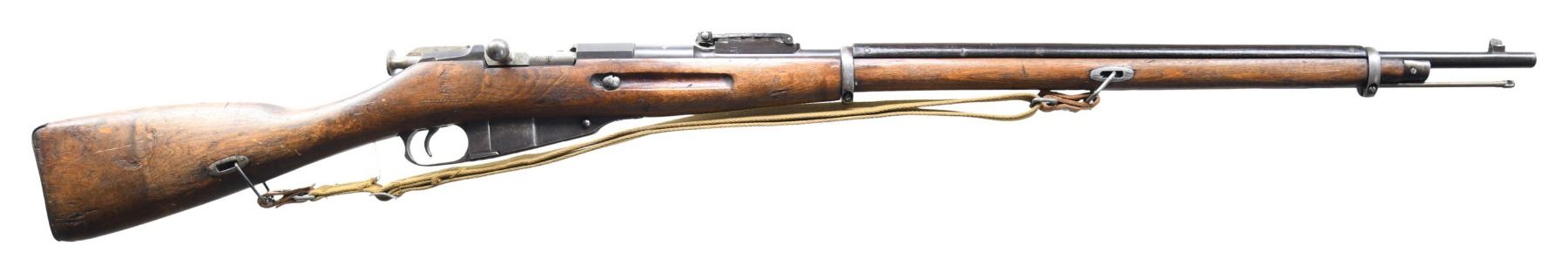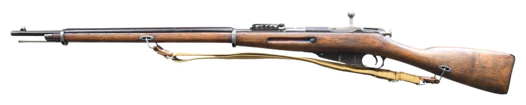 Cal. 7.62x54R. S# 1344295. Bbl. 31 1/2".Blade front sight. Ladder rear sight graduated to 1200 Arshins. Mismatched numbers throughout. Rifle has no visible import or Finnish markings & maybe a former Spanish Republican rifle. Bbl. shank has Remington markings with intact Czarist crown & 1917 date. Bbl. shank & receiver markings also have added white highlight paint. Arsenal reworked blue finish. Hardwood stock set with darker handguard & bottom mounted sling hangers with canvas sling. Cleaning rod present. CONDITION: arsenal rework stock set shows a crack on handguard, a further small crack on right side of forend ahead of rear band, some chipping, scattered dings, staining & handling marks. Metal retains 50% arsenal rework blue with scattered edge wear, fading to gray & some light pitting at muzzle. Action functions properly when hand cycled. Fair bore with strong rifling but scattered light pitting & frosting. (25-2217/MJC). CURIO. $400-600.