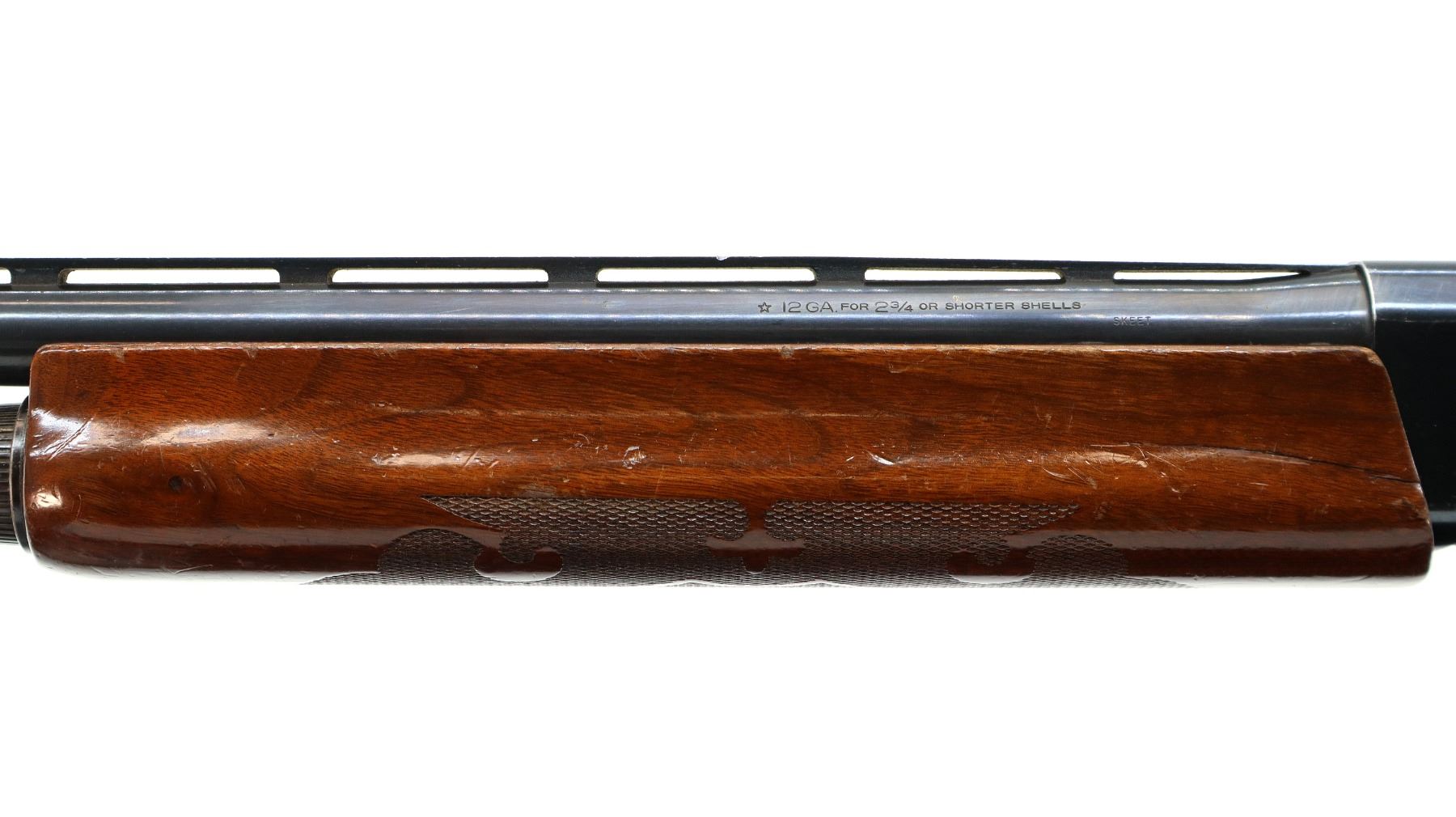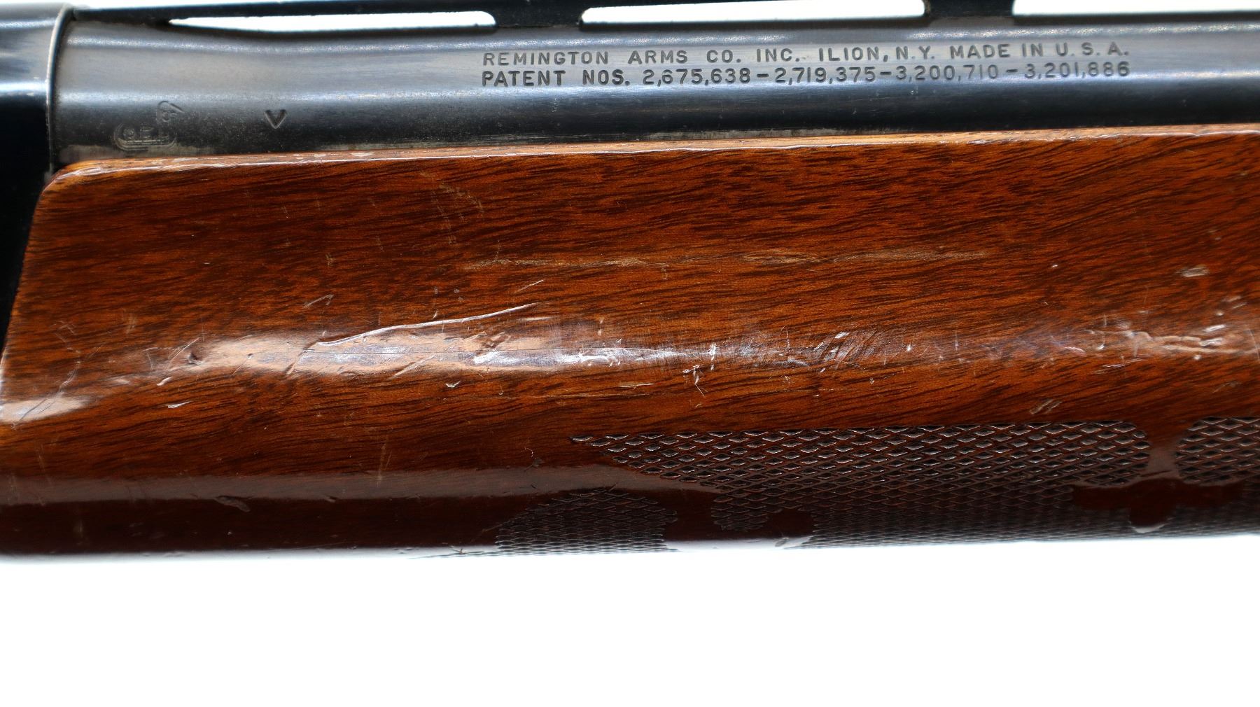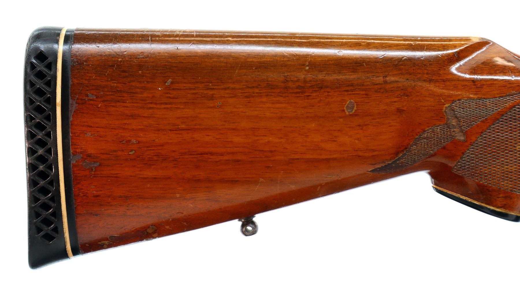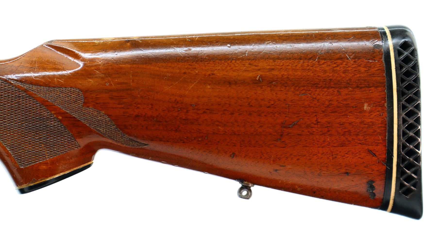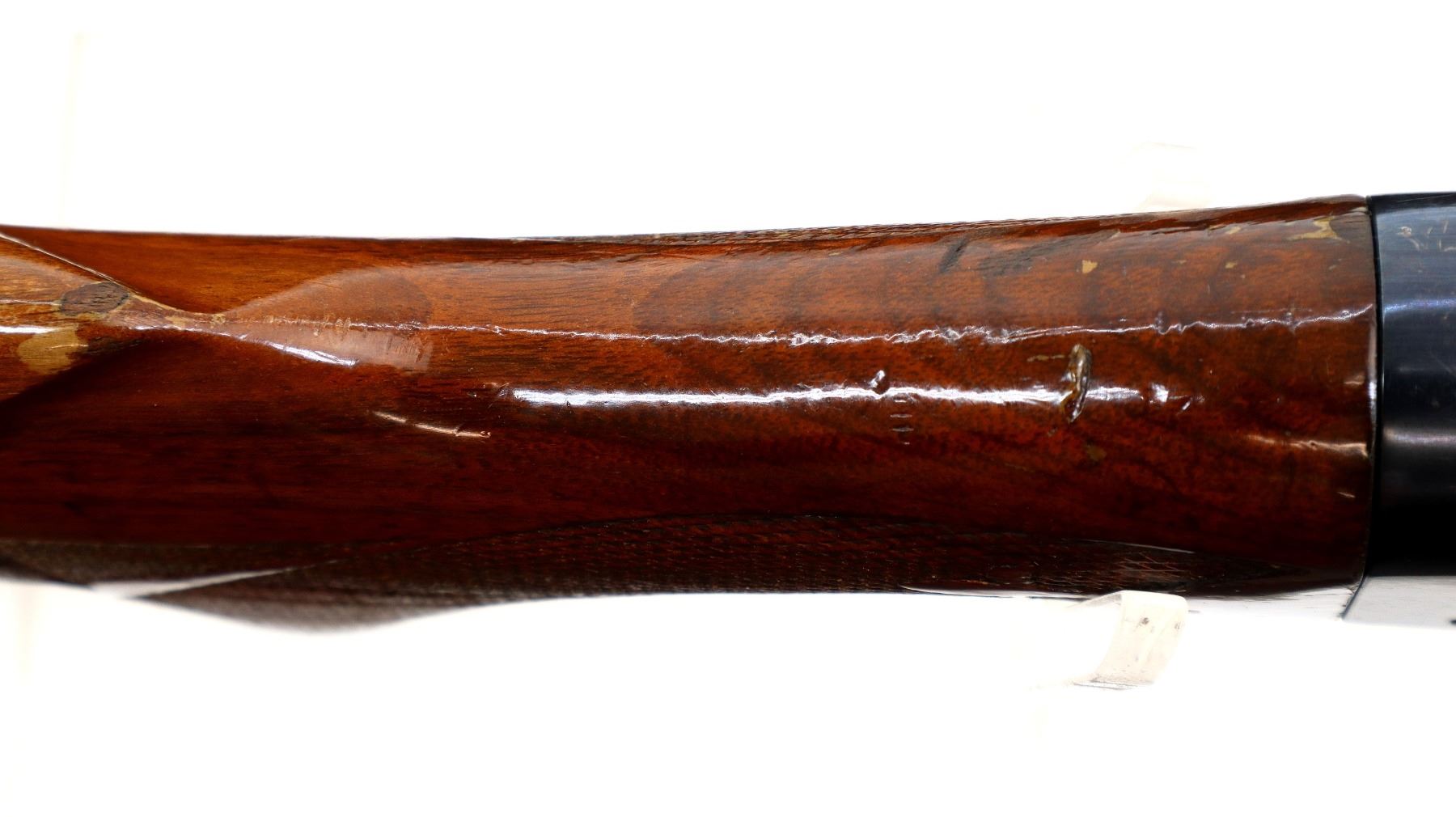Main Description: Red fiber optic front and silver mid rib beads, blued finish, vent rib, engraved receiver and bolt. Two piece wood stocks, checkered forearm which is cracked, checkered pistol grip, black vented rubber recoil pad, 14" LOP, grip cap, swivel studs. Top of receiver drilled and tapped with no plug screws installed