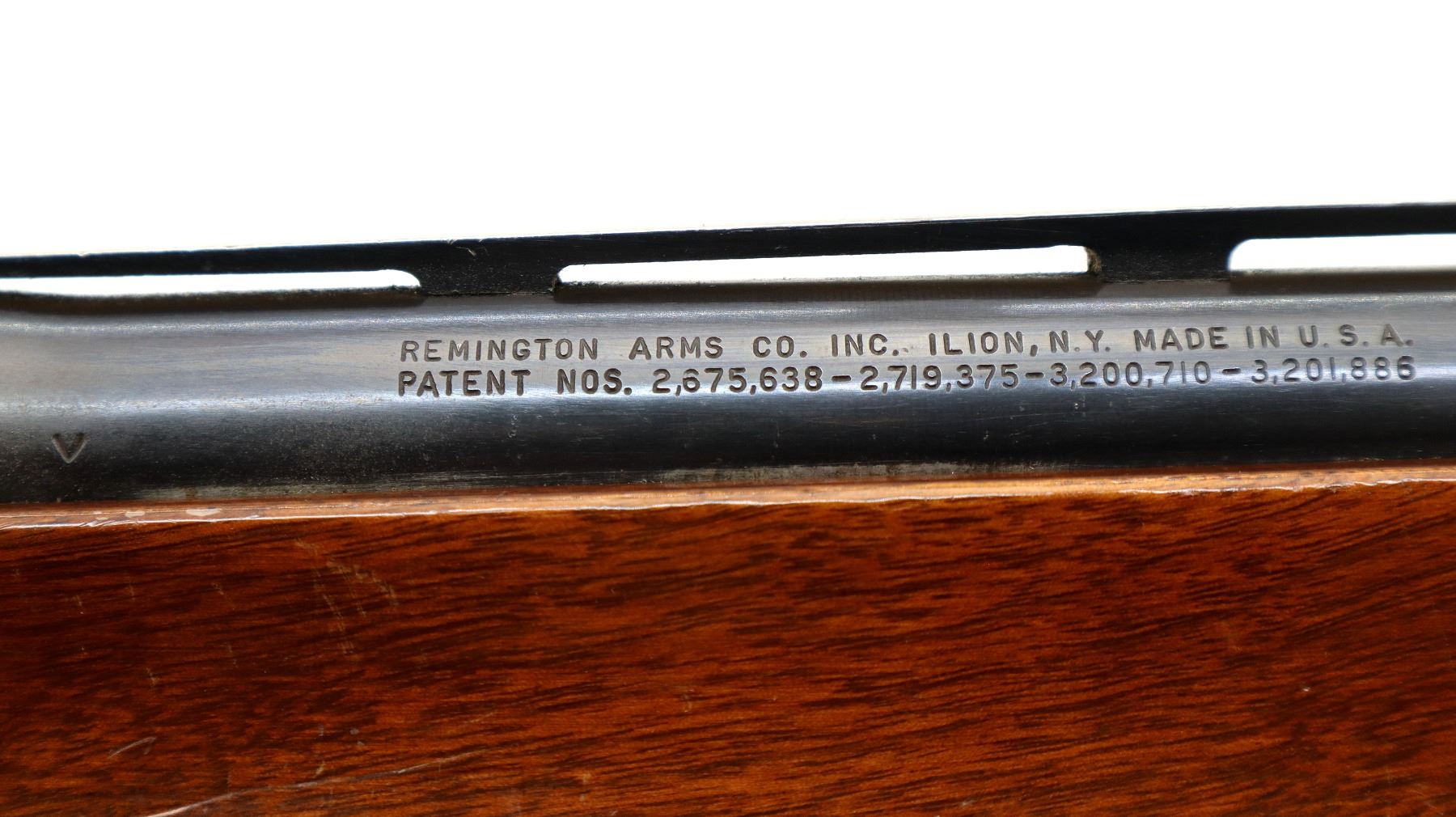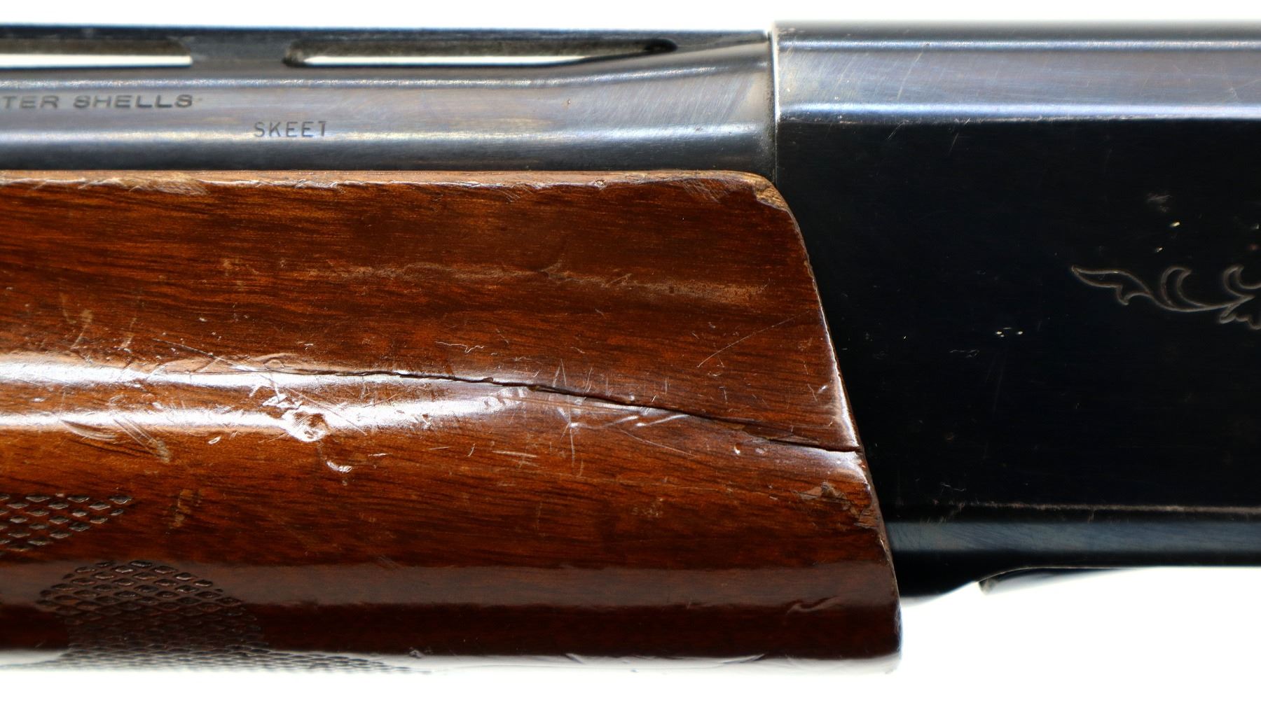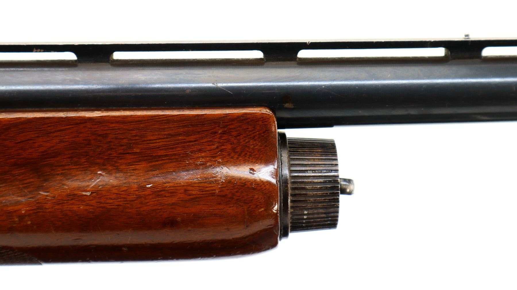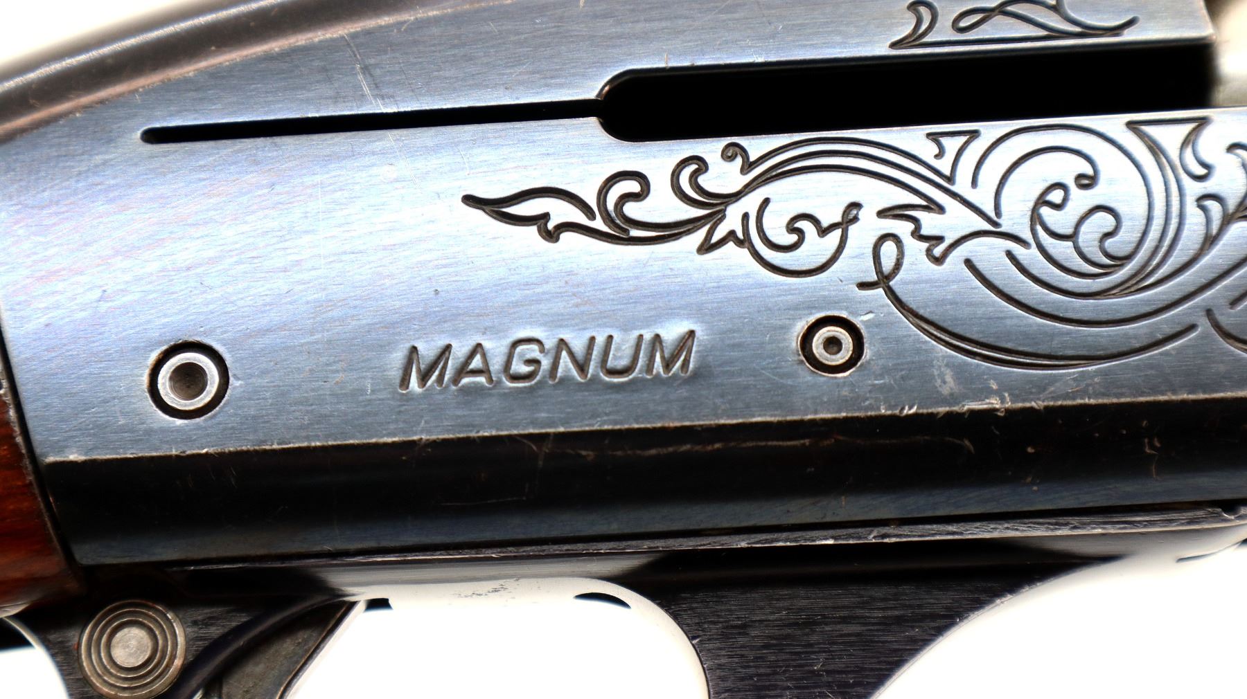 Main Description: Red fiber optic front and silver mid rib beads, blued finish, vent rib, engraved receiver and bolt. Two piece wood stocks, checkered forearm which is cracked, checkered pistol grip, black vented rubber recoil pad, 14" LOP, grip cap, swivel studs. Top of receiver drilled and tapped with no plug screws installed