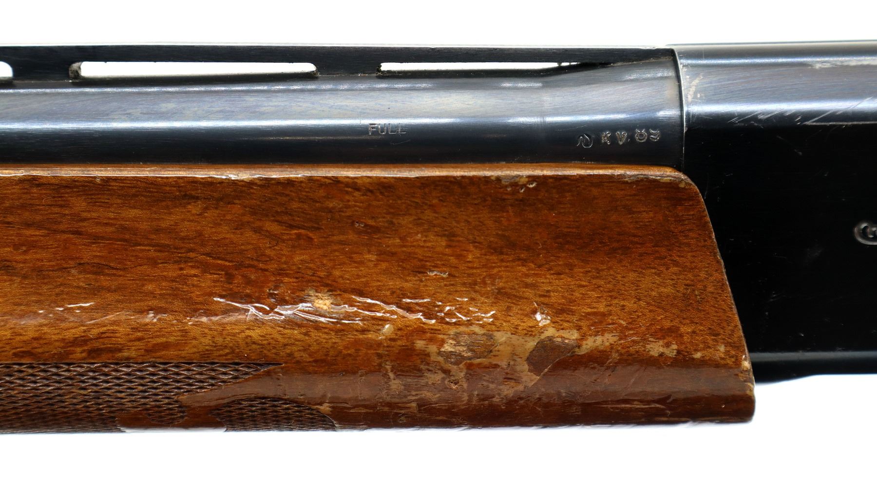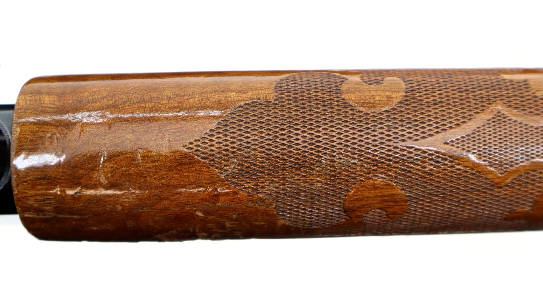 Main Description: Silver bead, blued finish, vent rib, engraved receiver and bolt. Two piece wood stocks, checkered forearm which is cracked, checkered pistol grip, black vented rubber recoil pad, 14" LOP, grip cap.