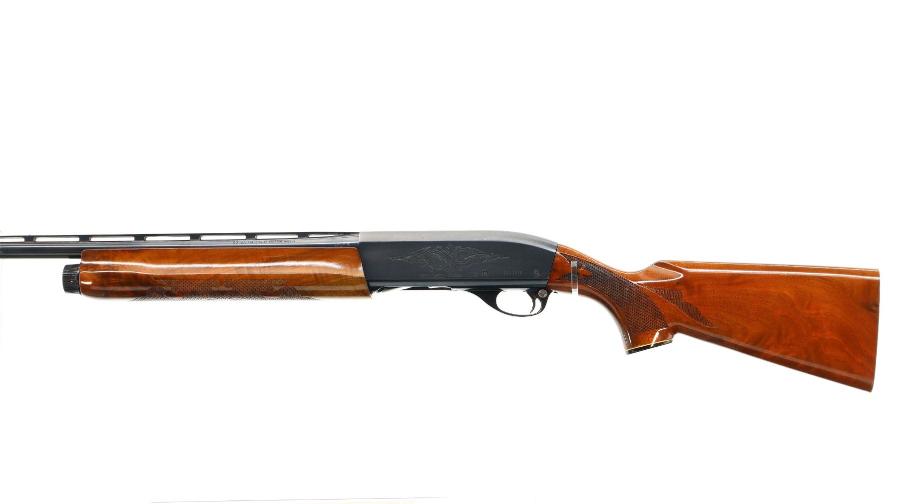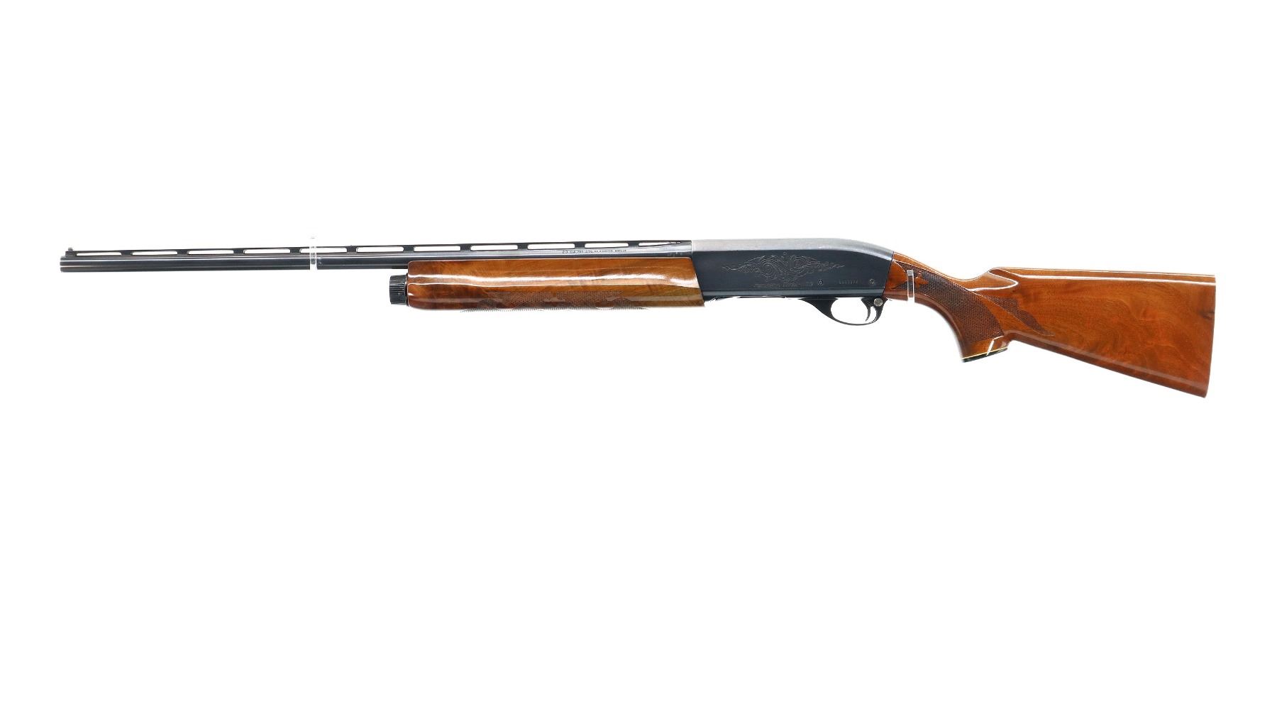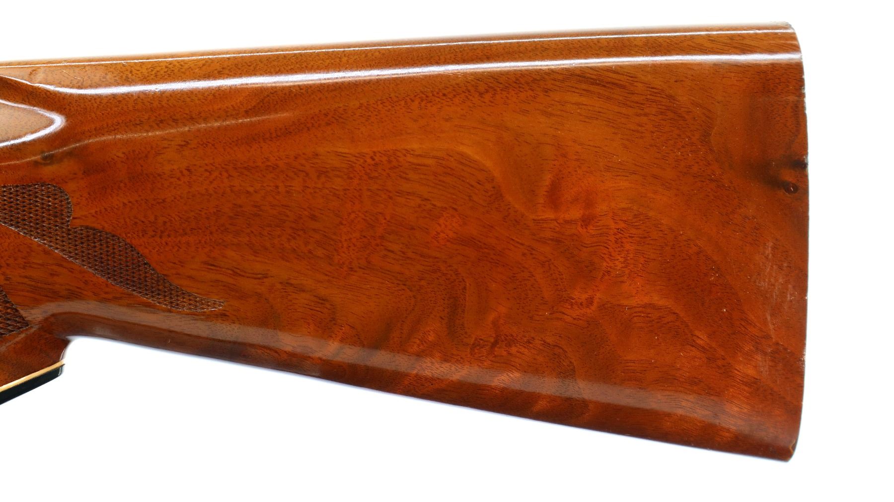 Main Description: White front and silver mid rib beads, blued finish, vent rib, engraved receiver and bolt. Two piece wood stocks, checkered forearm and pistol grip, slip on Limbsaver black rubber recoil pad, 14.5" LOP, missing butt plate and screws. Has a grip cap.