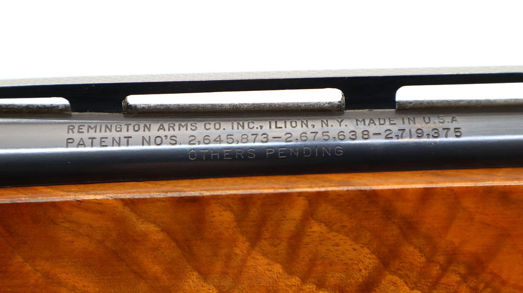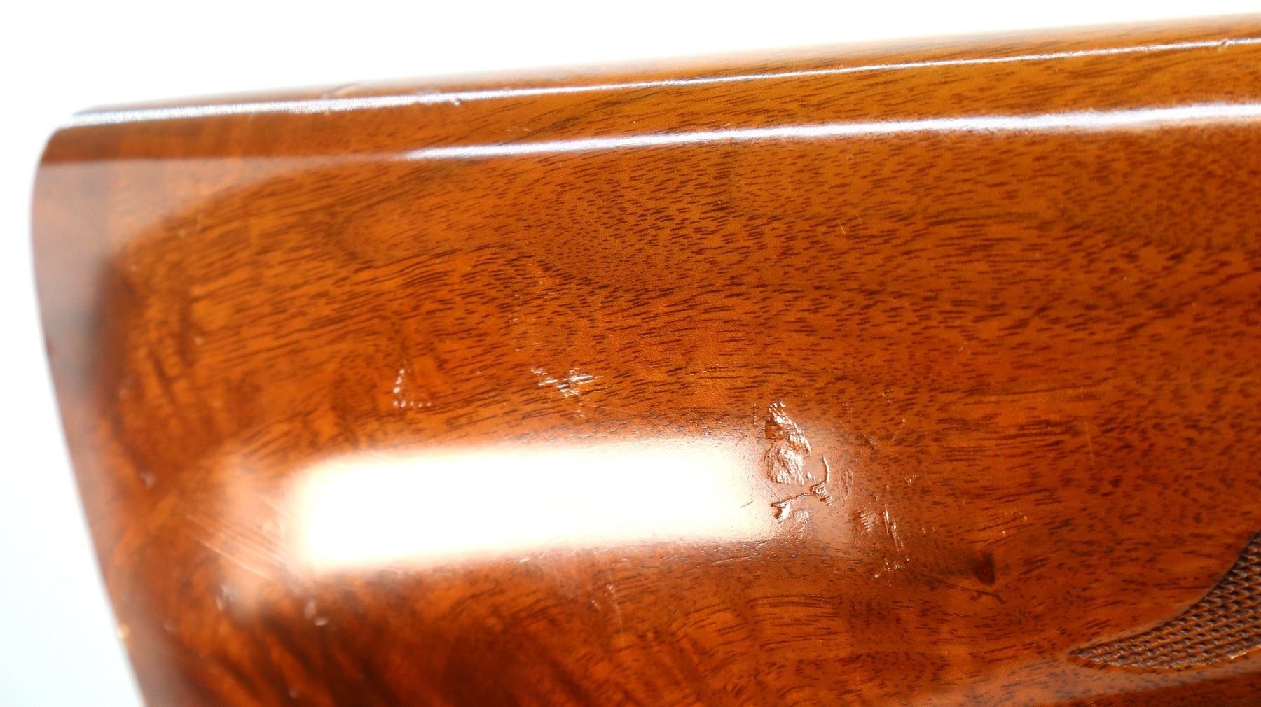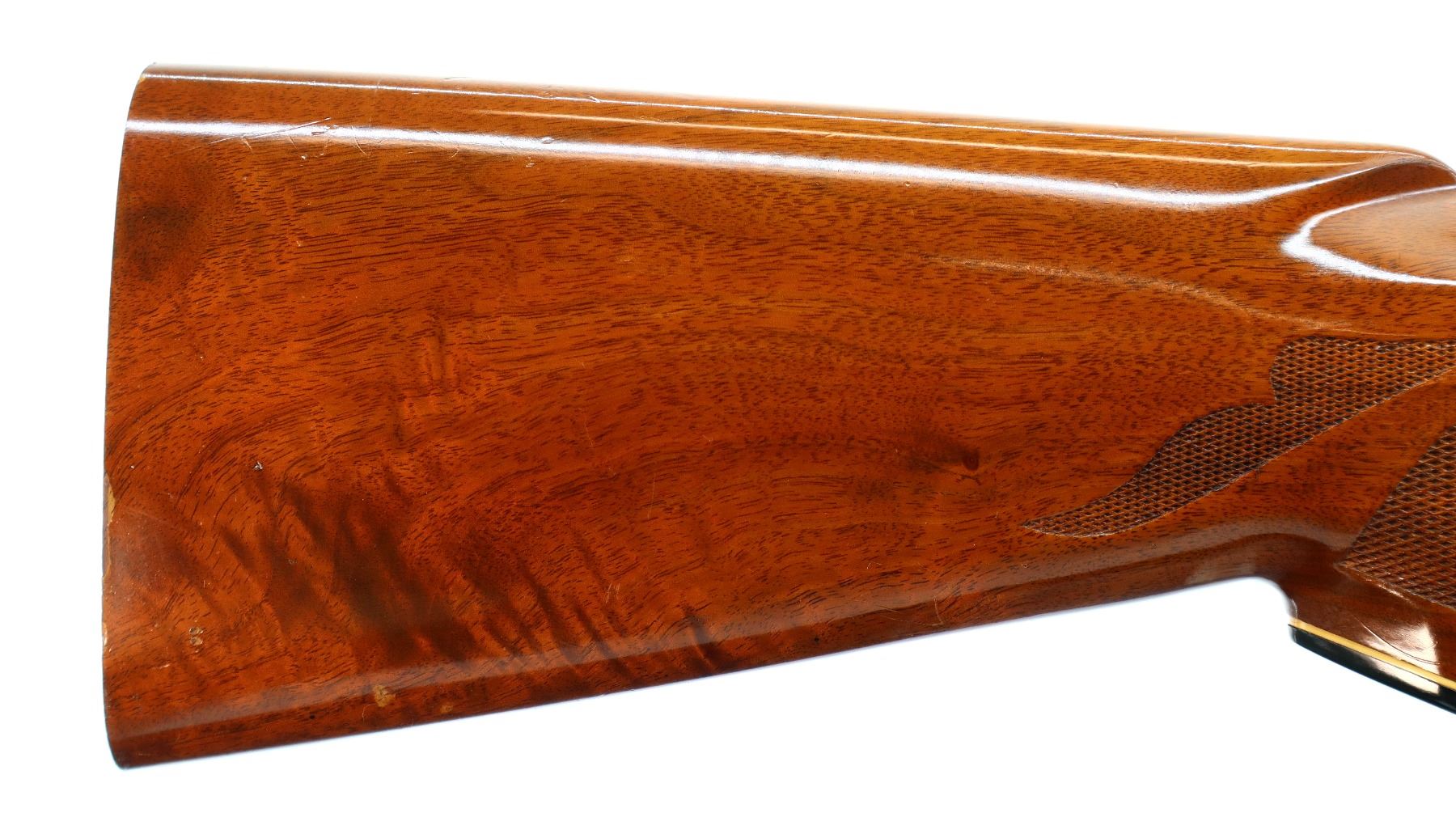 Main Description: White front and silver mid rib beads, blued finish, vent rib, engraved receiver and bolt. Two piece wood stocks, checkered forearm and pistol grip, slip on Limbsaver black rubber recoil pad, 14.5" LOP, missing butt plate and screws. Has a grip cap.