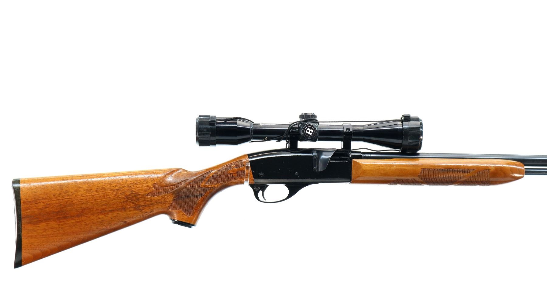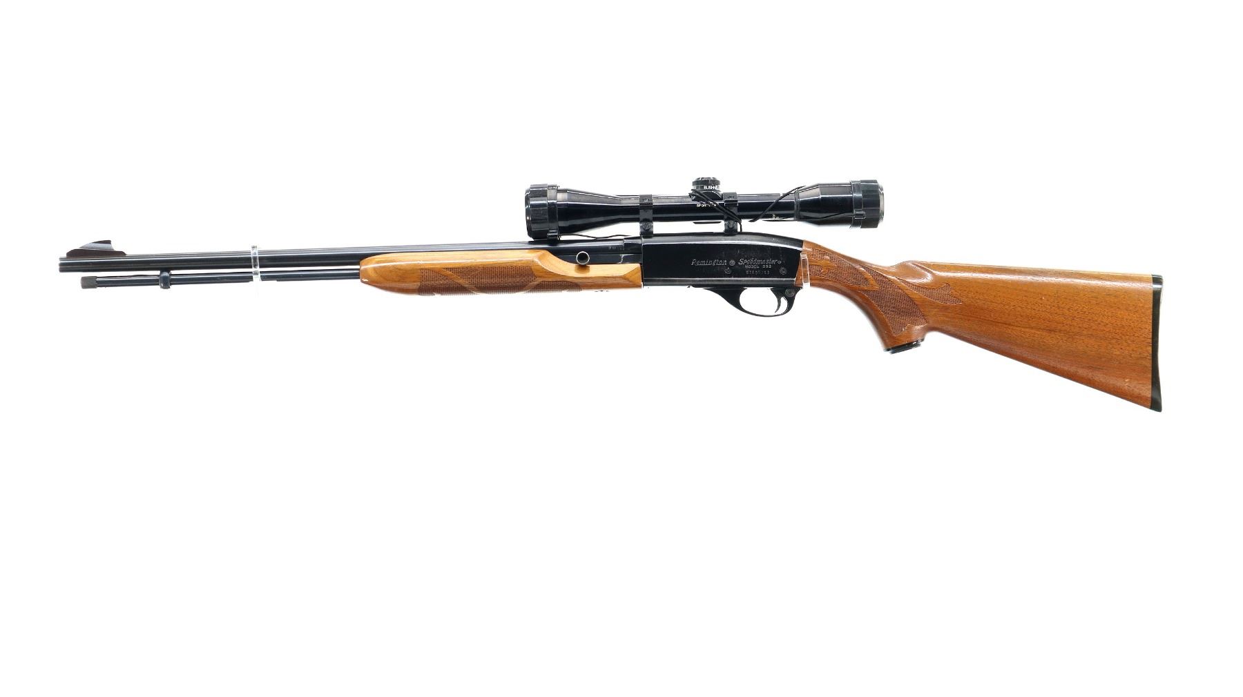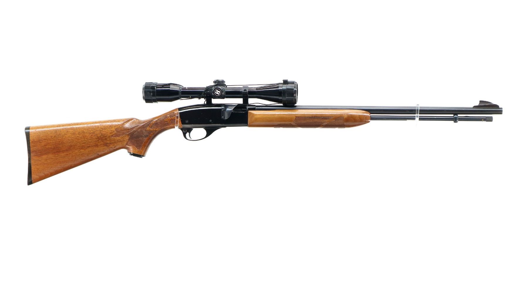 Main Description: Blade front sight with ramp, missing rear sight threaded holes present, blued barrel and outer magtube, grooved black alloy receiver with Bushnell Sportview 4x38 scope installed, clear optics with duplex crosshair. Two piece wood stocks, checkered forearm, pistol grip and black polymer butt plate. Grip cap