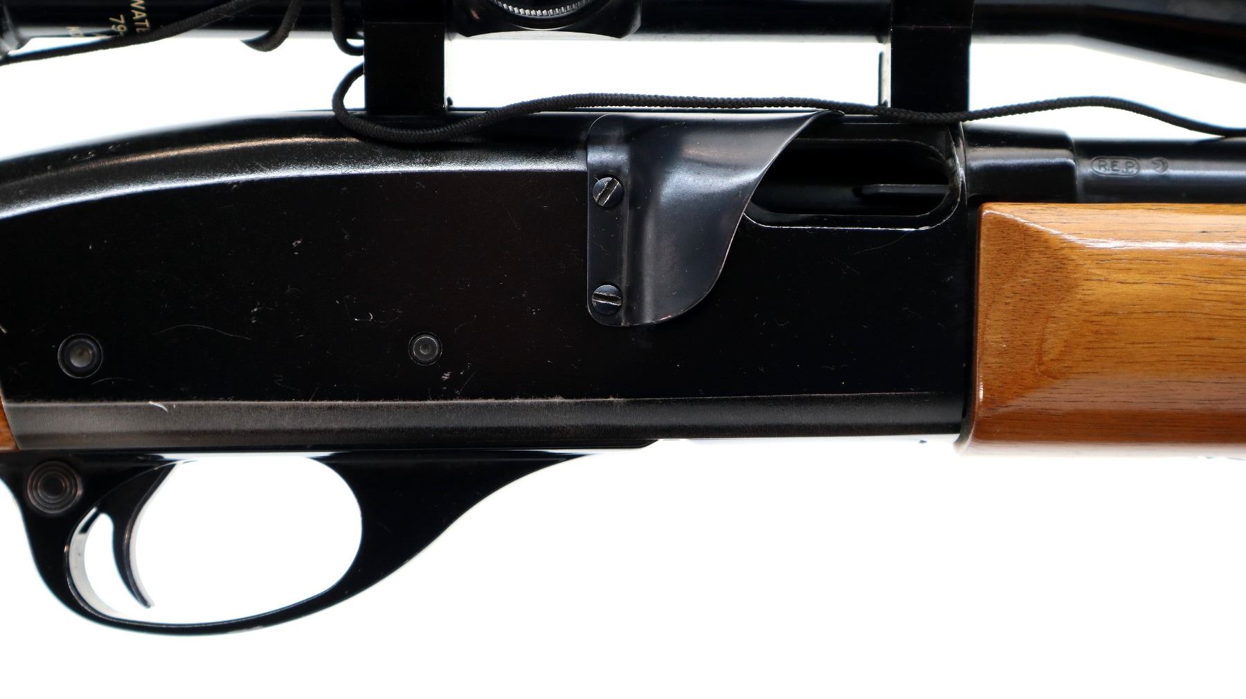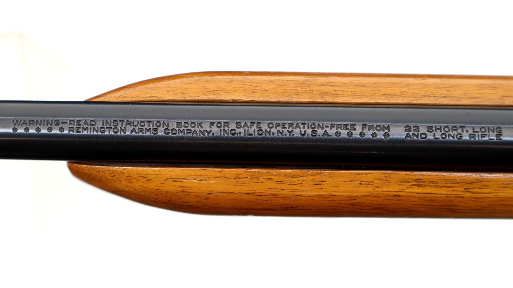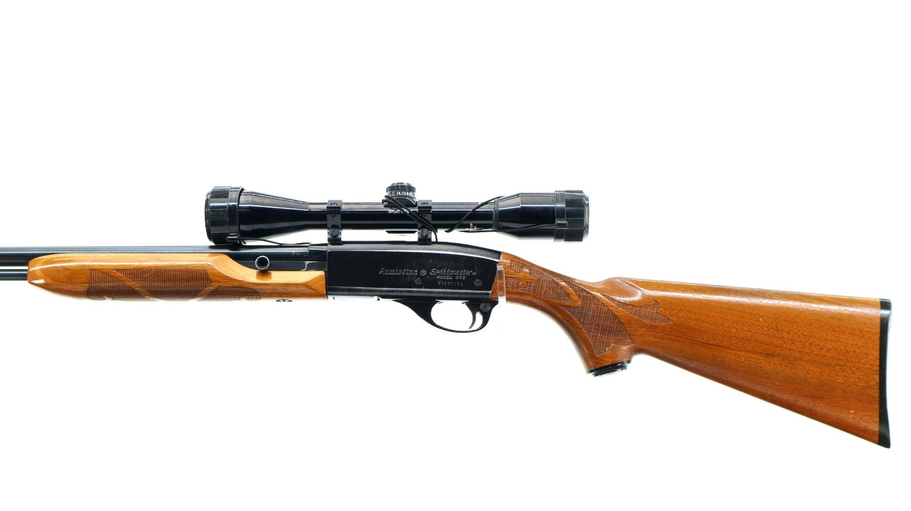 Main Description: Blade front sight with ramp, missing rear sight threaded holes present, blued barrel and outer magtube, grooved black alloy receiver with Bushnell Sportview 4x38 scope installed, clear optics with duplex crosshair. Two piece wood stocks, checkered forearm, pistol grip and black polymer butt plate. Grip cap